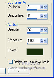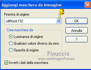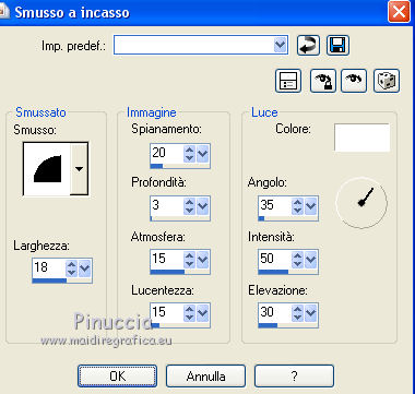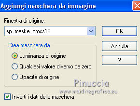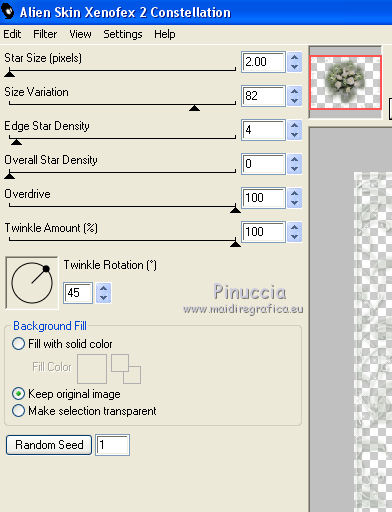 qui puoi trovare qualche risposta ai tuoi dubbi. Se l'argomento che ti interessa non è presente, ti prego di segnalarmelo. Questo tutorial è stato tradotto con CorelX, ma può essere realizzato anche con le altre versioni di PSP. Dalla versione X4, il comando Immagine>Rifletti è stato sostituito con Immagine>Capovolgi in orizzontale, e il comando Immagine>Capovolgi con Immagine>Capovolgi in verticale. Nelle versioni X5 e X6, le funzioni sono state migliorate rendendo disponibile il menu Oggetti. Con la nuova versione X7 sono tornati i comandi Rifletti e Capovolgi, ma con nuove differenze. Vedi la scheda sull'argomento qui Occorrente: Materiale qui Per i tubes grazie Nikita e Colombe. (in questa pagina trovi i links ai loro siti). Filtri: se hai problemi con i filtri, consulta la mia sezione filtri qui Alien Skin Xenofex 2 - Constellation qui FM Tile Tools - Blend Emboss qui Animation Shop qui ![]() Se stai usando altri colori, non esitare a sperimentare le modalità di miscelatura e le opacità dei livelli più adatte. Nelle ultime versioni di PSP non c'è il gradiente di primo piano/sfondo (Corel_06_029) Puoi usare i gradienti delle versioni precedenti. Trovi qui i gradienti Corel X. Apri il font e minimizzalo. Lo troverai nella lista dei font disponibili quando ti servirà. Con i nuovi sistemi operativi, questo non è più possibile. Per usare un font occorre copiarlo nella cartella Font di Windows. Apri le maschere in PSP e minimizzale con il resto del materiale. 1. Imposta il colore di primo piano con #c6d1c1, e il colore di sfondo con #1b310d. ![]() Passa il colore di primo piano a Gradiente di primo piano/sfondo, stile Radiale. ![]() 2. Apri una nuova immagine trasparente 600 x 450 pixels, e riempila con il gradiente.Regola>Sfocatura>Sfocatura gaussiana - raggio 25. ![]() 3. Apri il tube dei mughetti di Nikita e vai a Modifica>Copia. Torna al tuo lavoro e vai a Modifica>Incolla come nuovo livello. Immagine>Ridimensiona, all'85%, tutti i livelli non selezionato. Spostalo a destra.Abbassa l'opacità di questo livello al 35%. Livelli>Duplica. Immagine>Rifletti. 4. Livelli>Nuovo livello raster. Riporta il colore di primo piano a Colore, e riempi il livello con il colore chiaro.5. Livelli>Nuovo livello maschera>Da immagine. Apri il menu sotto la finestra di origine e vedrai la lista dei files aperti. Seleziona la maschera sdtmask_192. ![]() Livelli>Elimina e rispondi sì alla domanda Unire la maschere nel livello corrente. ![]() Livelli>Unisci>Unisci gruppo. Immagine>Ridimensiona, al 106%, tutti i livelli non selezionato. Effetti>Plugins>FM Tile Tools - Blend Emboss, con i settaggi standard. ![]() 6. Livelli>Unisci>Unisci visibile. 7. Apri il tube dei fiori di Colombe e vai a Modifica>Copia. Torna al tuo lavoro e vai a Modifica>Incolla come nuovo livello. Livelli>Duplica. Livelli>Unisci>Unisci giù. Effetti>Effetti 3D>Sfalsa ombra, colore di sfondo #1b310d. ![]() Effetti>Plugins>FM Tile Tools - Blend Emboss. 8. Attiva lo strumento Testo , font Cynthia Script (o quello che preferisci),e scrivi il tuo testo con il colore di sfondo #1b310d. Livelli>Converti in livello raster. Effetti>Effetti 3D>Sfalsa ombra, con i settaggi precedenti. ![]() 9. Imposta il colore di primo piano con il colore bianco. Livelli>Nuovo livello raster. Riempi con il colore bianco.10. Livelli>Nuovo livello maschera>Da immagine. Apri il menu sotto la finestra di origine e vedrai la lista dei files aperti. Seleziona la maschera sp_mask_grosse18. ![]() Livelli>Elimina e rispondi sì alla domanda Unire la maschere nel livello corrente. Livelli>Unisci>Unisci gruppo. Immagine>Ridimensiona, al 103%, tutti i livelli non selezionato. 11. Livelli>Nuovo livello raster. Riempi con il colore di sfondo #1b310d.Selezione>Seleziona tutto. Selezione>Modifica>Contrai - 2 pixels. Premi sulla tastiera il tasto CANC ![]() Selezione>Inverti. Effetti>Effetti 3D>Smusso a incasso. ![]() Selezione>Deseleziona. 12. Firma il tuo lavoro. 13. Attiva il livello della seconda maschera (sp_maske_gross18). e uniscila con il livello del mazzo di fiori. 14. Effetti>Plugins>Alien Skin Xenofex 2. - Constellation. ![]() Modifica>Copia Unione. Apri Animation Shop e vai a Modifica>Incolla>Incolla come nuova animazione. 14. Torna in PSP. Modifica>Annulla azione Constellation. Ripeti l'Effetto Constellation, con gli stessi settaggi, ma cliccando una volta su Random Seed. Modifica>Copia Unione. Torna in Animation Shop e vai a Modifica>Incolla>Incolla dopo il fotogramma corrente. 15. Di nuovo in PSP. Modifica>Annulla azione Constellation. Ripeti l'Effetto Constellation, clicca su Random Seed e ok. Modifica>Copia Unione. In Animation Shop: Modifica>Incolla>Incolla dopo il fotogramma corrente. Controlla il risultato cliccando su Visualizza e salva in formato gif.![]() Le vostre versioni. Grazie ![]() Vincent ![]() Puoi scrivermi per qualsiasi motivo - problemi, dubbi, un link non funzionante - o anche soltanto per un saluto 29 Aprile 2017 |