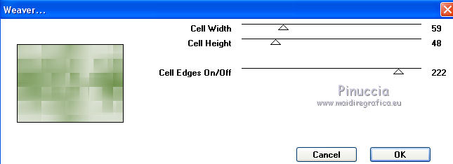 qui puoi trovare qualche risposta ai tuoi dubbi. Se l'argomento che ti interessa non è presente, ti prego di segnalarmelo. Questo tutorial è stato tradotto con CorelX, ma può essere realizzato anche con le altre versioni di PSP. Dalla versione X4, il comando Immagine>Rifletti è stato sostituito con Immagine>Capovolgi in orizzontale, e il comando Immagine>Capovolgi con Immagine>Capovolgi in verticale. Nelle versioni X5 e X6, le funzioni sono state migliorate rendendo disponibile il menu Oggetti. Con la nuova versione X7 sono tornati i comandi Rifletti e Capovolgi, ma con nuove differenze. Vedi la scheda sull'argomento qui Occorrente: Materiale qui Grazie: per il tube della donna Maryse, per il tube dei mughetti C-Josy (in questa pagina trovi i links ai loro siti). Filtri: se hai problemi con i filtri, consulta la mia sezione filtri qui Filters Unlimited 2.0 qui Alien Skin Xenofex 2 - Constellation qui FM Tile Tools - Blend Emboss qui Simple - 4 Way Average, Pizza Slice Mirror qui Toadies - Weaver qui I filtri Simple e Toadies si possono usare da soli o importati in Filters Unlimited (come fare vedi qui) Se un filtro fornito appare con questa icona Animation Shop qui ![]() Se stai usando altri colori, non esitare a sperimentare le modalità di miscelatura e le opacità dei livelli più adatte. Nelle ultime versioni di PSP non c'è il gradiente di primo piano/sfondo (Corel_06_029) Puoi usare i gradienti delle versioni precedenti. Trovi qui i gradienti Corel X. Apri il font e minimizzalo. Lo troverai nella lista dei font disponibili quando ti servirà. Con i nuovi sistemi operativi, questo non è più possibile. Per usare un font occorre copiarlo nella cartella Font di Windows. Metti la maschera nella cartella Maschere. 1. Imposta il colore di primo piano con #e2e6dc, e il colore di sfondo con #678d43. ![]() Passa il colore di primo piano a Gradiente di primo piano/sfondo, stile Lineare. ![]() 2. Apri una nuova immagine trasparente 750 x 550 pixels, e riempila con il gradiente.3. Regola>Sfocatura>Sfocatura gaussiana - raggio 20. ![]() 4. Effetti>Effetti di immagine>Motivo unico, con i settaggi standard. ![]() Effetti>Effetti di bordo>Aumenta. 5. Livelli>Duplica. Effetti>Plugins>Simple - 4Way Average. Effetti>Effetti di bordo>Aumenta. 6. Effetti>Plugins>Simple - Pizza Slice Mirror. Ripeti Pizza Slice Mirror. Abbassa l'opacità di questo livello al 75%. ![]() 7. Livelli>Duplica. Immagine>Rifletti. Immagine>Capovolgi. 8. Effetti>Plugins>Toadies - Weaver, con i settaggi standard. ![]() Abbassa l'opacità di questo livello al 50%. ![]() 9. Effetti>Plugins>FM Tile Tools - Blend Emboss, con i settaggi standard. ![]() Regola>Messa a fuoco>Metti a fuoco. 10. Livelli>Nuovo livello raster. Cambia i settaggi del gradiente, stile Radiale. ![]() Riempi il livello con il gradiente.Regola>Sfocatura>Sfocatura gaussiana - raggio 20. ![]() 11. Livelli>Carica/Salva maschera>Carica maschera da disco. Cerca e carica la maschera ssa_maske_gross8. ![]() Livelli>Unisci>Unisci gruppo. Effetti>Effetti di bordo>Aumenta. 12. Effetti>Effetti 3D>Sfalsa ombra, con il colore di sfondo. ![]() Modifica>Ripeti Sfalsa ombra. 13. Apri il tube dei mughetti e vai a Modifica>Copia. Torna al tuo lavoro e vai a Modifica>Incolla come nuovo livello. Immagine>Ridimensiona, al 50%, tutti i livelli non selezionato. Regola>Messa a fuoco>Metti a fuoco. Lascia il tube come sta: ![]() 14. Immagine>Aggiungi bordatura, 2 pixels, simmetriche, colore di sfondo #678d43. Modifica>Copia. 16. Selezione>Seleziona tutto. Immagine>Aggiungi bordatura, 45 pixels, simmetriche, colore di primo piano #e2e6dc. 17. Effetti>Effetti 3D>Sfalsa ombra, colore nero. ![]() Ripeti l'Effetto Sfalsa ombra, cambiando verticale e orizzontale con -5. 18. Selezione>Inverti. Modifica>Incolla nella selezione. 19. Regola>Sfocatura>Sfocatura gaussiana - raggio 10. ![]() 20. Effetti>Effetti tecniche di disegno>Pennellate - colore di sfondo. ![]() Selezione>Deseleziona. 21. Immagine>Aggiungi bordatura, 1 pixel, simmetriche, colore di sfondo #678d43. 22. Apri il tube della donna e vai a Modifica>Copia. Torna al tuo lavoro e vai a Modifica>Incolla come nuovo livello. Immagine>Ridimensiona, se e quanto necessario, tutti i livelli non selezionato. Regola>Messa a fuoco>Metti a fuoco. Spostalo a sinistra.23. Effetti>Effetti 3D>Sfalsa ombra, colore nero. ![]() 24. Attiva lo strumento Testo , font LisbonScript,imposta il colore di sfondo con il colore bianco e scrivi "Un brin de Bonheur", o quello che preferisci. (regola la dimensione in base al testo e alla versione di PSP che stai usando). Livelli>Converti in livello Raster. Effetti>Effetti 3D>Sfalsa ombra, a scelta. 25. Firma il tuo lavoro su un nuovo livello. 26. Attiva il livello inferiore (Uniti). Effetti>Plugins>Alien Skin Xenofex 2 - Constellation. ![]() Modifica>Copia Unione. Apri Animation Shop e vai a Modifica>Incolla>Incolla come nuova animazione. 27. Torna in PSP. Modifica>Annulla azione Constellation. Ripeti l'Effetto Constellation, con gli stessi settaggi, ma cliccando una volta su Random Seed. Modifica>Copia Unione. Torna in Animation Shop e vai a Modifica>Incolla>Incolla dopo il fotogramma corrente. 28. Di nuovo in PSP. Modifica>Annulla azione Constellation. Ripeti l'Effetto Constellation, clicca su Random Seed e ok. Modifica>Copia Unione. In Animation Shop: Modifica>Incolla>Incolla dopo il fotogramma corrente. Controlla il risultato cliccando su Visualizza e salva in formato gif.![]() Le vostre versioni. Grazie ![]() Giovanni ![]() Annuska ![]() Puoi scrivermi per qualsiasi motivo - problemi, dubbi, un link non funzionante - o anche soltanto per un saluto 29 Aprile 2017 |