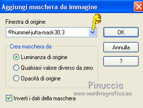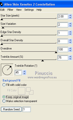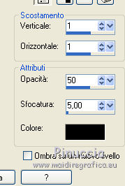 qui puoi trovare qualche risposta ai tuoi dubbi. Se l'argomento che ti interessa non è presente, ti prego di segnalarmelo. Questo tutorial è stato tradotto con CorelX, ma può essere realizzato anche con le altre versioni di PSP. Dalla versione X4, il comando Immagine>Rifletti è stato sostituito con Immagine>Capovolgi in orizzontale, e il comando Immagine>Capovolgi con Immagine>Capovolgi in verticale. Nelle versioni X5 e X6, le funzioni sono state migliorate rendendo disponibile il menu Oggetti. Con la nuova versione X7 sono tornati i comandi Rifletti e Capovolgi, ma con nuove differenze. Vedi la scheda sull'argomento qui Occorrente: Materiale qui Per i tube grazie Tocha, Beatriz e kTs. Filtri: se hai problemi con i filtri, consulta la mia sezione filtri qui Filters Unlimited 2.0 qui Graphics Plus - Cross Shadow qui FM Tile Tools - Blend Emboss qui Alien Skin Xenofex 2 - Constellation qui Alien Skin Eye Candy 5 Impact - Perspective Shadow qui I filtri Graphics Plus si possono usare da soli o importati in Filters Unlimited (come fare vedi qui) Se un filtro fornito appare con questa icona A volte si possono ottenere risultati differenti. ![]() Se stai usando altri colori, non esitare a sperimentare le modalità di miscelatura e le opacità dei livelli più adatte. Apri la maschera in PSP e minimizzala con il resto del materiale. 1. Apri una nuova immagine trasparente 750 x 550 pixels. 2. Selezione>Seleziona tutto. Apri il tube dell'ombrello e vai a Modifica>Copia. Torna al tuo lavoro e vai a Modifica>Incolla nella selezione. Selezione>Deseleziona. 3. Effetti>Effetti di immagine>Motivo unico, con i settaggi standard. ![]() 4. Livelli>Duplica. Immagine>Capovolgi. Cambia la modalità di miscelatura di questo livello in Sovrapponi, e abbassa l'opacità all'84%. 5. Livelli>Unisci>Unisci tutto. Regola>Messa a fuoco>Metti a fuoco. 6. Imposta il colore di primo piano con #e0d9d7. Livelli>Nuovo livello raster. Riempi il livello con il colore di primo piano #e0d9d7.7. Livelli>Nuovo livello maschera>Da immagine. Apri il menu sotto la finestra di origine e vedrai la lista dei files aperti. Seleziona la maschera ©hummel-jutta-mask30.3. ![]() Livelli>Unisci>Unisci gruppo. 8. Effetti>Plugins>FM Tile Tools - Blend Emboss, con i settaggi standard. ![]() Regola>Messa a fuoco>Metti a fuoco. Effetti>Effetti 3D>Sfalsa ombra. ![]() 9. Apri il tube della coppia e vai a Modifica>Copia. Torna al tuo lavoro e vai a Modifica>incolla come nuovo livello. Immagine>Ridimensiona, una volta al 70% e una volta all'80%, tutti i livelli non selezionato. Regola>Messa a fuoco>Metti a fuoco. Sposta il tube a sinistra.10. Effetti>Plugins>Alien Skin Eye Candy 5 Impact - Perspective Shadow. Seleziona il preset Drop Shadow Blurry e ok. ![]() 11. Apri il wordart e vai a Modifica>Copia. Torna al tuo lavoro e vai a Modifica>incolla come nuovo livello. Immagine>Ridimensiona, 2 volte all'85%, tutti i livelli non selezionato. Regola>Messa a fuoco>Metti a fuoco. 12. Effetti>Effetti 3D>Sfalsa ombra, colore nero. ![]() 13. Effetti>Plugins>Graphics Plus - Cross Shadow. ![]() 14. Firma il tuo lavoro. Se non vuoi realizzare l'animazione: Livelli>Unisci>Unisci tutto e salva in formato jpg. 15. Se vuoi creare l'animazione, non unire i livelli, e attiva il livello della maschera. 16. Effetti>Plugins>Alien Skin Xenofex 2 - Constellation. ![]() 17. Modifica>Copia Unione. Apri Animation Shop e vai a Modifica>Incolla>Incolla come nuova animazione. 18. Torna in PSP. Modifica>Annulla azione Constellation. Effetti>Plugins>Alien Skin Xenofex 2 - Constellation, clicca su Random Seed e ok. Modifica>Copia Unione. Torna in Animation Shop e vai a Modifica>Incolla>Incolla dopo il fotogramma corrente. 19. Di nuovo in PSP. Modifica>Annulla azione Constellation. Effetti>Plugins>Alien Skin Xenofex 2 - Constellation, clicca su Random Seed e ok. Modifica>Copia Unione. In Animation Shop: Modifica>Incolla>Incolla dopo il fotogramma corrente. 20. Ripeti ancora una volta il punto 19, e in Animation Shop avrai una animazione composta da 4 fotogrammi. Clicca sul primo fotogramma per selezionarlo e vai a Modifica>Seleziona tutto. 21. Apri la gif patriciabling43, anche questa composta da 4 fotogrammi. Modifica>Seleziona tutto. Modifica>Copia. Attiva il tuo lavoro e vai a Modifica>Incolla>Incolla nel fotogramma selezionato. Posiziona la gif dove preferisci o, come nel mio esempio, in alto a destra. Controlla il tuo lavoro cliccando su Visualizza e salva in formato gif.Il tube di questo esempio è di Min@ ![]() ![]() Puoi scrivermi per qualsiasi motivo - problemi, dubbi, un link non funzionante - o anche soltanto per un saluto 25 Gennaio 2016 |