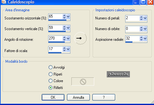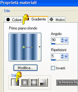 qui puoi trovare qualche risposta ai tuoi dubbi. Se l'argomento che ti interessa non è presente, ti prego di segnalarmelo. Questo tutorial è stato creato con PSP X. Occorrente: Tube Angel qui Filtro: Simple qui 1. Apri il tube in PSP X, duplicalo (Shift+D) e chiudi l'originale. 2. Posizionati sul livello "SKF-Angel" e vai a Modifica>Copia. 3. Imposta un colore chiaro come colore di primo piano (io ho scelto #bcd4f4) e un colore scuro come colore di sfondo (io ho scelto #264e7a). Passa il colore di primo piano a gradiente di primo piano/sfondo, stile lineare: ![]() 4. Apri una nuova immagine trasparente 500 x 500 pixels. Riempila con questo gradiente.5. Effetti>Effetti di riflesso>fuga di specchi: ![]() 6. Effetti>Effetti di riflesso>Caleidoscopio. ![]() 7. Effetti>Plugins>Filtro Simple / Pizza Slice Mirror. 8. Effetti>Effetti di bordo>Aumenta. 9. Modifica>Incolla come nuovo livello. (Psp ha conservato in memoria l'azione "Modifica>Copia" del passo 2). 10. Regola>Messa a fuoco>Messa a fuoco passaggio alto: ![]() 11. Immagine>Aggiungi bordatura, 1 pixel, simmetriche, con il colore di sfondo. 12. Immagine>Aggiungi bordatura, 1 pixel, simmetriche, con il colore di primo piano. 13. Immagine>Aggiungi bordatura, 2 pixels, simmetriche, con il colore di sfondo. Livelli>Unisci>Unisci tutto. La tag è finita. Non dimenticare di firmarla e salva in formato jpg.