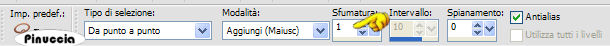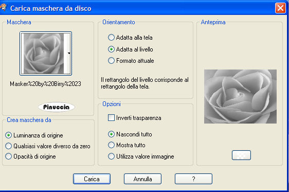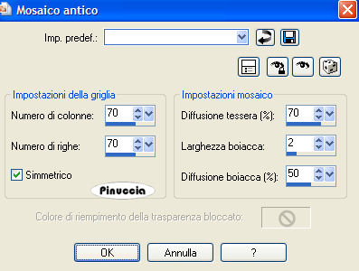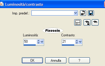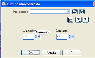 qui puoi trovare qualche risposta ai tuoi dubbi. Se l'argomento che ti interessa non è presente, ti prego di segnalarmelo. Questo tutorial è stato scritto in PSP 9, ma può essere eseguito con qualsiasi versione del programma. Occorrente: Materiale qui Metti la maschera nella cartella Maschere di PSP. Metti il pennello nella cartella Pennelli di PSP. I tubes che ho usato sono di Jolanda e Marif e di gruppi di share. Rispetta il lavoro degli autori e mantieni i files al loro stato originale. 1. Apri una nuova immagine trasparente 600 x 450 pixels. Imposta il colore di primo piano con #a1c5e1, e il colore di sfondo con #538ec0. Livelli>Nuovo livello raster. Riempi con il colore di primo piano.Livelli>Nuovo livello raster. Riempi con il colore di sfondo.per riempire con il colore di sfondo, devi cliccare con il tasto destro del mouse. Livelli>Carica/Salva maschera>Carica maschera da disco. Cerca e carica la maschera Birry2023: ![]() Livelli>Elimina, e rispondi sì alla domanda Unire la maschera nel livello corrente?. ![]() Livelli>Unisci>Unisci gruppo. 2. Apri il tube misted-Paris- by- night, e vai a Modifica>Copia. Torna al tuo lavoro e vai a Modifica>Incolla>Incolla come nuovo livello. Immagine>Rifletti. Sposta il tube in basso.Cambia la modalità di miscelatura di questo livello in Luminanza (esistente). Livelli>Unisci>Unisci tutto. ![]() Copia questa immagine: Modifica>Copia. Modifica>Incolla>Incolla come nuova IMMAGINE, e minimizzala. Ti servirà più tardi. Torna al tuo lavoro. Effetti>Effetti di trama>Mosaico antico, con i seguenti settaggi: ![]() Immagine>Aggiungi bordatura, 3 pixels, simmetriche, con il colore #ab0b0b. Apri l'immagine che hai messo minimizzato prima. Immagine>Aggiungi bordatura, 2 pixels, simmetriche, con il colore #ab0b0b. Modifica>Copia. Ritorna al tuo lavoro (l'immagine con l'effetto mosaico antico), e vai a Modifica>Incolla>Incolla come nuovo livello. Immagine>Ridimensiona, all'80%, tutti i livelli non selezionato. ![]() 3. Apri il tube lace2f. Immagine>Ridimensiona, all'80%. Modifica>Copia. Torna al tuo lavoro e vai a Modifica>Incolla>Incolla come nuovo livello. Regola>Messa a fuoco>Metti a fuoco. Effetti>Effetti 3D>Sfalsa ombra, con i seguenti settaggi: ![]() Spostalo in alto a sinistra sul bordino rosso.Livelli>Duplica. Immagine>Capovolgi. Sistema i due merletti in modo che si fondano piacevolmente.![]() Livelli>Unisci>Unisci giù. Livelli>Disponi>Sposta giù. Livelli>Duplica. Immagine>Rifletti. Livelli>Duplica. Immagine>Ruota>Ruota per gradi, 90 gradi a destra. ![]() Posizionalo in alto, come nell'esempio.Livelli>Duplica. Immagine>Capovolgi. ![]() 4. Nella paletta dei livelli attiva il livello superiore. Apri il tube Marif-face-0130, e vai a Modifica>Copia. Torna al tuo lavoro e vai a Modifica>Incolla>Incolla come nuovo livello. Immagine>Ridimensiona, all'80%, tutti i livelli non selezionato. Ripeti Immagine>Ridimensiona, all'86%. Se tutto è andato bene, il tube dovrebbe avere la stessa altezza dell'immagine centrale. Sposta il viso contro il bordo a sinistra.Regola>Saturazione e tonalità>Viraggio, con i seguenti settaggi: ![]() Apri il tube Loulou by Jolanda e vai a Modifica>Copia. Torna al tuo lavoro e vai a Modifica>Incolla>Incolla come nuovo livello. Immagine>Ridimensiona, al 70%, tutti i livelli non selezionato, 2 volte. Sposta questo tube in basso a destra.Effetti>Effetti 3D>Sfalsa ombra, con i seguenti settaggi. ![]() Livelli>Unisci>Unisci tutto. Aggiungi il tuo nome e/o il tuo watermark e hai finito. ![]() un consiglio: prima di continuare l'animazione, salva il tuo lavoro. Nel caso qualcosa non funzionasse e volessi rifare la parte successiva, ti sarà più semplice ricominciare. Se vuoi creare l'animazione, continua. 5. Attiva lo strumento Selezione a mano libera , punto a punto, con i seguenti settaggi:![]() Seleziona l'area dei lampioni. ![]() Livelli>Duplica, e ripeti. Adesso hai tre livelli. Mantieni selezionato e attiva nella paletta dei livelli il livello superiore. Regola>Luminosità e contrasto>Luminosità e contrasto, con i seguenti settaggi: ![]() Nella paletta dei livelli attiva adesso il livello di centro. Regola>Luminosità e contrasto>Luminosità e contrasto: ![]() Selezione>Nessuna selezione. 6. Attiva nuovamente il livello superiore, e chiudi i due livelli inferiori. Attiva lo strumento Pennello ![]() cerca e seleziona il pennello Ster Wit, scala 25. Applica 1 o due stelline sull'immagine. Chiudi questo livello e apri il livello centrale. Applica una o due stelline, ma su posizioni diverse. Ripeti sul livello inferiore. Apri nuovamente i livelli (Livelli>Visualizza>Tutto). Salva in formato psp. 7. Apri Animation Shop. Apri il file che hai appena salvato e controlla la tua animazione cliccando su Visualizza ![]() Se trovi che il lampeggiamento delle stelle sia troppo veloce, via a Modifica>Seleziona tutto, e poi Animazione>Proprietà fotogramma, e imposta un valore superiore. Più sarà alto il valore, più lenta sarà l'animazione. Quando sei soddisfatto, salva in formato gif. ![]() Se hai problemi o dubbi, o trovi un link non funzionante, o anche soltanto per un saluto, scrivimi. 27 Luglio 2007 |