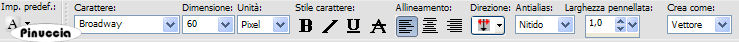 qui puoi trovare qualche risposta ai tuoi dubbi. Se l'argomento che ti interessa non è presente, ti prego di segnalarmelo. Occorrente: Materiale qui I tubes che ho usato sono di Gini, Filly e Molly. Rispetta il loro lavoro e mantieni i tubes al loro stato originale. 1. Apri una nuova immagine trasparente 600 x 450 pixels. Selezione>Seleziona tutto. Apri il template City e vai a Modifica>Copia. Torna alla tua immagine trasparente e vai a Modifica>Incolla>Incolla nella selezione. Selezione>Nessuna selezione. Apri il tube "moon-005-molly" e vai a Modifica>Copia. Torna al tuo lavoro e vai a Modifica>Incolla>Incolla come nuovo livello. Spostalo più o meno al centro della linea nera,in modo che non si veda la separazione tra la parte nera e quella bruna. Nella paletta dei livelli abbassa l'opacità di questo livello al 40%. Attiva lo strumento Gomma , dimensione 20, e cancella la parte della luna che si trova sulla parte bruna. Apri il tube Gold City e vai a Modifica>copia. Torna al tuo lavoro e vai a Modifica>Incolla>Incolla come nuovo livello. Posizionalo al centro.2. Apri il tube Misted Filly (1173)scenary, e vai a Modifica>Copia. Posizionalo al centro in modo che si sovrapponga con la linea d'acqua.Apri il tube Terry-old fashion Hat. Immagine>Rifletti. Modifica>Copia. Torna al tuo lavoro e vai a Modifica>Incolla>Incolla come nuovo livello. Spostalo a destra, ma non completamente contro il bordo.![]() 3. Imposta il colore di primo piano con il nero e il colore di sfondo con c0ae7e. Attiva lo strumento Testo , font Broadway, dimensione 60,pennellata 1, crea come vettore. ![]() Scrivi "Love my city" e usa i nodi vettori per "tirare" la scritta per tutta la larghezza dell'immagine, eventualmente anche per alzarla. ![]() Livelli>Converti livello raster. Abbassa l'opacità di questo livello al 30%. eventualmente, se la scritta dovesse coprire il cappello della donna, sposta il livello del testo sotto quello del tube. Se sei soddisfatto, vai a Livelli>Unisci>Unisci tutto. Aggiungi il tuo nome e/o il tuo watermark. Imposta il colore di primo piano con il motivo oro Goldbeads. se non l'hai clicca qui ![]() Imposta il colore di sfondo con il nero. Immagine>Aggiungi bordatura, 2 pixels, simmetriche, con il colore nero. Immagine>Aggiungi bordatura, 4 pixels, simmetriche, con un colore qualsiasi purchè non presente nell'immagine. Seleziona questo bordo con la bacchetta magica ![]() ![]() e riempilo con il motivo Goldbeads.Selezione>Nessuna selezione. Immagine>Aggiungi bordatura, 2 pixels, simmetriche, con il colore nero. ![]() 4. Modifica>Copia. Apri Animation Shop. Clicca con il tasto destro del mouse sullo spazio vuoto e Incolla come nuova animazione. ![]() Modifica>Duplica e ripeti finchè non avrai ottenuto 5 fotogrammi. Clicca sul primo fotogramma per selezionarlo e vai a Modifica>Seleziona tutto. Apri l'animazione lighthousebeacon. Come vedrai, questa animazione è composta da 5 fotogrammi. Clicca sul primo fotogramma per selezionarlo e vai a Modifica>Seleziona tutto, e poi Modifica>Copia. Torna al tuo lavoro e vai a Modifica>Incolla>Incolla nel fotogramma selezionato. Cerca la posizione corretta e, quando sei certo di averla trovata rilascia il tasto del mouse. Apri ora l'animazione Gold star. ha 4 fotogrammi, invece che 5, ma data la ridottissima dimensione del file, la mancanza di un fotogramma non si noterà. Clicca sul primo fotogramma per selezionarlo e vai a Modifica>Seleziona tutto e poi Modifica>Copia. Torna al tuo lavoro e vai a Modifica>Incolla>Incolla nel fotogramma selezionato, e ripeti per quanto volte vuoi posizionando l'animazione sui vari edifici dello scenario. Quando hai finito, controlla il tuo risultato cliccando su Visualizza .Ti sembra un po' troppo veloce? Il lavoro dovrebbe essere ancora selezionato. Comunque nel dubbio vai a Modifica>Seleziona tutto, e poi Animazione>Proprietà fotogramma, e imposta la velocità a 20. ![]() Salva in formato gif. ![]() Se hai problemi o dubbi, o trovi un link non funzionante, o anche soltanto per un saluto, scrivimi. 27 Luglio 2007 |