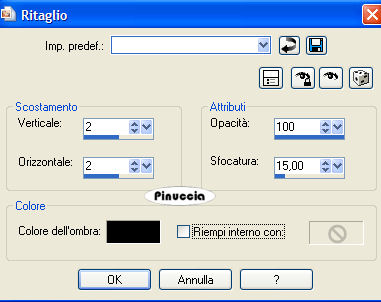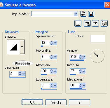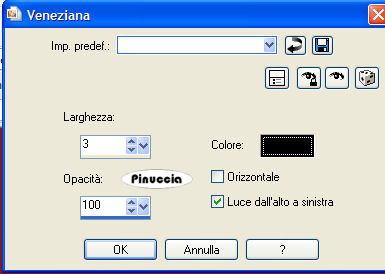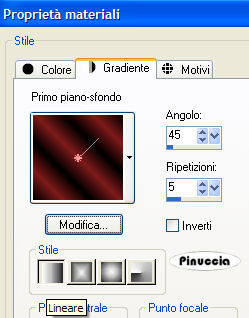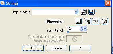 qui puoi trovare qualche risposta ai tuoi dubbi. Se l'argomento che ti interessa non è presente, ti prego di segnalarmelo. Questo tutorial è stato scritto in PSP 9, ma può essere eseguito con qualsiasi versione del programma. I tubes che ho usato sono di Patry - Daisyweb - Nightangel - Sassy e di gruppi di share. Rispetta il lavoro degli autori e mantieni i tubes al loro stato originale. Materiale qui 1. Apri una nuova immagine trasparente 600 x 500 pixels. 2. Imposta il colore di primo piano con il nero, e il colore di sfondo con #7e1b1b. Passa il colore di primo piano a Gradiente di primo piano/sfondo, con i seguenti settaggi: ![]() 3. Riempi l'immagine trasparente con questo gradiente.4. Apri il tube Rosemusic e vai a Modifica>Copia. Torna al tuo lavoro e vai a Modifica>Incolla>Incolla come nuovo livello. 5. Immagine>Rifletti, e sposta il tube in alto.Abbassa l'opacità di questo livello all'80%. 6. Apri il tube music01, e vai a Modifica>Copia. Torna al tuo lavoro e vai a Modifica>incolla>Incolla come nuovo livello. Spostalo in basso, completamente a sinistra.7. Attiva lo strumento Deformazione ![]() puntatore se stai usando PSP Xe "tira" il tube tutto a destra contro il bordo, in modo che si stenda per tutta la larghezza dell'immagine. ![]() Clicca sulla manina , per liberarti della griglia di deformazione.8. Cambia la modalità di miscelatura di questo livello in Luce diffusa. 9. Apri il tube "Looking Great", e vai a Modifica>Copia. Apri l'immagine "Plaatje 1" e vai a Modifica>Incolla>Incolla come nuovo livello. 10. Livelli>Unisci>Unisci tutto. 11. Attiva lo strumento Ritaglio ,e taglia il bordino dell'immagine. ![]() 12. Immagine>Aggiungi bordatura, 3 pixels, simmetriche, con il colore nero. 13. Copia l'immagine: Modifica>Copia. Ritorna al tuo lavoro, l'immagine 600x500, e vai a Modifica>Incolla>Incolla come nuovo livello. Sposta l'immagine in alto a sinistra.![]() 14. Effetti>Effetti 3D>Sfalsa ombra, con i seguenti settaggi: ![]() 15. Livelli>Duplica. Sposta il duplicato un po' a destra e in basso, sul bordo della tastiera.16. Apri il tube Petitedancer. Immagine>Ridimensiona, all'80%, tutti i livelli non selezionato, 2 volte. 17. Modifica>Copia. Torna al tuo lavoro e vai a Modifica>Incolla>Incolla come nuovo livello. 18. Immagine>Rifletti. Spostalo in alto a destra.Cambia la modalità di miscelatura di questo livello in Luminanza (esistente), e abbassa l'opacità al 50%. ![]() Effetti>Effetti 3D>Sfalsa ombra, con i settaggi precedenti. 19. Apri il tube "Ballet and violin" e vai a Modifica>Copia. Torna al tuo lavoro e vai a Modifica>Incolla>Incolla come nuovo livello. Sposta questo tube in basso a destra.20. Livelli>Unisci>Unisci tutto. 21. Immagine>Ridimensiona, all'85%, ricampionamento bicubica, tutti i livelli selezionato. ![]() 22. Immagine>Aggiungi bordatura, 3 pixels, simmetriche, con il colore nero. 23. Immagine>Aggiungi bordatura, 20 pixels, simmetriche, con il colore #7e1b1b. 24. Seleziona questo bordo con la bacchetta magica ![]() ![]() 25. Effetti>Effetti di trama>Veneziana, con i seguenti settaggi. ![]() 26. Effetti>Effetti 3D>Smusso a incasso, con i seguenti settaggi: ![]() 27. Selezione>Inverti. Effetti>Effetti 3D>Ritaglio, con i seguenti settaggi: ![]() 28. Selezione>Nessuna selezione. 29. Immagine>Aggiungi bordatura, 3 pixels, simmetriche, con il colore nero. 30. Apri il tube "Canto" e attiva il livello "Canto 2". Modifica>Copia. Torna al tuo lavoro e vai a Modifica>Incolla>Incolla come nuovo livello. Spostalo nell'angolo in alto sul bordo nero, vedi il mio esempio.31. Livelli>duplica. Immagine>Rifletti. Immagine>Capovolgi. Livelli>Unisci>Unisci tutto. 32. Aggiungi il tuo nome e/o il tuo watermark e - se vuoi- anche un testo. 33. Attiva lo strumento Selezione a mano libera , da punto a punto,e seleziona attentamente il gonnellino della bambina, (doppio clic quando hai completato il perimetro della gonna, per chiudere la selezione). ![]() Mantieni selezionato. 34. Livelli>Duplica, 2 volte, in modo da avere 3 livelli. 35. Attiva il livello superiore. 36. Effetti>Effetti di distorsione/Stringi: ![]() 37. Attiva il livello di centro. Effetti>Effetti di distorsione/Stringi, con il settaggio a 17. 38. Selezione>Nessuna selezione. 39. Attiva nuovamente il livello superiore e vai a Modifica>Copia. Apri Animation Shop. Clicca con il tasto destro del mouse sullo spazio vuoto e Incolla come nuova animazione. ![]() 40. Torna in PSP. Attiva il livello al centro e vai a Modifica>Copia. Di nuovo in Animation Shop vai a Modifica>Incolla>Incolla dopo il fotogramma corrente. 41. Ancora in PSP. Attiva il livello inferiore e vai a Modifica>Copia. Torna in Animation Shop e vai a Modifica>Incolla>Incolla dopo il fotogramma corrente. Adesso hai una animazione composta da 3 fotogrammi. Clicca sul primo fotogramma per selezionarlo e vai a Modifica>Seleziona tutto. 42. Apri la gif "Zilver sparkles" fornita con il materiale, anche questa composta da tre fotogrammi. Clicca sul primo fotogramma per selezionarlo e vai a Modifica>Seleziona tutto e poi Modifica>Copia. Ritorna al tuo lavoro e vai a Modifica>Incolla>Incolla nel fotogramma selezionato. Posiziona le stelline sul diamante dell'angolo e, quando hai trovato la posizione corretta, rilascia il tasto del mouse. Ripeti Modifica>Incolla>Incolla nel fotogramma selezionato per posizionare le stelline sull'altro angolo. Se vuoi controllare il risultato dell'animazione clicca su Visualizza ![]() Salva in formato gif. ![]() Se hai problemi o dubbi, o trovi un link non funzionante, o anche soltanto per un saluto, scrivimi. 29 Luglio 2007 |