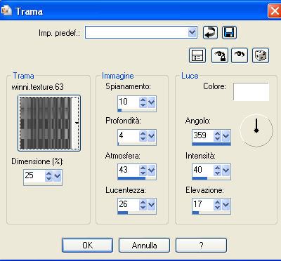 Effetti>Effetti di trama>Trama - seleziona la trama Winni-texture.63 con i seguenti settaggi: