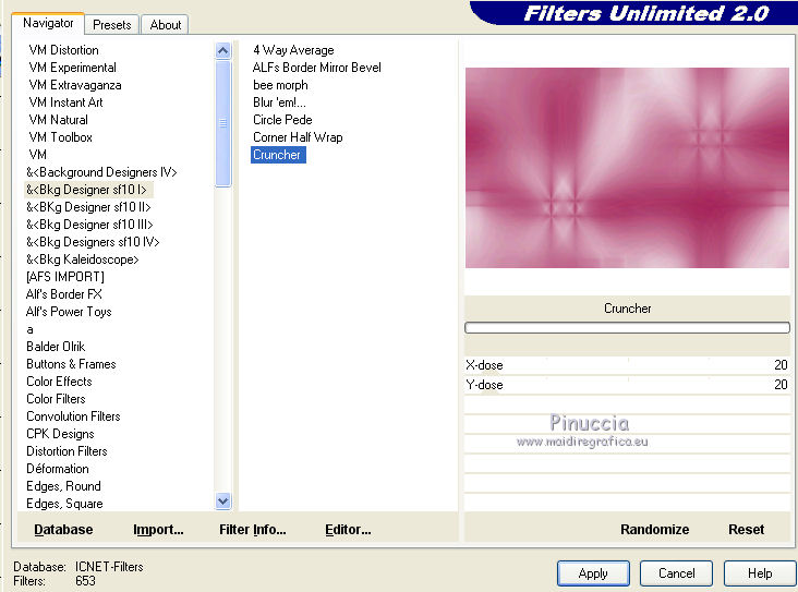 5. Effets>Modules Externes>Filters Unlimited 2.0 - &<Bkg Designer sf10I> - Cruncher, par défaut.