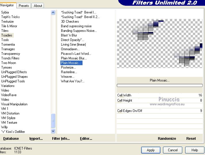 8. Effets>Modules Externes>Filters Unlimited 2.0 - Toadies - Plain Mosaic, par défaut.
