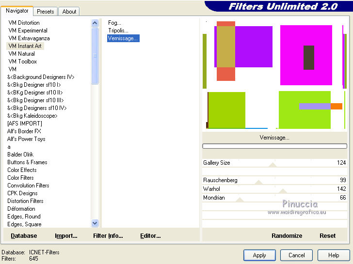 Effets>Modules Externes>Filters Unlimited 2.0 - VM Instant Art - Vernissage, par défaut.