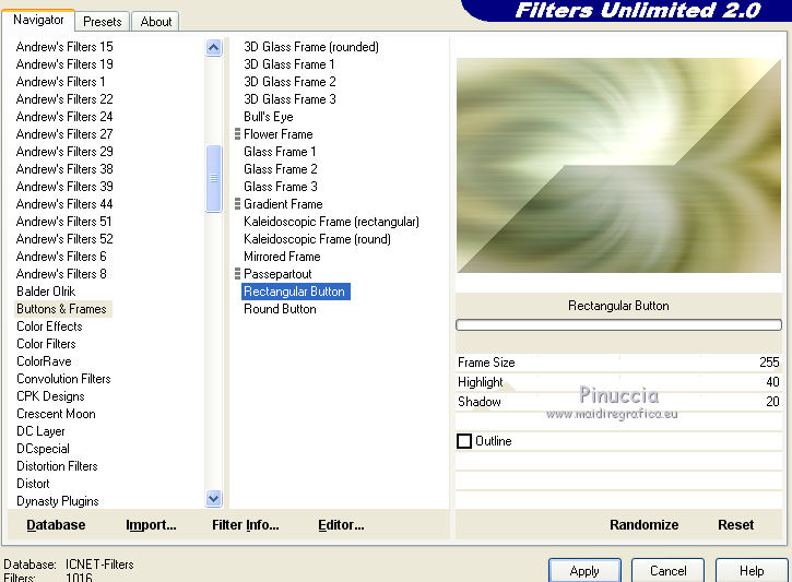 Effets>Modules Externes>Filters Unlimited 2.0 - Buttons & Frames - Rectangular Button.