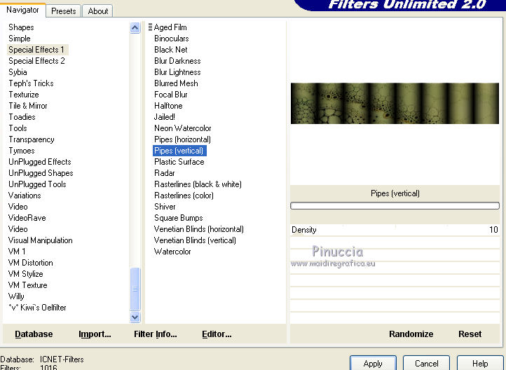 18. Effets>Modules Externes>Filters Unlimited 2.0 - Special Effects 1 - Pipes (vertical), par défaut.