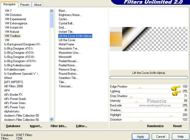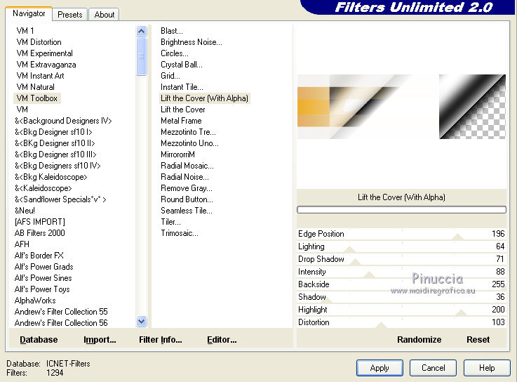 8. Effets>Modules Externes>Filters Unlimited 2.0 - VM Toolbox - Lift the Cover (with Alpha)