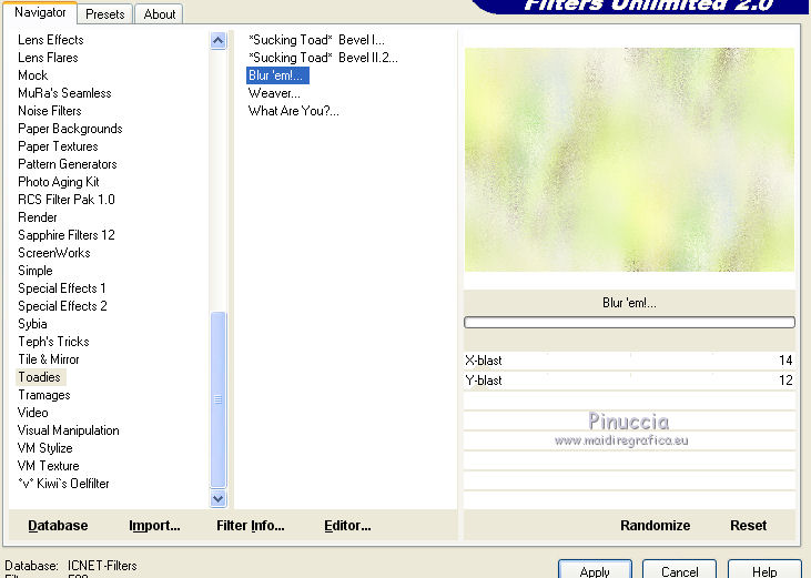 Effets>Modules Externes>Filters unlimited 2.0 - Toadies - Blur'em!, par défaut.