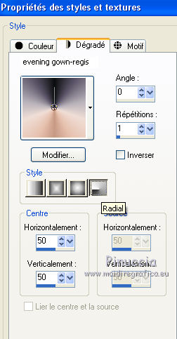 1. Placer en avant plan le dégradé et sélectionner le dégradé evening gown-regis, style Radial.