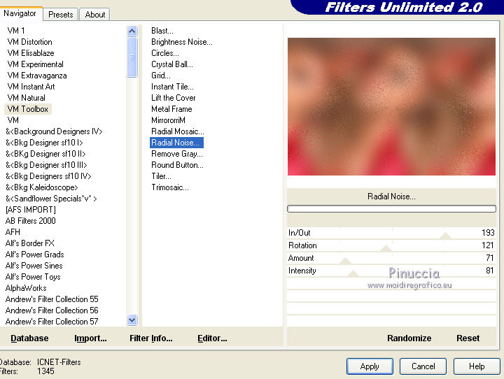 6. Effets>Modules Externes>Filters Unlimited 2.0 - VM Toolbox - Radial Noise.