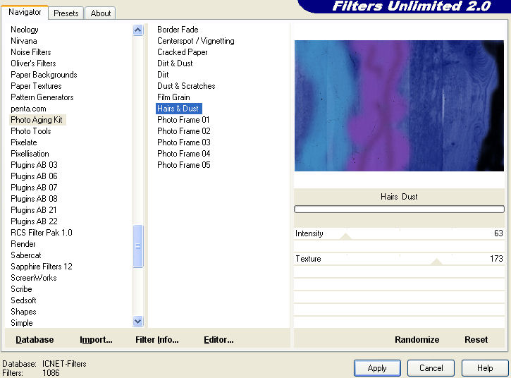15. Effets>Modules Externes>Filters Unlimited 2.0 - Photo Aging Kit - Hairs & Dust