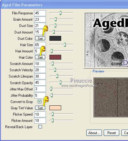 Effets>Modules Externes>Digi Effects - Aged Film, par défaut, mais changer les couleurs