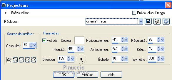 Effets>Effets d'éclairage>Projecteurs - sélectionner le preset cinema1_regis et ok.