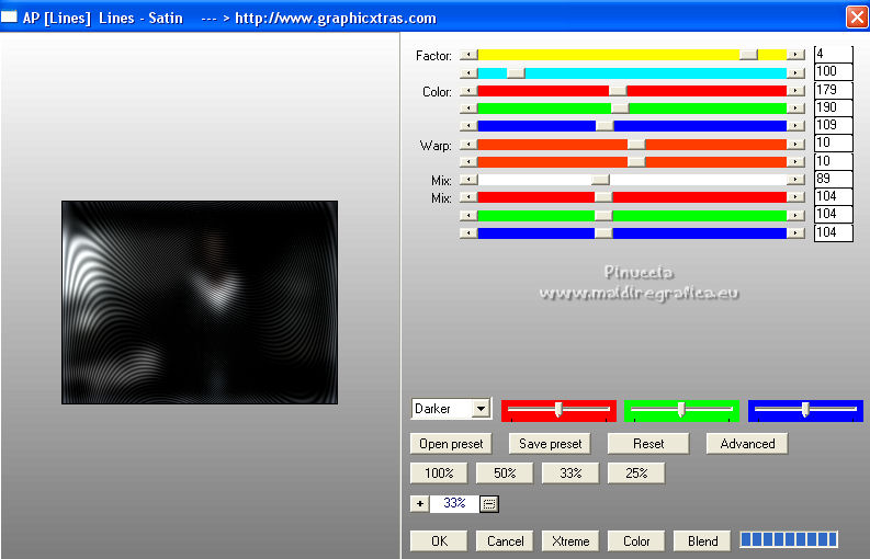 19. Effets>Modules Externes>AP Lines – Lines Satin, par défaut, mais Darker coché.