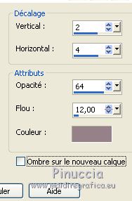 Effets>Effets 3D>Ombre portée, couleur foncée du tube - 2 fois.
