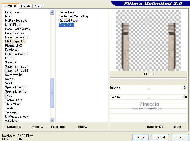 15. Effets>Modules Externes>Filters Unlimited 2.0 - Photo Aging Kit - Dirt and Dast, par défaut.