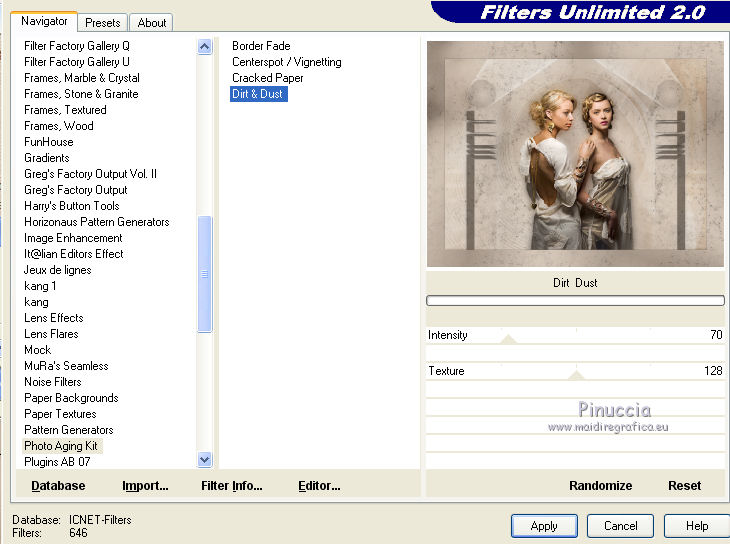 20. Effets>Modules Externes>Filters Unlimited 2.0 - Photo Aging Kit - Dirt and Dast - Intensity à 70.