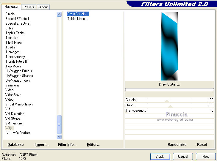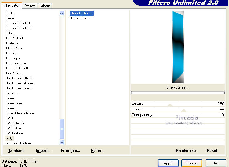 Effets>Modules Externes>Filters Unlimited 2.0 - Willy - Draw Curtain, par défaut.
