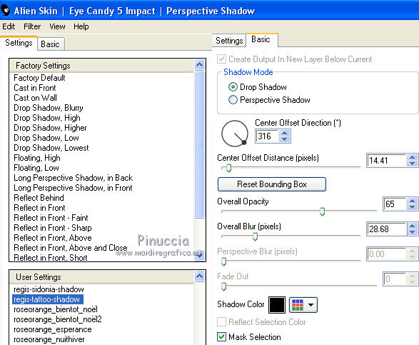 Effets>Modules Externes>Alien Skin Eye Candy 5 Impact - Perspective Shadow, come précédemment.