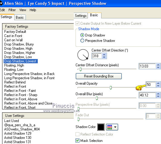 Sélectionner le preset Drop Shadow Lowest et sous Basic changer Opacity avec 50.