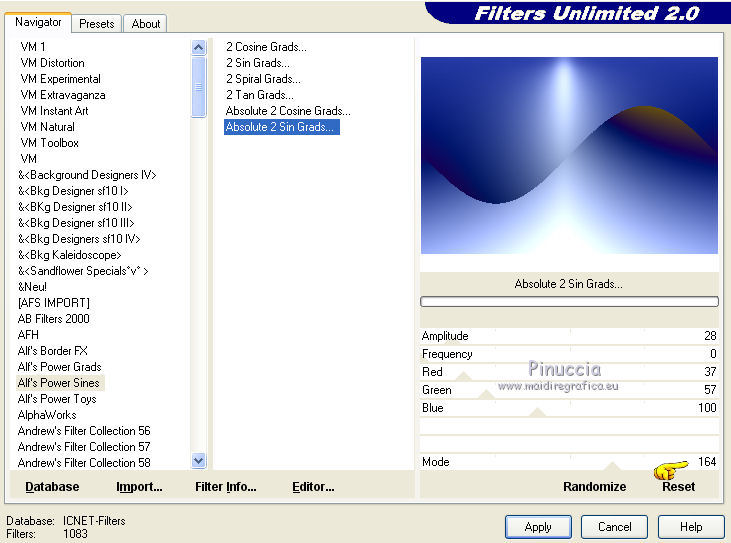 Effets>Modules Externes>Filters Unlimited 2.0 - Alf's Power Sines - Absolute 2 Sin Grads.