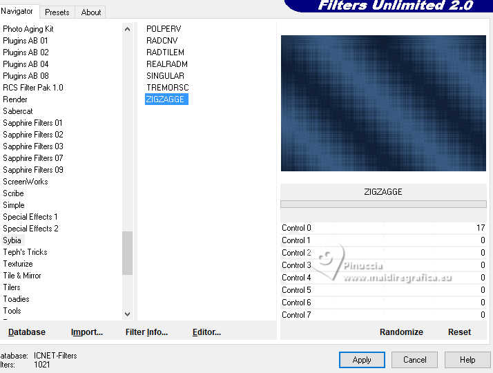 Effects>Plugins>Filters Unlimited 2.0 - Sybia - ZIGZAGGE, default settings