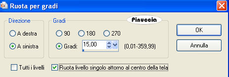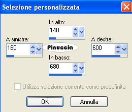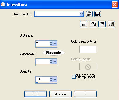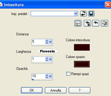qui puoi trovare qualche risposta ai tuoi dubbi. Se l'argomento che ti interessa non è presente, ti prego di segnalarmelo. Questo tutorial è stato scritto con PSP Corel X2, ma può essere eseguito anche con le precedenti versioni. Per tradurlo, ho usato PSP X. Occorrente: Un tube a scelta. Il resto del materiale qui Il tube che ho usato è di Angie. Filtri. Xero - Clarity qui 1. Apri "Paper 9", che ha la corretta dimensione di 750 x 750 pixels. Questa sarà la base del tuo lavoro. Scegli due colori dal tuo tube. Per il mio esempio ho usato come colore di primo piano il colore scuro #310000, e come colore di sfondo il colore chiaro #fff1a7. 2. Livelli>Nuovo livello raster. Attiva lo strumento Selezione ,clicca sull'icona Selezione personalizzata ![]() e imposta i seguenti settaggi: ![]() Riempi con il colore di primo piano.3. Selezione>Modifica>Contrai - 10 pixels. Riempi con il colore di sfondo.Selezione>Modifica>Contrai - 10 pixels. Riempi con il colore di primo piano.4. Effetti>Effetti di trama>Intessitura. ![]() Effetti>Plugins>Xero - Clarity, con i settaggi standard: ![]() Selezione>Deseleziona. 5. Effetti>Effetti 3D>Sfalsa ombra: ![]() 6. Immagine>Ruota per gradi - 15 gradi a sinistra: ![]() Sposta l'immagine al centro.7. Livelli>nuovo livello raster. Attiva lo strumento Selezione , cerchio,e disegna un cerchio di circa 384 x 384 pixels. Non importa la posizione, mentre lo disegni puoi controllare la dimensione nella barra inferiore degli strumenti. ![]() Riempi con il colore di sfondo.8. Effetti>Effetti di trama>Intessitura: ![]() Effetti>Plugins>Xero - Clarity con i settaggi standard. Selezione>Deseleziona. 9. Sposta il cerchio nel rettangolo.![]() Effetti>Effetti 3D>sfalsa ombra, come al punto 5. 10. Livelli>Nuovo livello raster. Livelli>nuovo livello raster. Attiva lo strumento Selezione , cerchio,e disegna un cerchio di circa 258 x 258 pixels. Riempi con il colore di primo piano.11. Selezione>Modifica>Contrai - 5 pixels. Riempi con il colore di sfondo.Selezione>Modifica>Contrai - 5 pixels. Riempi con il colore di primo piano.12. Effetti>Effetti di trama>Intessitura, come al punto 4. ![]() Effetti>Plugins>Xero - Clarity, con i settaggi standard. Selezione>Deseleziona. Effetti>Effetti 3D>sfalsa ombra, come al punto 5. 13. Livelli>Duplica, e posiziona i due cerchi come nell'esempio.![]() 14. Livelli>Nuovo livello raster. Livelli>nuovo livello raster. Attiva lo strumento Selezione , cerchio,e disegna un cerchio di circa 184 x 184 pixels. Riempi con il colore di sfondo.15. Selezione>modifica>Contrai - 5 pixels. Riempi con il colore di primo piano.Selezione>Modifica>Contrai - 5 pixels. Riempi con il colore di sfondo.16. Effetti>Effetti di trama>Intessitura, come al punto 8. ![]() Effetti>Plugins>Xero - Clarity, con i settaggi standard. Selezione>Deseleziona. Effetti>Effetti 3D>sfalsa ombra, come al punto 5. Sposta il cerchio come nell'esempio.![]() 17. Apri il tube accessorio (doodle) e vai a Modifica>Copia. Torna al tuo lavoro e vai a Modifica>Incolla come nuovo livello. Spostalo nell'angolo in alto a sinistra del rettangolo.Livelli>Duplica. Immagine>Rifletti. Immagine>Capovolgi. Livelli>Unisci>Unisci giù. Effetti>Effetti 3D>sfalsa ombra, come al punto 5. 18. Apri il tube con le foglie "leaf-clutter-Belle-Graphics". Attiva lo strumento Selezione a mano libera , da punto a punto,e seleziona le prime foglie. Modifica>Copia. Torna al tuo lavoro e vai a Modifica>Incolla come nuovo livello. Sposta le foglie nel cerchio, come nel mio esempio.Torna al tube. Selezione>Deseleziona e seleziona il secondo gruppo di foglie.Modifica>Copia. Torna al tuo lavoro e vai a Modifica>Incolla come nuovo livello. Sposta le foglie come nel mio esempio.Attiva nuovamente il tube. Selezione>Deseleziona e seleziona il secondo gruppo di foglie.Modifica>Copia. Torna al tuo lavoro e vai a Modifica>Incolla come nuovo livello. Sposta le foglie come nel mio esempio, o come preferisci.Livelli>Unisci>Unisci giù, 2 volte e avrai le foglie sullo stesso livello. Effetti>Effetti 3D>sfalsa ombra, come al punto 5. Questo è il mio esempio, ma sei libero di selezionare e disporre le foglie come preferisci. ![]() 19. Apri il tube del fiore "blume" e vai a Modifica>Copia. Torna al tuo lavoro e vai a Modifica>Incolla come nuovo livello. Sposta il fiore sul piccolo cerchio.Effetti>Effetti 3D>sfalsa ombra, come al punto 5. 20. Apri il file con il testo "autumn-schriftzug" e vai a Modifica>Copia. Torna al tuo lavoro e vai a Modifica>Incolla come nuovo livello. Immagine>Ruota per gradi - 15 gradi a sinistra. Effetti>Effetti 3D>sfalsa ombra, come al punto 5. Spostalo nell'angolo in alto a sinistra.21. Apri il tuo tube e vai a Modifica>Copia. Torna al tuo lavoro e vai a Modifica>Incolla come nuovo livello. Sposta a destra, vedi il mio esempio.22. Livelli>Duplica, e attiva il livello sottostante del tube originale. Regola>Sfocatura>Sfocatura gaussiana - raggio 20. ![]() 23. Attiva il livello superiore della copia del tube. Effetti>Effetti 3D>sfalsa ombra, come al punto 5. 24. Attiva lo strumento Testo e scrivi un testo o il tuo nome.Aggiungi, se vuoi il tuo watermark. Effetto Sfalsa ombra a tua scelta. 25. Immagine>Aggiungi bordatura, 2 pixels, simmetriche, con il colore #310000. Immagine>Aggiungi bordatura, 50 pixels, simmetriche, con il colore #ffe1a7. Seleziona questo bordo con la bacchetta magica , sfumatura e tolleranza 0,Effetti>Effetti di trama>Intessitura, come al punto 8. ![]() Effetti>Plugins>Xero - Clarity, con i settaggi standard. Selezione>Inverti. 26. Effetti>Effetti 3D>sfalsa ombra: ![]() Selezione>Deseleziona. Effetti>Effetti 3D>sfalsa ombra, come al punto 5. ![]() Hai finito. Salva in formato jpg. Se hai problemi o dubbi, o trovi un link non funzionante, o anche soltanto per un saluto, scrivimi. 20 Settembre 2009 |