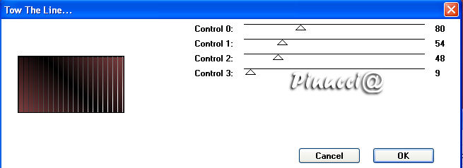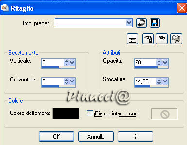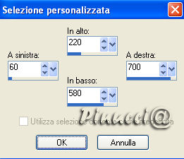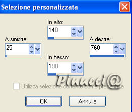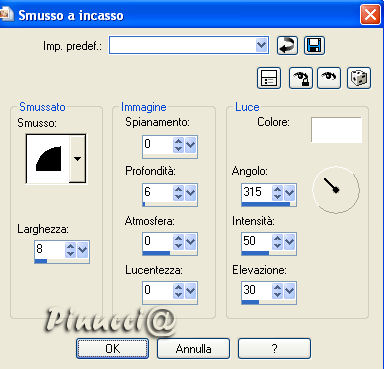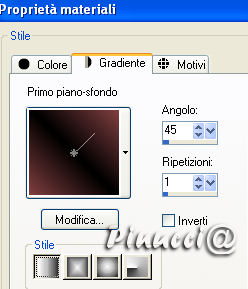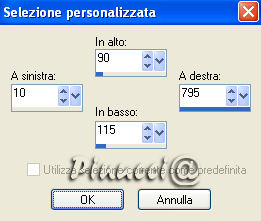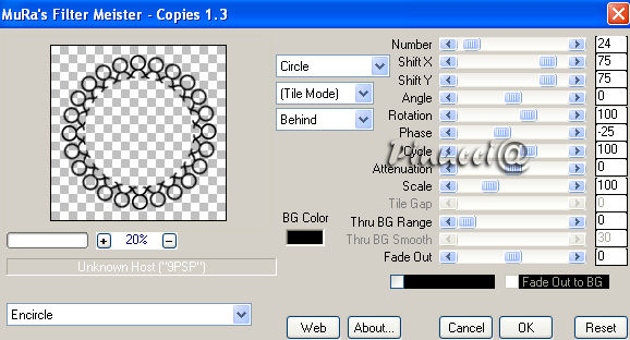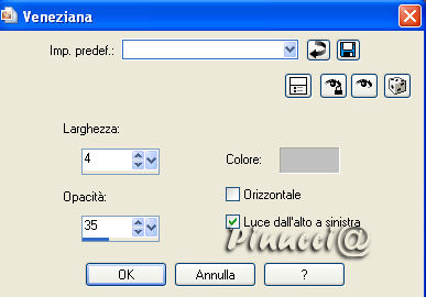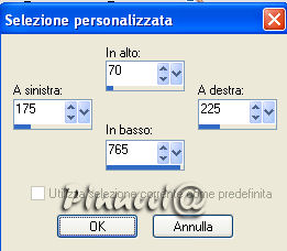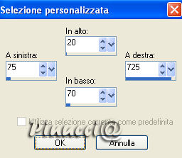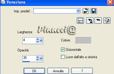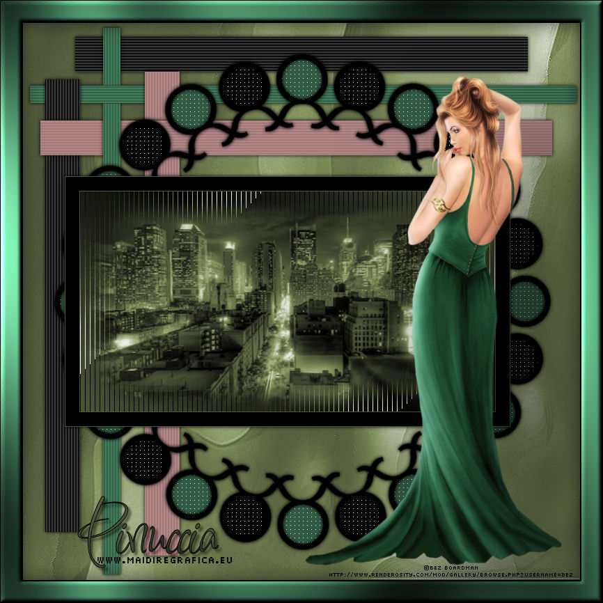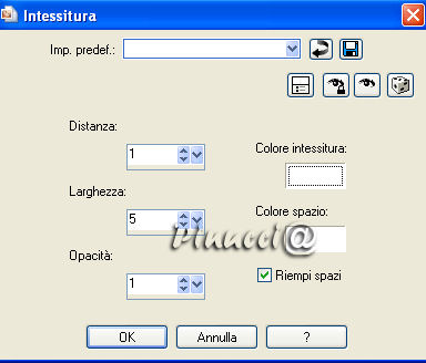 qui puoi trovare qualche risposta ai tuoi dubbi. Se l'argomento che ti interessa non è presente, ti prego di segnalarmelo. Questo tutorial è stato scritto con Corel X3, ma può essere eseguito anche con le precedenti versioni. Per tradurlo, ho usato PSP X. Occorrente: Un tube a scelta. Il resto del materiale qui Per i miei esempi ho usato ©Bez. Filtri: Mura's Meister - Copies qui Filters Unlimited qui Tramages - Tow The Line qui Alien Skin Eye Candy 5 Impact - Perspective Shadow qui Graphics Plus - Cross Shadow qui Metti la selezione nella cartella Selezioni, e apri il resto del materiale in PSP. 1. Apri l'immagine di sfondo "JHanna_189_background". Questa immagine, che ha la dimensione di 800 x 800 pixels, sarà la base del tuo lavoro. Scegli tre colori dal tuo tube. Per il mio esempio ho usato come colore di primo piano il colore chiaro #803f40, e come colore di sfondo il colore nero #000000. Il terzo colore è il grigio #808080. 2. Livelli>Nuovo livello raster. Attiva lo strumento Selezione ,clicca sull'icona Selezione personalizzata ![]() e imposta i seguenti settaggi: ![]() Riempi la selezione con il colore di sfondo (tasto destro del mouse).3. Effetti>Effetti di trama>Veneziana. ![]() Selezione>Deseleziona. 4. Effetti>Effetti 3D>Sfalsa ombra. ![]() 5. Livelli>Nuovo livello raster. Selezione personalizzata ![]() ![]() Riempi con il colore di primo piano.Effetti>Effetti di trama>Veneziana, come al punto 3. Selezione>Deseleziona. Effetti>Effetti 3D>Sfalsa ombra, come al punto 4. 6. Livelli>Nuovo livello raster. Selezione personalizzata ![]() ![]() Riempi con il terzo colore (il mio il grigio #808080).7. Effetti>Effetti di trama>Veneziana, con i seguenti settaggi. ![]() Selezione>Deseleziona. Effetti>Effetti 3D>Sfalsa ombra, come al punto 4. 8. Attiva il livello con la striscia nera - Raster 1. Livelli>Duplica. Immagine>Ruota per gradi - 90 gradi a sinistra. ![]() Livelli>Disponi>Porta in alto. Posiziona la striscia come nell'esempio.![]() 9. Selezione personalizzata ![]() ![]() Riempi con il terzo colore (#808080).Effetti>Effetti di trama>Veneziana, come al punto 3. Selezione>Deseleziona. Effetti>Effetti 3D>Sfalsa ombra, come al punto 4. 10. Attiva il livello con l'altra striscia - raster 2. Livelli>Duplica. Immagine>Ruota per gradi - 90 gradi a sinistra. Livelli>Disponi>Porta in alto. Spostala tra le due strisce, come nel mio esempio.11. Attiva lo strumento Gomma ![]() e cancella il pezzetto di striscia nell'incrocio: ![]() Dovresti avere questo. ![]() 11. Livelli>Nuovo livello raster. Selezione>Carica/Salva selezione>Carica selezione da disco. Cerca e carica la selezione "tag-rom-211-1". ![]() 12. Riempi la selezione con il colore nero.Selezione>Deseleziona. Effetti>Plugins>Mura's Meister - Copies. ![]() 13. Dovresti avere questo. ![]() 14. Attiva lo strumento Bacchetta magica , sfumatura e tolleranza 0, modalità aggiungi.e seleziona un cerchio ogni due. ![]() Selezione>Modifica>Espandi - 3 pixels. 15. Livelli>Nuovo livello raster. Attiva lo strumento Riempimento , modalità di corrispondenza Nessuno,![]() e clicca su una selezione per riempirle tutte con il colore di primo piano. Effetti>Effetti di trama>Intessitura. ![]() Selezione>Deseleziona. Livelli>Disponi>Sposta giù. 16. Attiva nuovamente il livello superiore. Seleziona con la bacchetta magica i cerchi rimasti vuoti.![]() Selezione>Modifica>Espandi - 3 pixels. Livelli>Nuovo livello raster. Riempi con il colore nero di sfondo (tasto destro del mouse).Effetti>Effetti di trama>Intessitura, con i settaggi precedenti. Selezione>Deseleziona. Livelli>Disponi>Sposta giù. 17. Attiva nuovamente il livello superiore con i cerchi trasparenti. Effetti>Effetti 3D>Sfalsa ombra, come al punto 4. Livelli>unisci>Unisci giù - 2 volte. 18. Dovresti avere questo. ![]() 19. Livelli>Nuovo livello raster. Selezione personalizzata ![]() ![]() Riempi con il colore di primo piano.20. Selezione>Modifica>Contrai - 1 pixels. Riempi con il colore di sfondo.Selezione>Modifica>Contrai - 20 pixels. Riempi con il colore di primo piano.21. Selezione>Modifica>Contrai - 1 pixel. Passa il colore di primo piano a Gradiente. ![]() Riempi la selezione con il gradiente.Effetti>Plugins>Tramages - Tow the Line, con i settaggi standard. ![]() 22. Apri il tube "stadt" e vai a Modifica>Copia. Torna al tuo lavoro e via a Modifica>Incolla nella selezione. Selezione>Deseleziona. Effetti>Effetti 3D>sfalsa ombra, come al punto 4. 23. Apri il tuo tube e vai a Modifica>Copia. Torna al tuo lavoro e vai a Modifica>Incolla come nuovo livello. Spostalo a destra - vedi il mio esempio.Effetti>Plugins>Alien Skin Eye Candy 5 - Impact - Perspective Shadow. Seleziona Drop Shadow (Blurry) e ok. ![]() 24. Attiva lo strumento Testo e scrivi un testo o il tuo nome.Aggiungi, se vuoi, il tuo watermark. Effetti>Effetti 3D>Sfalsa ombra, a tua scelta. 25. Immagine>Aggiungi bordatura, 2 pixels, simmetriche, con il colore #000000. Immagine>Aggiungi bordatura, 30 pixels, simmetriche, con il colore di primo piano #803f40. Seleziona questo bordo con la bacchetta magica ![]() Effetti>Plugins>Graphics Plus - Cross Shadow, con i settaggi standard. ![]() 26. Effetti>Effetti 3D>Smusso a incasso. ![]() Selezione>Inverti. 27. Effetti>Effetti 3D>Ritaglio. ![]() Selezione>Deseleziona. Immagine>Aggiungi bordatura, 1 pixels, simmetriche, con il colore #000000. Hai finito. Puoi salvare il tuo lavoro in formato jpg. ![]() Se hai problemi o dubbi, o trovi un link non funzionante, o anche soltanto per un saluto, scrivimi. 11 Agosto 2010 |