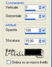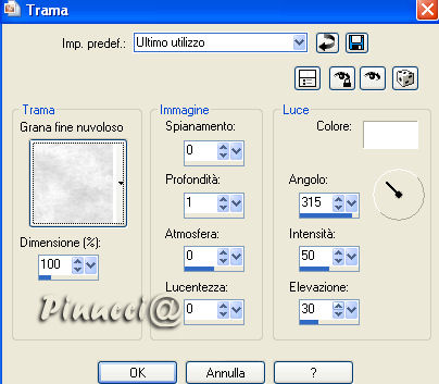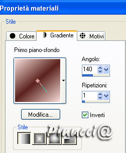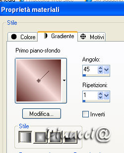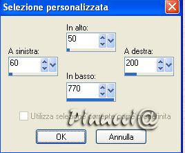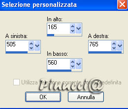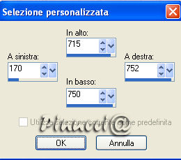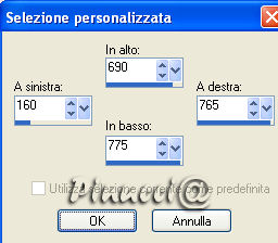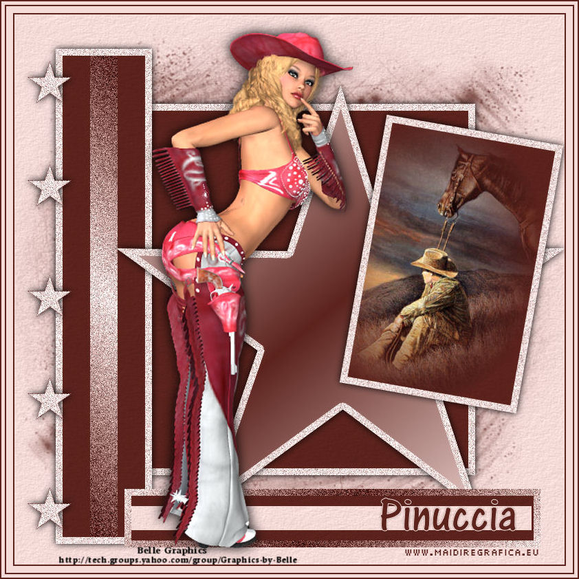 qui puoi trovare qualche risposta ai tuoi dubbi. Se l'argomento che ti interessa non è presente, ti prego di segnalarmelo. Questo tutorial è stato scritto con Corel X3, ma può essere eseguito anche con le precedenti versioni. Per tradurlo, ho usato PSP X. Occorrente: Un tube a scelta. Il resto del materiale qui Filtri: Xero - Clarity qui Apri tutto il materiale in PSP, compresa la maschera. 1. Apri una nuova immagine trasparente 800 x 800 pixels. Scegli due colori dal tuo tube. Per il mio esempio ho usato come colore di primo piano il colore scuro #5c231d, e come colore di sfondo il colore chiaro #f6dcd9. Riempi l'immagine trasparente con il colore di sfondo (tasto destro del mouse).Effetti>Effetti di trama>Trama - seleziona la trama Grana fine nuvoloso, con i seguenti settaggi. ![]() 3. Livelli>Nuovo livello raster. Riempi con il colore di primo piano.Livelli>Nuovo livello maschera>Da immagine. Apri il menu sotto la finestra di origine e vedrai la lista dei files aperti. Tra questi la maschera. Seleziona la maschera mask2 con i seguenti settaggi: ![]() Livelli>Elimina, e rispondi sì alla domanda Unire la maschera nel livello corrente. ![]() Livelli>Unisci>Unisci gruppo. Effetti>Plugins>Xero - Clarity, con i settaggi standard. ![]() 4. Selezione>Seleziona tutto. Selezione>Modifica>Contrai - 130 pixels. 5. Livelli>Nuovo livello raster. Riempi la selezione con il colore di sfondo.Regola>Aggiungi/Rimuovi disturbo>Aggiungi disturbo. ![]() 6. Selezione>Modifica>Contrai - 10 pixels. Riempi con il colore di primo piano.Effetti>Effetti di trama>Trama, come al punto 2. Selezione>Deseleziona. 7. Effetti>Effetti 3D>Sfalsa ombra. ![]() 8. Livelli>Nuovo livello raster. Attiva lo strumento Selezione , clicca sull'icona Selezione personalizzata ![]() e imposta i seguenti settaggi. ![]() Riempi la selezione con il colore di sfondo.Regola>Aggiungi/Rimuovi disturbo>Aggiungi disturbo, come al punto 5. 9. Selezione>Modifica>Contrai - 10 pixels. Riempi con il colore di primo piano.Effetti>Effetti di trama>Trama, come al punto 2. Selezione>Deseleziona. Effetti>Effetti 3D>Sfalsa ombra, come al punto 7. 10. Livelli>Nuovo livello raster. Selezione personalizzata ![]() ![]() 11. Passa il colore di primo piano a Gradiente. ![]() Riempi la selezione con il gradiente.Regola>Aggiungi/Rimuovi disturbo>Aggiungi disturbo, come al punto 5. Selezione>Deseleziona. 12. Attiva lo strumento Forme predefinite - Stella ![]() Lascia i colori come stanno; soltanto chiudi il colore di primo piano. 13. Partendo dall'angolo in alto a sinistra, disegna una stella di 620 x 620 pixels, mentre disegni la forma puoi controllare la dimensione nella barra inferiore degli strumenti. ![]() Livelli>Converti in livello raster. Regola>Aggiungi/Rimuovi disturbo>Aggiungi disturbo, come al punto 5. Selezione>Seleziona tutto. Selezione>Mobile. Selezione>immobilizza. Selezione>Modifica>Contrai - 10 pixels. 14. Cambia i settaggi del gradiente. ![]() Riempi la selezione con il gradiente.Selezione>Deseleziona. Effetti>Effetti 3D>Sfalsa ombra, come al punto 7. Sposta la stella al centro.15. Attiva nuovamente lo strumento Forme predefinite - Stella ![]() Riporta il colore di primo piano al colore iniziale e lascialo aperto, imposta la larghezza a 1 e disegna una stella di 60x60 pixels. Livelli>Converti in livello raster. Regola>Aggiungi/Rimuovi disturbo>Aggiungi disturbo, come al punto 5. Effetti>Effetti 3D>Sfalsa ombra, come al punto 7. 16. Livelli>Duplica - 4 volte, in modo che alla fine avrai 5 stelle. Posiziona le stelle come nell'esempio.![]() 17. Livelli>Nuovo livello raster. Selezione personalizzata ![]() ![]() Riempi con l'ultimo gradiente.Regola>Aggiungi/Rimuovi disturbo>Aggiungi disturbo, come al punto 5. 18. Selezione>Modifica>Contrai - 10 pixels. Riempi con il colore di primo piano.Effetti>Effetti di trama>Trama, come al punto 2. Selezione>Deseleziona. 19. Livelli>Nuovo livello raster. Selezione personalizzata ![]() ![]() Riempi con il colore di sfondo.Effetti>Effetti di trama>Trama, come al punto 2. Selezione>Deseleziona. 20. Livelli>Nuovo livello raster. Selezione personalizzata ![]() ![]() Riempi con il colore di sfondo.Regola>Aggiungi/Rimuovi disturbo>Aggiungi disturbo, come al punto 5. 21. Selezione>Modifica>Contrai - 10 pixels. Riempi con il colore di primo piano.Effetti>Effetti di trama>Trama, come al punto 2. 22. Apri il tube "Cowboy" e vai a Modifica>Copia. Torna al tuo lavoro e vai a Modifica>Incolla come nuovo livello. Immagine>Ridimensiona, all'80%, tutti i livelli non selezionato. Sposta il tube nel rettangolo.Selezione>Inverti. 23. Premi sulla tastiera il tasto CANC. Selezione>Deseleziona. Livelli>Unisci>Unisci giù. Effetti>Effetti 3D>Sfalsa ombra, come al punto 7. 24. Immagine>Ruota per gradi - 10 gradi a destra. ![]() 25. Apri il tuo tube e vai a Modifica>Copia. Torna al tuo lavoro e vai a Modifica>Incolla come nuovo livello. Spostalo un po' più a sinistra - vedi il mio esempio.Effetti>Effetti 3D>Sfalsa ombra. ![]() 26. Attiva lo strumento Testo e scrivi un testo nella striscia al centro.Effetti>Effetti 3D>Sfalsa ombra, a tua scelta. Sposta il testo sulla striscia centrale.Aggiungi il tuo nome e/o il tuo watermark su un nuovo livello. 17. Immagine>Aggiungi bordatura, 2 pixels, simmetriche, con il colore di primo piano #5c231d. Immagine>Aggiungi bordatura, 10 pixels, simmetriche, con il colore di sfondo #f6dcd9. Immagine>Aggiungi bordatura, 2 pixels, simmetriche, con il colore #5c231d. Immagine>Aggiungi bordatura, 5 pixels, simmetriche, con il colore di sfondo #f6dcd9. Immagine>Aggiungi bordatura, 2 pixels, simmetriche, con il colore #5c231d. Hai finito. Puoi salvare il tuo lavoro in formato jpg. ![]() Se hai problemi o dubbi, o trovi un link non funzionante, o anche soltanto per un saluto, scrivimi. 11 Agosto 2010 |