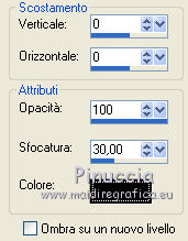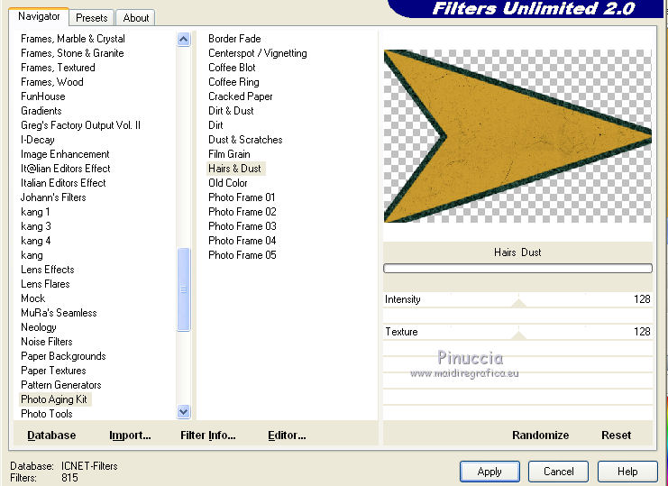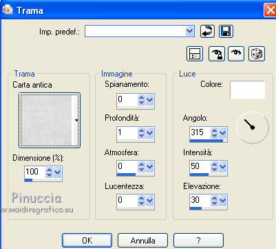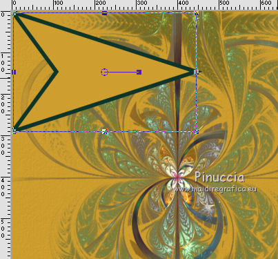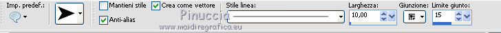 qui puoi trovare qualche risposta ai tuoi dubbi. Se l'argomento che ti interessa non è presente, ti prego di segnalarmelo. Questo tutorial è stato scritto con Corel X3, ma può essere eseguito anche con le precedenti versioni. Per tradurlo, ho usato PSP X. Occorrente: Un tube a scelta. Materiale qui Il poser usato per l'esempio è di Romana. L'immagine di sfondo è di Pueppi-Geli Filtri: Filters Unlimited 2.0 qui Photo Aging Kit - Hair & Dust qui Metti la forma pfeil27 nella cartella Forme predefinite. 1. Apri una nuova immagine trasparente 800 x 800 pixels. Scegli due colori dal tuo tube. Per l'esempio: imposta il colore di primo piano con il colore verdescuro #10362a, e il colore di sfondo con il colore gialloarancio #ce9e2f. Riempi l'immagine trasparente con il colore di sfondo.Effetti>Effetti di trama>Trama - carta antica, con i seguenti settaggi. ![]() 2. Apri il tube "apo3d7x-039" e vai a Modifica>Copia. Torna al tuo lavoro e vai a Modifica>Incolla come nuovo livello. Immagine>Ridimensiona, al 130%, tutti i livelli non selezionato. 3. Attiva lo strumento Deformazione - tasto D per tutte le versioni di PSP -e "tira" l'immagine in alto e in basso fino ai bordi. ![]() Per liberarti della griglia dello strumento clicca sulla manina ![]() 4. Effetti>Effetti 3D>Sfalsa ombra: ![]() 5. Attiva lo strumento Forme predefinite ![]() Cerca e seleziona la forma "pfeil27" con i seguenti settaggi. ![]() Lascia i colori della paletta come stanno. 6. Partendo dall'angolo in alto a sinistra, traccia una freccia di 445 x 290 pixels. ![]() Livelli>Converti in livello raster. 7. Attiva lo strumento Bacchetta magica , sfumatura e tolleranza 0,e clicca sul bordo nero per selezionarlo. Regola>Aggiungi/Rimuovi disturbo>Aggiungi disturbo. ![]() Selezione>Deseleziona. 8. Clicca al centro della freccia con la bacchetta magica .Effetti>Plugins>Filters Unlimited - Photo Aging Kit - Hairs & Dust, con i settaggi standard. ![]() 9. Effetti>Effetti 3D>Sfalsa ombra. ![]() 10. Immagine>Ruota per gradi - 45 gradi a destra. ![]() Sposta la forma nell'angolo in alto a sinistra.11. Livelli>Duplica. Immagine>Rifletti. Livelli>Duplica. Immagine>Capovolgi. Livelli>Duplica. Immagine>Rifletti. Dovresti avere questo. ![]() 12. Livelli>Nuovo livello raster. Attiva lo strumento Selezione , cerchio,e traccia un cerchio di 600 x 600 pixels. Riempi la selezione con il colore di primo piano.13. Regola>Aggiungi/Rimuovi disturbo>Aggiungi disturbo, come al punto 7. Selezione>Modifica>Contrai - 10 pixels. Riempi con il colore di sfondo.Regola>Aggiungi/Rimuovi disturbo>Aggiungi disturbo, come al punto 7. 14. Selezione>Modifica>Contrai - 10 pixels. Riempi con il colore di primo piano.Regola>Aggiungi/Rimuovi disturbo>Aggiungi disturbo, come al punto 7. Selezione>Modifica>Contrai - 10 pixels. Riempi con il colore di sfondo.15. Effetti>Plugins>Filters Unlimited - Photo Aging Kit - Hairs & Dust, con i settaggi standard. Mantieni selezionato. Apri il tube del paesaggio e vai a Modifica>Copia. Torna al tuo lavoro e vai a Modifica>Incolla come nuovo livello. 16. Selezione>Inverti. Premi sulla tastiera il tasto CANC. Selezione>Deseleziona. 17. Livelli>Unisci>Unisci giù. Effetti>Effetti 3D>Sfalsa ombra, come al punto 9. Sposta il cerchio in mezzo all'immagine.18. Apri il tuo tube e vai a Modifica>Copia. Torna al tuo lavoro e vai a Modifica>Incolla come nuovo livello. Se stai usando il tube dell'esempio: Immagine>Ridimensiona, all'80%, tutti i livelli non selezionato. Sposta il tube al centro - vedi il mio esempio.Effetti>Effetti 3D>Sfalsa ombra. ![]() 19. Scrivi il tuo testo. Aggiungi il tuo nome e/o il tuo watermark su un nuovo livello. Effetti>Effetti 3D>Sfalsa ombra, con settaggi a tua scelta. 20. Immagine>Aggiungi bordatura, 2 pixels, simmetriche, con il colore #10362a. Immagine>Aggiungi bordatura, 2 pixels, simmetriche, con il colore #ce9e2f. Immagine>Aggiungi bordatura, 2 pixels, simmetriche, con il colore #10362a. 21. Immagine>Aggiungi bordatura, 20 pixels, simmetriche, con il colore #ce9e2f. Seleziona il bordo con la bacchetta magica ![]() Effetti>Effetti 3D>smusso a incasso. ![]() Modifica>Ripeti Smusso a incasso. Selezione>Deseleziona. Immagine>Aggiungi bordatura, 2 pixels, simmetriche, con il colore #10362a. Immagine>Aggiungi bordatura, 2 pixels, simmetriche, con il colore #ce9e2f. Immagine>Aggiungi bordatura, 2 pixels, simmetriche, con il colore #10362a. Hai finito. Puoi salvare il tuo lavoro in formato jpg. Se hai problemi o dubbi, o trovi un link non funzionante, o anche soltanto per un saluto, scrivimi. 18 giugno 2011 |