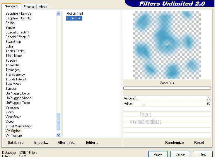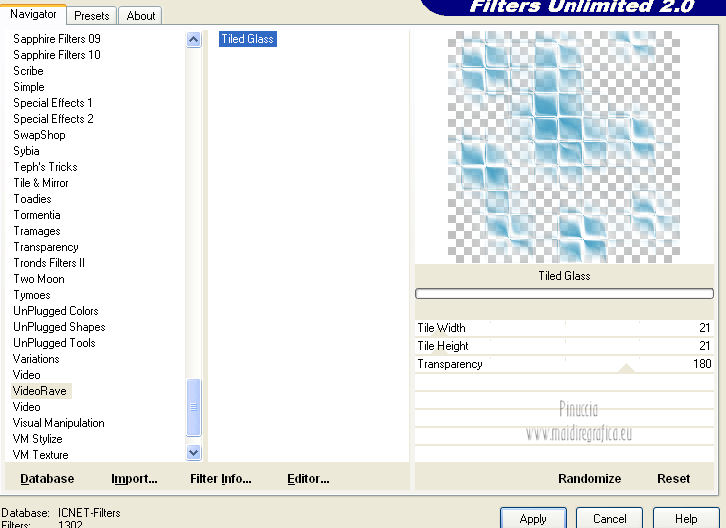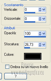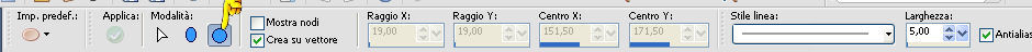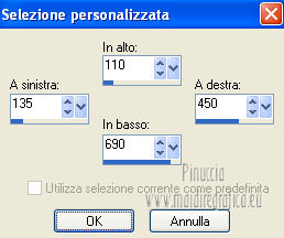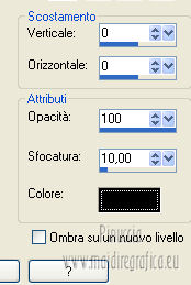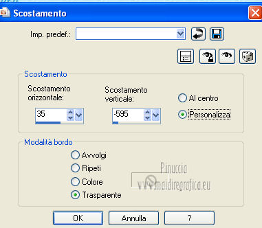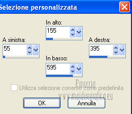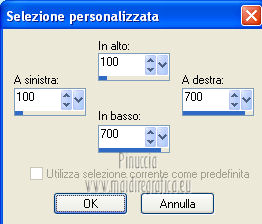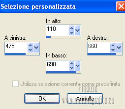 qui puoi trovare qualche risposta ai tuoi dubbi. Se l'argomento che ti interessa non è presente, ti prego di segnalarmelo. Questo tutorial è stato scritto con Corel X5, ma può essere eseguito anche con le precedenti versioni. Per tradurlo, ho usato PSP X. Occorrente: Un tube a scelta. Il resto del materiale qui Il poser usato è di Romana. Filtri: Filters Unlimited 2.0 qui VM Stylize qui VideoRave qui ![]() Metti la linea di stile diamant-Mag nella cartella Linee di stile. 1. Apri una nuova immagine trasparente 800 x 800 pixels. Imposta il colore di primo piano con il colore scuro #46a1c6, e il colore di sfondo con il colore chiaro #c3ebf4. 2. Riempi l'immagine trasparente con il colore chiaro di sfondo.Effetti>Effetti di trama>Trama - imposta una trama a tua scelta, con i seguenti settaggi. ![]() 3. Livelli>Nuovo livello raster. Attiva lo strumento Pennello ![]() imposta il pennello standard "arrotondato", con i seguenti settaggi. ![]() 4. Clicca più volte sull'immagine con il tasto sinistro del mouse per usare il colore scuro di primo piano, pressappoco come nell'esempio. ![]() 5. Regola>Sfocatura>Sfocatura gaussiana - raggio 30. ![]() 6. Effetti>Plugins>Filters Unlimited 2.0 - VM Stylize - Zoom Blur ![]() 7. Effetti>Plugins>Filter Unlimited 2.0 - Video Rave - Tiled Glass ![]() 8. Livelli>Nuovo livello raster. Attiva lo strumento Selezione ,clicca sull'icona Selezione personalizzata ![]() e imposta i seguenti settaggi: ![]() Riempi la selezione con il colore di primo piano.Effetti>Effetti di trama>Trama, come al punto 2. Selezione>Deseleziona. 9. Effetti>Effetti 3D>Sfalsa ombra. ![]() 10. Livelli>Nuovo livello raster. Selezione personalizzata ![]() ![]() Riempi la selezione con il colore di sfondo.Effetti>Effetti di trama>Trama, come al punto 2. Selezione>Deseleziona. Effetti>Effetti 3D>Sfalsa ombra, con i settaggi precedenti. 11. Livelli>Nuovo livello raster. Selezione personalizzata ![]() ![]() Riempi la selezione con il colore di sfondo.Effetti>Effetti di trama>Trama, come al punto 2. Selezione>Deseleziona. Effetti>Effetti 3D>Sfalsa ombra, con i settaggi precedenti. 12. Attiva lo strumento Penna ![]() cerca e seleziona la linea di stile Diamant-Mag, con i seguenti settaggi. ![]() Inverti i colori nella paletta dei materiali: colore chiaro come colore di primo piano. Traccia due linee verticali accanto al rettangolo di destra. ![]() Livelli>Converti in livello raster. Livelli>Duplica. Immagine>Rifletti. se stai usando PSPX5, le righe resteranno sullo stesso punto. Dovrai usare lo strumento Spostamento ![]() Dovresti avere questo. ![]() 14. Attiva lo strumento Forme - ellisse ![]() ![]() Inverti nuovamente i colori della paletta: primo piano scuro, sfondo chiaro. 15. Traccia un cerchio nell'angolo in alto a sinistra della dimensione di 400 x 400 pixels. Mentre tracci il cerchio puoi controllare la dimensione nella barra inferiore. ![]() Livelli>Converti in livello raster. 16. Attiva lo strumento Bacchetta magica , sfumatura e tolleranza 0,e clicca al centro del cerchio per selezionarlo. Effetti>Effetti di trama>Trama, come al punto 2. Selezione>Deseleziona. 17. Clicca ora nel piccolo bordo per selezionarlo con la bacchetta magica ![]() Regola>Aggiungi/Rimuovi disturbo>Aggiungi disturbo. ![]() Selezione>Deseleziona. 18. Effetti>Effetti di immagine>Scostamento. ![]() Effetti>Effetti 3D>Sfalsa ombra, con i settaggi precedenti. 19. Livelli>Nuovo livello raster. Selezione personalizzata ![]() ![]() Riempi la selezione con il colore di primo piano.Selezione>Deseleziona. 20. Attiva lo strumento Puntatore ,Deformazione ![]() in modalità Prospettiva, spingi verso l'interno uno dei due angoli a destra, (simmetricamente si sposterà anche l'angolo opposto) ![]() 21. Attiva lo strumento Bacchetta magica , sfumatura e tolleranza 0,e clicca nel rettangolo per selezionarlo. Selezione>Modifica>Contrai - 5 pixels. Riempi con il colore di sfondo #c3ebf4.Effetti>Effetti di trama>Trama, come al punto 2. Selezione>Inverti. Regola>Aggiungi/Rimuovi disturbo>Aggiungi disturbo, con i settaggi precedenti. Selezione>Deseleziona. 22. Livelli>Duplica. Immagine>Rifletti. questo passaggio è necessario per chi usa PSPX5, perchè il comando Rifletti riflette l'immagine lasciandola nella medesima posizione. Vedi gli appunto su questa "novità" di PSP qui Effetti>Effetti di immagine>Scostamento. ![]() 23. Se tutto è andato bene, dovresti avere questo. Eventualmente, se necessario, correggi le posizioni con lo strumento Spostamento ![]() ![]() 24. Attiva lo strumento Forme predefinite ![]() e seleziona Rettangolo arrotondato con i seguenti settaggi. ![]() Traccia un rettangolo in alto a sinistra della dimensione 745 x 150 pixels. Livelli>Converti in livello raster. 25. Attiva lo strumento Bacchetta magica , sfumatura e tolleranza 0,e clicca nello spazio chiaro del rettangolo per selezionarlo. Effetti>Effetti di trama>Trama, come al punto 2. Selezione>Deseleziona. 26. Clicca ora nel piccolo bordo per selezionarlo con la bacchetta magica ![]() Regola>Aggiungi/Rimuovi disturbo>Aggiungi disturbo. ![]() Selezione>Deseleziona. 27. Effetti>Effetti di immagine>Scostamento. ![]() Effetti>Effetti 3D>Sfalsa ombra, con i settaggi precedenti. 28. Apri il wordart e copia il livello "Frohe". Torna al tuo lavoro e vai a Modifica>Incolla come nuovo livello. Immagine>Ruota per gradi - 10 gradi a destra. ![]() 29. Attiva nuovamente il wordart e copia il livello "Ostern". Torna al tuo lavoro e vai a Modifica>Incolla come nuovo livello. Immagine>Ruota per gradi - 10 gradi a sinistra. ![]() 30. Posiziona i testi come nell'esempio.![]() Effetti>Effetti 3D>Sfalsa ombra, con i settaggi precedenti. ![]() 31. Apri il tube vsc Bunnies22 AB, composto da diversi livelli. Copia e incolla sul tuo lavoro gli elementi che preferisci, e posizionali a tuo piacimento.Su questi livelli: Effetti>Effetti 3D>Sfalsa ombra. .32. Apri il tube principale e vai a Modifica>Copia. Torna al tuo lavoro e vai a Modifica>Incolla come nuovo livello. Immagine>Ridime