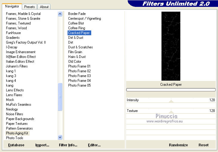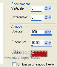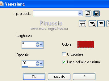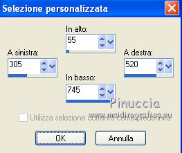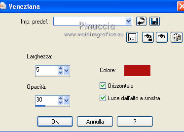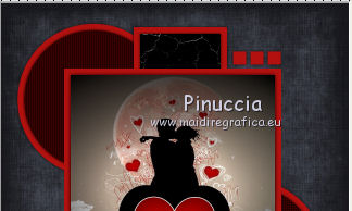 qui puoi trovare qualche risposta ai tuoi dubbi. Se l'argomento che ti interessa non è presente, ti prego di segnalarmelo. Questo tutorial è stato scritto con Corel X3, ma può essere eseguito anche con le precedenti versioni. Per tradurlo, ho usato PSP X. Occorrente: Un tube a scelta. Materiale qui Il poser usato per l'esempio è di Romana. Filtri: Filters Unlimited 2.0 qui Photo Aging Kit - Cracked Paper qui 1. Apri l'immagine "Hintergrund02" che ha la corretta dimensione di 800 x 800 pixels. Questa sarà la base del tuo lavoro. Scegli due colori dal tuo tube. Per l'esempio: imposta il colore di primo piano con il colore chiaro #b31311, e il colore di sfondo con il colore nero #000000. 2. Livelli>Nuovo livello raster. Attiva lo strumento Selezione , cerchio,e traccia un cerchio di 350 x 350 pixels. Riempi la selezione con il colore di primo piano.3. Selezione>Modifica>Contrai - 15 pixels. Riempi con il colore di sfondo.Effetti>Effetti di trama>Veneziana. ![]() 4. Ripeti l'Effetto Veneziana, selezionando Orizzontale. ![]() 5. Effetti>Effetti 3D>Sfalsa ombra. ![]() Selezione>Deseleziona. Effetti>Effetti 3D>Sfalsa ombra, con i settaggi precedenti. 6. Livelli>Duplica. Posiziona i cerchi come nell'esempio.![]() 7. Livelli>Nuovo livello raster. Attiva lo strumento Selezione ![]() clicca sull'icona Selezione personalizzata ![]() e imposta i seguenti settaggi: ![]() Riempi la selezione con il colore di primo piano.8. Selezione>Modifica>Contrai - 15 pixels. Riempi con il colore di sfondo.Effetti>Plugins>Filters Unlimited - Photo Aging Kit - Cracked Paper. ![]() 9. Effetti>Effetti 3D>Sfalsa ombra come al punto 5. ![]() Selezione>Deseleziona. Ripeti l'Effetto Sfalsa ombra. 10. Livelli>Nuovo livello raster. Attiva lo strumento Selezione , rettangolo,e traccia un rettangolo di 500 x 500 pixels. 11. Riempi la forma con il colore di primo piano.Selezione>Modifica>Contrai - 15 pixels. Riempi con il colore di sfondo.Mantieni selezionato. 12. Apri il tube che vuoi inserire nel rettangolo - per l'esempio "Chouchoucat82's..." - e vai a Modifica>Copia. Torna al tuo lavoro e vai a Modifica>Incolla come nuovo livello. Posiziona il tube nell'area selezionata.Selezione>Inverti. 13. Premi sulla tastiera il tasto CANC. Selezione>Inverti. Effetti>Effetti 3D>Sfalsa ombra, come al punto 5. Selezione>Deseleziona. Ripeti l'Effetto Sfalsa ombra. 14. Sposta il rettangolo al centro - vedi il mio esempio.15. Livelli>Nuovo livello raster. Attiva nuovamente lo strumento Selezione , rettangolo,e traccia un rettangolo di 30 x 30 pixels. 16. Riempi con il colore di primo piano.Selezione>Deseleziona. Effetti>Effetti 3D>Sfalsa ombra, come al punto 5. Livelli>Duplica - 2 volte e posiziona i tre rettangoli come nell'esempio.![]() Attiva il livello superiore dei tre. Livelli>Unisci>Unisci giù. Modifica>Ripeti Livelli Unisci giù. 18. Livelli>Duplica. Immagine>Ruota per gradi - 90 gradi a destra. ![]() 19. Sposta questi rettangoli come nell'esempio.![]() 20. Livelli>Unisci>Unisci giù. Livelli>Duplica. Immagine>Rifletti. Immagine>Capovolgi. ![]() a seconda del tube scelto, questi ultimi rettangoli, alla fine, potrebbero anche non vedersi 21. Apri il tuo tube e vai a Modifica>Copia. Torna al tuo lavoro e vai a Modifica>Incolla come nuovo livello. Se stai usando il tube dell'esempio: Immagine>Ridimensiona, all'80%, tutti i livelli non selezionato. Sposta il tube al centro - vedi il mio esempio.Livelli>Duplica. 22. Attiva il livello sottostante dell'originale. Regola>Sfocatura>Sfocatura gaussiana - raggio 15. ![]() Effetti>Effetti 3D>Sfalsa ombra, con il colore di primo piano. ![]() 23. Attiva il livello superiore della copia. Ripeti l'Effetto Sfalsa ombra con gli stessi settaggi. 24. Scrivi il tuo testo. Aggiungi il tuo nome e/o il tuo watermark su un nuovo livello. Effetti>Effetti 3D>Sfalsa ombra, con settaggi a tua scelta. 25. Immagine>Aggiungi bordatura, 2 pixels, simmetriche, con il colore #b31311. Immagine>Aggiungi bordatura, 2 pixels, simmetriche, con il colore #000000. 26. Immagine>Aggiungi bordatura, 20 pixels, simmetriche, con il colore #b31311. Seleziona questo bordo con la bacchetta magica , sfumatura e tolleranza 0.Effetti>Effetti 3D>Smusso a incasso. ![]() Selezione>Deseleziona. Immagine>Aggiungi bordatura, 5 pixels, simmetriche, con il colore #000000. Hai finito. Puoi salvare il tuo lavoro in formato jpg. ![]() Se hai problemi o dubbi, o trovi un link non funzionante, o anche soltanto per un saluto, scrivimi. 18 giugno 2011 |