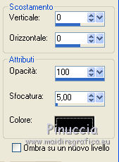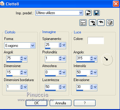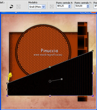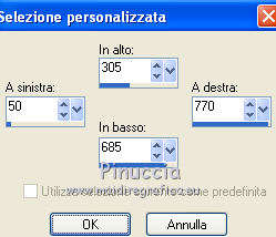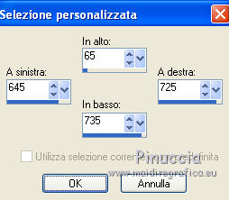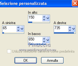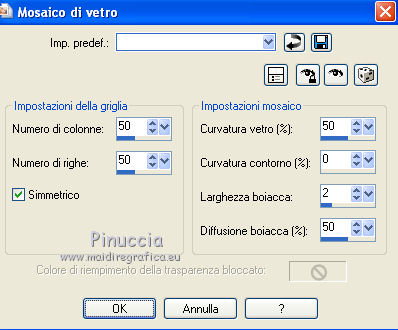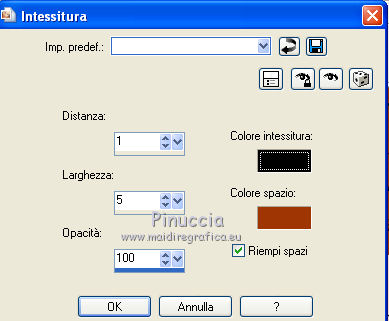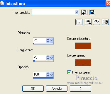 qui puoi trovare qualche risposta ai tuoi dubbi. Se l'argomento che ti interessa non è presente, ti prego di segnalarmelo. Questo tutorial è stato scritto con Corel X3, ma può essere eseguito anche con le precedenti versioni. Per tradurlo, ho usato PSP X. Occorrente: Materiale qui Filtri. Xero - Porcelain qui Apri l'immagine di sfondo "Hindergrund1" che ha la corretta dimensione di 800 x 800 pixels. Scegli due colori dal tuo tube. Per l'esempio imposta il colore di primo piano con il colore arancio #9E3604, e il colore di sfondo con il colore nero #000000. 2. Livelli>Nuovo livello raster. Attiva lo strumento Selezione ,clicca sull'icona Selezione personalizzata e imposta i seguenti settaggi.![]() Riempi la selezione con il colore di sfondo.3. Selezione>Modifica>Contrai - 2 pixels. Riempi con il colore di primo piano.Selezione>modifica>Contrai - 2 pixels. Riempi con il colore di sfondo.Selezione>Modifica>Contrai - 2 pixels. Riempi con il colore di primo piano.Selezione>Modifica>Espandi - 2 pixels. 4. Mantieni selezionato. Effetti>Effetti di trama>Trama - Mosaico di vetro. ![]() Selezione>Deseleziona. 5. Effetti>Effetti 3D>Sfalsa ombra. ![]() 6. Livelli>Nuovo livello raster. Selezione personalizzata ![]() ![]() Riempi con il colore di sfondo.7. Effetti>Effetti di trama>Intessitura. ![]() Selezione>Deseleziona. Effetti>Effetti 3D>Sfalsa ombra, come al punto 5. 8. Livelli>Nuovo livello raster. Attiva lo strumento Selezione , cerchio,e traccia un cerchio della dimensione di 470 x 470 pixels. Mentre disegni il cerchio, puoi controllare la dimensione nella barra inferiore. Riempi la selezione con il colore di sfondo.9. Selezione>Modifica>Contrai - 5 pixels. Riempi con il colore di primo piano.Selezione>modifica>Contrai - 5 pixels. Riempi con il colore di sfondo.Selezione>Modifica>Contrai - 5 pixels. Riempi con il colore di primo piano.10. Mantieni selezionato. Effetti>Effetti di trama>Ciottoli. ![]() Selezione>Deseleziona. Effetti>Effetti 3D>Sfalsa ombra, come al punto 5. 11. Sposta il cerchio come nel mio esempio.![]() 12. Livelli>Nuovo livello raster. Selezione personalizzata ![]() ![]() Riempi la selezione con il colore di sfondo.13. Mantieni selezionato. Effetti>Effetti di trama>Intessitura. ![]() Selezione>Deseleziona. 14. Attiva lo strumento Puntatore , modalità Gradi,Deformazione se stai usando PSP 9,e usando il nodo superiore a sinistra, spingilo verso il basso come nell'esempio. ![]() Clicca sulla manina per liberarti della griglia dello strumento.Effetti>Effetti 3D>Sfalsa ombra, come al punto 5. 15. Apri il tuo tube e vai a Modifica>Copia. Torna al tuo lavoro e vai a Modifica>Incolla come nuovo livello. Immagine>Ridimensiona, al 75%, tutti i livelli non selezionato. Effetti>Effetti 3D>Sfalsa ombra. ![]() Spostalo un po' più a sinistra, o come preferisci.16. Attiva lo strumento Testo , scegli un bel font,e scrivi "Halloween". Livelli>Converti in livello raster. Effetti>Effetti 3D>Sfalsa ombra. ![]() Spostalo in alto, come nel mio esempio.17. Con lo stesso font scrivi "Streghe". Livelli>Converti in livello raster. Effetti>Effetti 3D>Sfalsa ombra, con i settaggi precedenti. Spostalo in basso a sinistra.18. Scrivi il tuo nome e /o il tuo watermark su un nuovo livello. Effetti>Effetti 3D>Sfalsa ombra, con settaggi a tua scelta. 19. Immagine>Aggiungi bordatura, 1 pixel, simmetriche, con il colore #000000. Immagine>Aggiungi bordatura, 5 pixels, simmetriche, con il colore #9E3604. Immagine>Aggiungi bordatura, 5 pixels, simmetriche, con il colore #000000. Immagine>Aggiungi bordatura, 5 pixels, simmetriche, con il colore #9E3604. Immagine>Aggiungi bordatura, 1 pixel, simmetriche, con il colore #000000. 20. Selezione>Seleziona tutto. Selezione>Modifica>Contrai - 17 pixels. Effetti>Effetti 3D>Ritaglio. ![]() Selezione>Deseleziona. 21. Effetti>Plugins>Xero - Porcelain. ![]() Salva in formato jpg. Se hai problemi o dubbi, o trovi un link non funzionante, o anche soltanto per un saluto, scrivimi. 12 Ottobre 2011 |