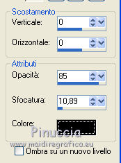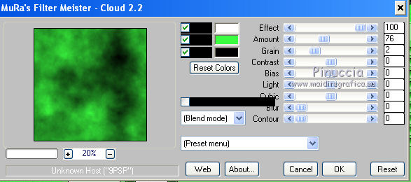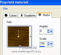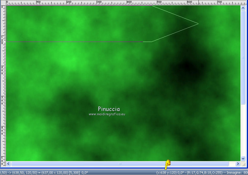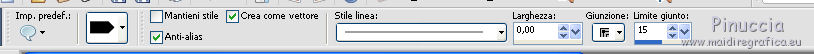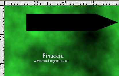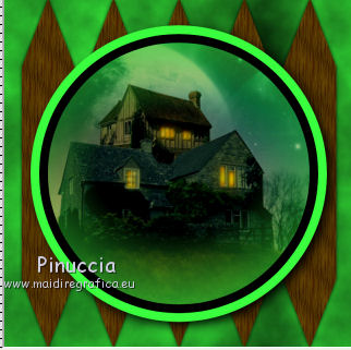 qui puoi trovare qualche risposta ai tuoi dubbi. Se l'argomento che ti interessa non è presente, ti prego di segnalarmelo. Questo tutorial è stato scritto con Corel X3, ma può essere eseguito anche con le precedenti versioni. Per tradurlo, ho usato PSP X. Occorrente: Tubes a scelta (il tube principale, il tube di un albero e accessori vari). Il resto del materiale qui Filtri. Mura's Meister - Cloud qui Alien Skin Eye Candy 5 Impact - Perspective Shadow qui Metti la forma predefinita Pfeil16 nella cartella Forme predefinite. Apri il motivo "holz" in PSP e minimizzalo. 1. Apri una nuova immagine trasparente 800 x 800 pixels. Scegli due colori dal tuo tube. Per l'esempio: Imposta il colore di primo piano con il chiaro #3bfe40, e il colore di sfondo con il colore nero #000000. 2. Effetti>Plugins>Mura's Meister- Cloud. prima di impostare i settaggi, clicca su Reset per assicurarti che siano impostati i tuoi colori ![]() 3. Attiva lo strumento Forme predefinite ![]() e seleziona la forma Pfeil con i seguenti settaggi. ![]() impostando la dimensione a 0, sarà utilizzato il colore di sfondo 4. Partendo dall'angolo in alto a sinistra traccia la forma con la dimensione 638 x 120 pixels. Mentre disegni la forma puoi controllare la dimensione nella barra inferiore degli strumenti. ![]() Una volta rilasciato il tasto del mouse, avrai questo. ![]() 5. Livelli>Converti in livello raster. Sposta la freccia a destra e un po' più in basso.![]() Livelli>Duplica. Immagine>Rifletti. Dovresti avere questo. ![]() Assicurati di essere posizionato sul livello superiore. Livelli>Unisci>Unisci giù. 7. Passa il colore di primo piano a Motivi, e seleziona il motivo "holz" minimizzato all'inizio del tutorial. ![]() 8. Attiva lo strumento Bacchetta magica , sfumatura e tolleranza 0,e clicca nella forma nera per selezionarla. Riempi la selezione con il motivo.Selezione>Deseleziona. 9. Effetti>Effetti 3D>Sfalsa ombra. ![]() 10. Immagine>Ruota per gradi - 90 gradi a sinistra. ![]() Sposta la forma a sinistra, vicino al bordo.Livelli>Duplica - 4 volte, in modo da avere 5 forme. Posiziona le forme come nell'esempio.![]() 11. Livelli>Nuovo livello raster. Attiva lo strumento Selezione , cerchio,e traccia un cerchio di 680 x 680 pixels. Mentre disegni il cerchio puoi controllare la dimensione nella barra inferiore. Riempi la selezione con il colore chiaro di primo piano.12. Selezione>Modifica>Contrai - 20 pixels. Riempi con il colore di sfondo.Selezione>Modifica>Contrai - 20 pixels. Riempi con il colore di primo piano.13. Apri il tube del paesaggio e vai a Modifica>Copia. Torna al tuo lavoro e vai a Modifica>Incolla come nuovo livello. Posiziona il tube nella selezione.per il mio esempio ho ridimensionato il tube al 130% Selezione>Inverti. Premi sulla tastiera il tasto CANC. Selezione>Deseleziona. Livelli>Unisci>Unisci giù. 15. Effetti>Plugins>Alien Skin Eye Candy 5 Impact - Perspective Shadow. Seleziona Drop Shadow,Blurry e ok. ![]() Sposta il cerchio al centro dell'immagine.![]() 16. Apri il tuo tube accessorio (un albero di Halloween) e vai a Modifica>Copia. Torna al tuo lavoro e vai a Modifica>Incolla come nuovo livello. Spostalo a sinistra.Effetti>Plugins>Alien Skin Eye Candy 5 Impact - Perspective Shadow, con i settaggi precedenti. Puoi ornare il tuo lavoro con gli elementi decorativi che preferisci. 17. Apri il tuo tube principale e vai a Modifica>Copia. Torna al tuo lavoro e vai a Modifica>Incolla come nuovo livello. Spostalo a destra.Effetti>Plugins>Alien Skin Eye Candy 5 Impact - Perspective Shadow, con i settaggi precedenti. 18. Aggiungi il tuo nome e/o il tuo watermark su un nuovo livello. Effetti>Effetti 3D>Sfalsa ombra, con settaggi a tua scelta. 19. Immagine>Aggiungi bordatura, 1 pixel, simmetriche, con il colore #000000. Immagine>Aggiungi bordatura, 1 pixel, simmetriche, con il colore #3bfe40. Immagine>Aggiungi bordatura, 20 pixels, simmetriche, con il colore #000000. Immagine>Aggiungi bordatura, 1 pixel, simmetriche, con il colore #3bfe40. Immagine>Aggiungi bordatura, 1 pixel, simmetriche, con il colore #000000. Salva in formato jpg. Se hai problemi o dubbi, o trovi un link non funzionante, o anche soltanto per un saluto, scrivimi. 14 Ottobre 2011 |
