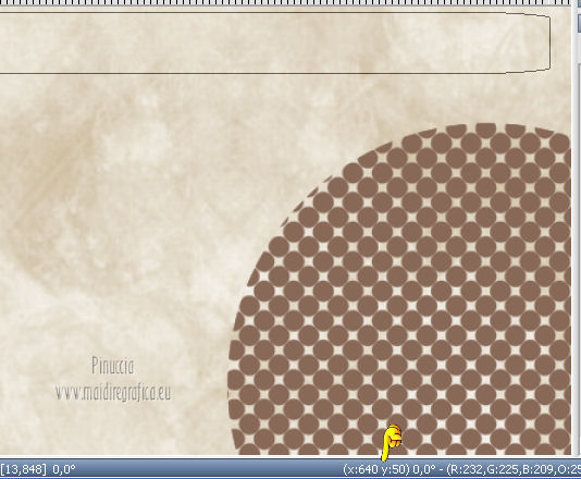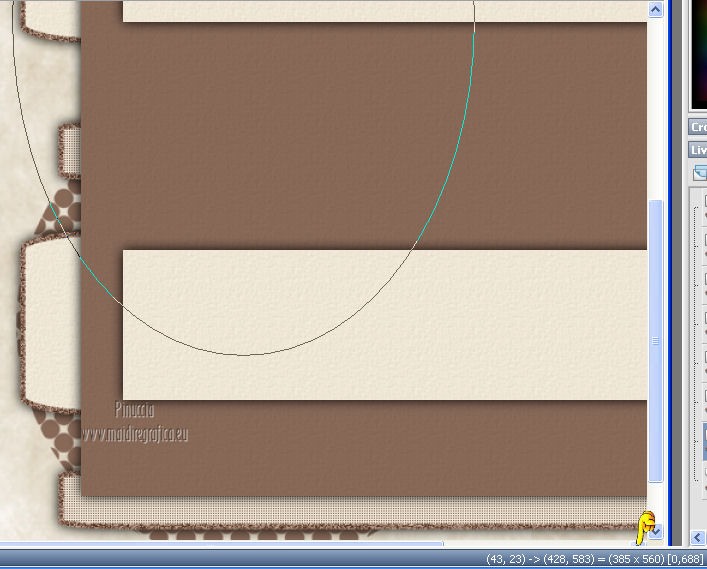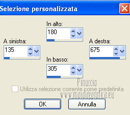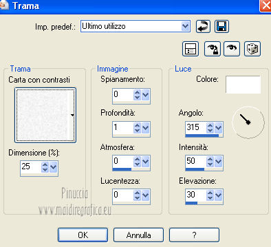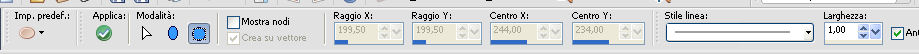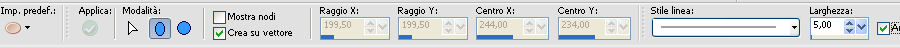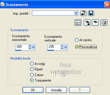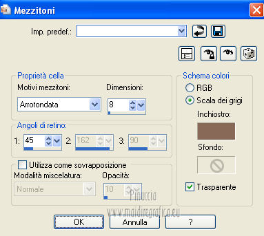 qui puoi trovare qualche risposta ai tuoi dubbi. Se l'argomento che ti interessa non è presente, ti prego di segnalarmelo. Questo tutorial è stato scritto con Corel X5, ma può essere eseguito anche con le precedenti versioni. Per tradurlo, ho usato PSP X. Occorrente: Un tube a scelta. Il resto del materiale qui Il poser usato è di Gerda. ![]() 1. Apri l'immagine di sfondo Hintergrund-happyeaster. L'immagine, che ha la dimensione di 800 x 800 pixels, sarà la base del tuo lavoro. Scegli due colori dal tuo tube. Per l'esempio: imposta il colore di primo piano con il colore chiaro #efe7d7, e il colore di sfondo con il colore scuro #886958. 2. Attiva lo strumento Forme - ellisse ![]() con i seguenti settaggi: ![]() Traccia un cerchio nell'angolo in alto a sinistra della dimensione di 400 x 400 pixels. Mentre tracci il cerchio puoi controllare la dimensione nella barra inferiore. ![]() Livelli>Converti in livello raster. 3. Effetti>Effetti artistici>Mezzitoni. ![]() 4. Effetti>Effetti di immagine>Scostamento. ![]() 5. Livelli>Duplica. Effetti>Effetti di immagine>Scostamento. ![]() questi settaggi presuppongono che la posizione di partenza sia la stessa del mio esempio. Se necessario, correggi la posizione dei cerchi usando lo strumento Spostamento ![]() 6. Attiva lo strumento Forme predefinite ![]() e seleziona Rettangolo arrotondato con i seguenti settaggi. ![]() Inverti i colori della paletta: colore di primo piano scuro - colore di sfondo chiaro. Traccia un rettangolo nell'angolo in alto a sinistra della dimensione 640 x 50 pixels. ![]() Livelli>Converti in livello raster. 7. Attiva lo strumento Bacchetta magica , sfumatura e tolleranza 0,e clicca al centro del rettangolo per selezionarlo. Effetti>Effetti di trama>Intessitura. ![]() 8. Selezione>Inverti. Regola>Aggiungi/Rimuovi disturbo>Aggiungi disturbo. ![]() Selezione>Deseleziona. 9. Effetti>Effetti di immagine>Scostamento. ![]() 10. Livelli>Duplica. Effetti>Effetti di immagine>Scostamento. ![]() 11. Livelli>Duplica. Effetti>Effetti di immagine>Scostamento. ![]() 12. Livelli>Unisci>Unisci giù - 2 volte. Effetti>Effetti 3D>Sfalsa ombra. ![]() 13. Attiva nuovamente lo strumento Forme predefinite - rettangolo arrotondato, con i settaggi precedenti. Traccia un rettangolo nell'angolo in alto a sinistra delle dimensioni 700 x 150 pixels. ![]() Livelli>Converti in livello raster. 14. Attiva lo strumento Bacchetta magica ![]() e clicca nel rettangolo per selezionarlo. Effetti>Effetti di trama>Trama - seleziona una trama a tua scelta, con i seguenti settaggi ![]() Selezione>Inverti. Regola>Aggiungi/Rimuovi disturbo>Aggiungi disturbo, con i settaggi precedenti. Selezione>Deseleziona. 15. Effetti>Effetti di immagine>Scostamento. ![]() Livelli>Duplica. Effetti>Effetti di immagine>Scostamento. ![]() Livelli>Unisci>Unisci giù. Effetti>Effetti 3D>Sfalsa ombra, con i settaggi precedenti. 16. Livelli>Nuovo livello raster. Attiva lo strumento Selezione ,clicca sull'icona Selezione personalizzata ![]() e imposta i seguenti settaggi: ![]() Riempi la selezione con il colore scuro di primo piano.Effetti>Effetti di trama>Trama, con i settaggi precedenti. Selezione>Deseleziona. 17. Effetti>Effetti 3D>Sfalsa ombra, con i settaggi precedenti. 18. Livelli>Nuovo livello raster. Selezione personalizzata ![]() ![]() Riempi la selezione con il colore chiaro di sfondo.Effetti>Effetti di trama>Trama, con i settaggi precedenti. Selezione>Deseleziona. Effetti>Effetti 3D>Sfalsa ombra, con i settaggi precedenti. 19. Livelli>Duplica. Effetti>Effetti di immagine>Scostamento. ![]() 20. Attiva lo strumento Forme - ellisse ![]() ![]() Inverti i colori della paletta: primo piano chiaro, sfondo scuro. Traccia un ovale nell'angolo in alto a sinistra della dimensione di 385 x 560 pixels. ![]() Livelli>Converti in livello raster. 21. Attiva lo strumento Bacchetta magica , sfumatura e tolleranza 0,e clicca al centro dell'ovale per selezionarlo. Effetti>Effetti di trama>Trama, con i settaggi precedenti. Selezione>Inverti. Regola>Aggiungi/Rimuovi disturbo>Aggiungi disturbo, con i settaggi precedenti. Selezione>Deseleziona. 22. Effetti>Effetti di immagine>Scostamento. ![]() Se tutto è andato bene, dovresti avere questo. ![]() Effetti>Effetti 3D>Sfalsa ombra, con i settaggi precedenti. 23. Apri il wordart "Happy Easter" e vai a Modifica>Copia. Torna al tuo lavoro e vai a Modifica>Incolla come nuovo livello. Spostalo sull'ellisse.Effetti>Effetti 3D>Sfalsa ombra, con i settaggi precedenti. 24. Apri il tuo tube e vai a Modifica>Copia. Torna al tuo lavoro e vai a Modifica>Incolla come nuovo livello. Immagine>Ridimensiona, se e quanto necessario, tutti i livelli non selezionato. Effetti>Effetti 3D>Sfalsa ombra, con i settaggi precedenti. 25. Aggiungi il tuo nome e/o il tuo watermark su un nuovo livello. Effetti>Effetti 3D>Sfalsa ombra, con settaggi a scelta. 26. Immagine>Aggiungi bordatura, 1 pixel, simmetriche, con il colore #46A1C6. Immagine>Aggiungi bordatura, 1 pixel, simmetriche, con il colore #efe7d7. Immagine>Aggiungi bordatura, 20 pixels, simmetriche, con il colore #886958. 27. Seleziona il bordo da 20 pixels con la bacchetta magica ![]() Effetti>Effetti di trama>Trama, con i settaggi precedenti. Effetti>Effetti 3D>Smusso a incasso. ![]() Selezione>Deseleziona. 28. Immagine>Aggiungi bordatura, 5 pixels, simmetriche, con il colore #efe7d7. Immagine>Aggiungi bordatura, 1 pixel, simmetriche, con il colore #886958. Salva in formato jpg. ![]() Se hai problemi o dubbi, o trovi un link non funzionante, o anche soltanto per un saluto, scrivimi. 29 Marzo 2013 |