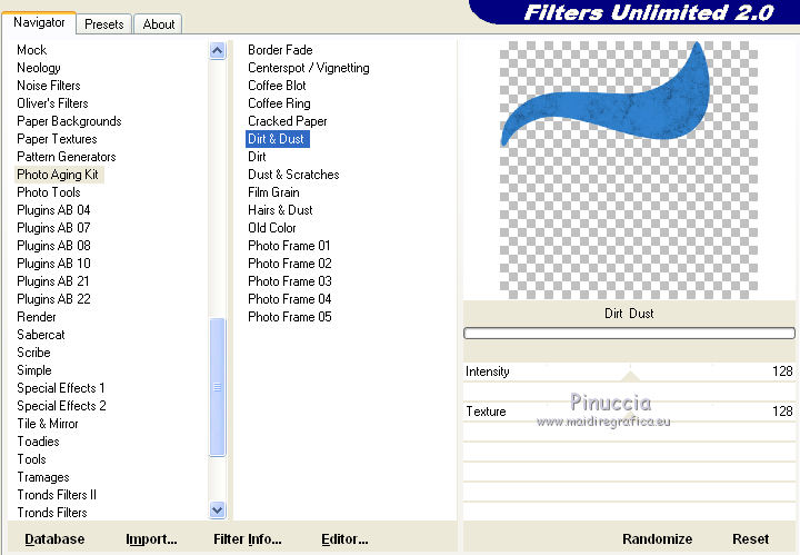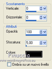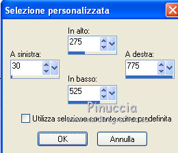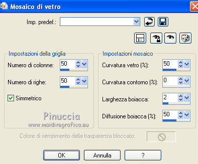 qui puoi trovare qualche risposta ai tuoi dubbi. Se l'argomento che ti interessa non è presente, ti prego di segnalarmelo. Questo tutorial è stato scritto con Corel X3, ma può essere eseguito anche con le precedenti versioni. Per tradurlo, ho usato PSP X. Occorrente: Un tube a scelta. Il resto del materiale qui I tubes che ho usato sono di Julia Caldas e NataliED. Filtri: Filters Unlimited 2.0 qui Photo Aging Kit qui Metti la forma happytail-kris nella cartella Forme predefinite e apri il resto del materiale in PSP. 1. Apri l'immagine di sfondo "hintergrund 1" che ha la corretta dimensione di 800 x 800 pixels. Questa immagine sarà la base del tuo lavoro. Scegli due colori dal tuo tube. Per il mio esempio ho impostato il colore di primo piano con il lilla #4d1d8b, e il colore di sfondo con il colore blu #3184d2. 2. Livelli>Nuovo livello raster. Attiva lo strumento Selezione ,clicca sull'icona Selezione personalizzata ![]() e imposta i seguenti settaggi: ![]() Riempi la selezione con il colore di primo piano.Selezione>Deseleziona. 3. Effetti>Effetti di trama>Mosaico di vetro. ![]() 4. Effetti>Effetti 3D>Sfalsa ombra: ![]() 5. Attiva lo strumento Forme predefinite ![]() e seleziona la forma "happytail-kris" con i seguenti settaggi. ![]() Chiudi il colore di primo piano. Partendo dall'angolo in alto a sinistra, disegna una forma di 650 x 325 pixels. Mentre tracci la forma puoi controlla la dimensione nella barra inferiore degli strumenti. ![]() Livelli>Converti in livello raster. 7. Effetti>Plugins>Filters Unlimited - Photo Aging Kit - Dirt & Dust, con i settaggi standard. ![]() Effetti>Effetti 3D>Sfalsa ombra, con i settaggi precedenti. Sposta la forma in basso come nell'esempio.![]() 8. Livelli>Duplica. Immagine>Rifletti. Immagine>Capovolgi. E dovresti avere questo. ![]() 9. Livelli>Nuovo livello raster. Attiva lo strumento Selezione , cerchio,e traccia un cerchio di 612 x 612 pixels. Riempi la selezione con il colore di primo piano.Selezione>Modifica>Contrai - 10 pixels. Effetti>Effetti 3D>Sfalsa ombra, come al punto 4. Mantieni selezionato. 10. Livelli>Nuovo livello raster. Apri il tube del paesaggio e vai a Modifica>Copia. Torna al tuo lavoro e vai a Modifica>Incolla nella selezione. Selezione>Deseleziona. Livelli>Unisci>Unisci giù. Effetti>Effetti 3D>Sfalsa ombra, come al punto 4. Sposta il cerchio al centro dell'immagine.11. Apri i tubes dei pipistrelli - Fledermaus1 e Fledermaus2 - copiali e incollali sul tuo lavoro. Posiziona i tubes in alto, come nel mio esempio.Effetti>Effetti 3D>Sfalsa ombra, come al punto 4. 12. Apri il tube "Halloweenwordart". Scegli un testo e selezionalo ![]() Modifica>Copia. Torna al tuo lavoro e vai a Modifica>Incolla come nuovo livello. Sposta il testo in basso a destra.Effetti>Effetti 3D>Sfalsa ombra, come al punto 4. 13. Apri il tuo tube e vai a Modifica>Copia. Torna al tuo lavoro e vai a Modifica>Incolla come nuovo livello. Spostalo al centro.Effetti>Effetti 3D>Sfalsa ombra. ![]() 15. Aggiungi il tuo testo, il tuo nome e/o il tuo watermark su un nuovo livello. Effetti>Effetti 3D>Sfalsa ombra, con settaggi a scelta. 16. Immagine>Aggiungi bordatura, 2 pixels, simmetriche, con il colore #000000. Immagine>Aggiungi bordatura, 2 pixels, simmetriche, con il colore#3184D2. Immagine>Aggiungi bordatura, 2 pixels, simmetriche, con il colore #4D1D8B. Immagine>Aggiungi bordatura, 2 pixels, simmetriche, con il colore #3184D2. Immagine>Aggiungi bordatura, 2 pixels, simmetriche, con il colore #000000. Hai finito. Puoi salvare il tuo lavoro in formato jpg. ![]() Se hai problemi o dubbi, o trovi un link non funzionante, o anche soltanto per un saluto, scrivimi. 30 Ottobre 2010 |
