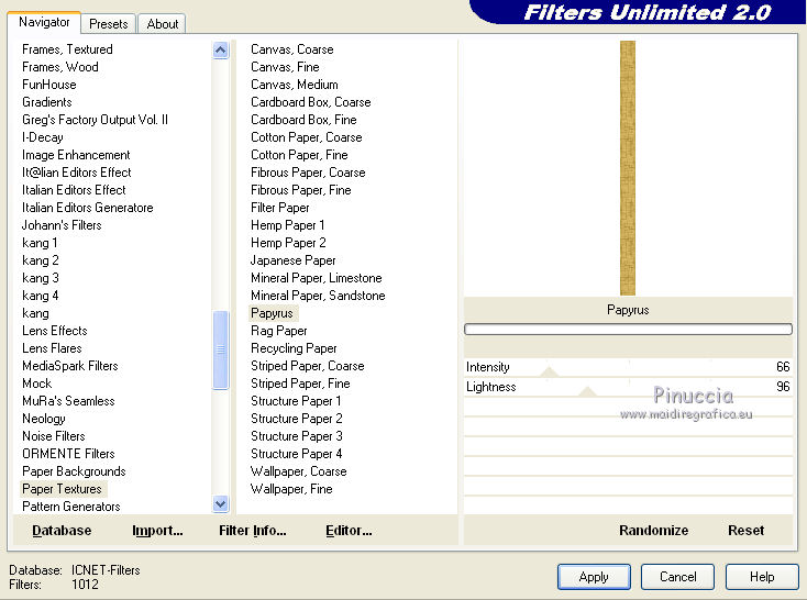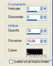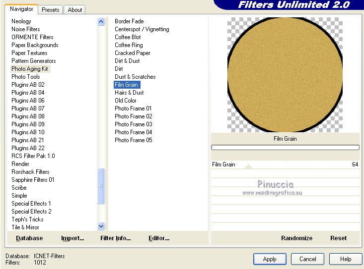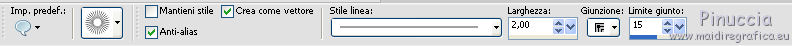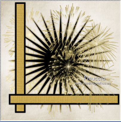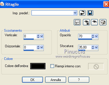 qui puoi trovare qualche risposta ai tuoi dubbi. Se l'argomento che ti interessa non è presente, ti prego di segnalarmelo. Questo tutorial è stato scritto con Corel X3, ma può essere eseguito anche con le precedenti versioni. Per tradurlo, ho usato PSP X. Occorrente: Materiale qui Filtri. Graphics Plus - Cross Shadow qui Filters Unlimited 2.0 qui Photo Aging Kit qui ![]() Metti la forma "Urchin32Plain" nella cartella Forme predefinite. 1. Apri l'immagine di sfondo "Sm_Berry09", che ha la corretta dimensione di 800 x 800 pixels. Questa sarà la base del tuo lavoro. Scegli due colori dal tuo tube. Per l'esempio: Imposta il colore di primo piano con il colore dorato #cbab58, e il colore di sfondo con il colore nero #000000. 2. Apri il tube "el63" e vai a Modifica>Copia. Torna al tuo lavoro e vai a Modifica>Incolla come nuovo livello. Apri il tube "el64" e vai a Modifica>Copia. Torna al tuo lavoro e vai a Modifica>Incolla come nuovo livello. Posiziona gli elementi vicino ai bordi, uno a destra e uno a sinistra.3. Attiva lo strumento Forme predefinite ![]() cerca e seleziona la forma "urchin32Plain2 con i seguenti settaggi. ![]() Lascia i colori come impostati all'inizio, e partendo dall'angolo in alto a sinistra disegna una forma di 700 x 700 pixels. ![]() Livelli>Converti in livello raster. Sposta la forma in mezzo all'immagine.5. Effetti>Effetti 3D>Sfalsa ombra. ![]() 6. Livelli>Nuovo livello raster. Attiva lo strumento Selezione ,clicca sull'icona Selezione personalizzata ![]() e imposta i seguenti settaggi: ![]() Riempi la selezione con il colore di sfondo.7. Selezione>Modifica>Contrai - 10 pixels. Riempi con il colore di primo piano.8. Effetti>Plugins>Filters Unlimited 2.0 - Paper Texture - Papyrus con i settaggi standard. ![]() Selezione>Deseleziona. Effetti>Effetti 3D>Sfalsa ombra, come al punto 5. 9. Livelli>Duplica. Immagine>Ruota per gradi - 90 gradi a destra. ![]() 10. Sposta la forma come nell'esempio.![]() 11. Livelli>Nuovo livello raster. Attiva lo strumento Selezione , cerchio,e traccia un cerchio di 466 x 466 pixels. mentre tracci la forma puoi controllare la dimensione nella barra inferiore Riempi la selezione con il colore di sfondo.12. Selezione>Modifica>Contrai - 10 pixels. Riempi la selezione con il colore di primo piano.13. Effetti>Plugins>Filters Unlimited 2.0 - Photo Aging Kit - Film grain. ![]() 14. Selezione>Deseleziona. Effetti>Effetti 3D>Sfalsa ombra, come al punto 5. 14. Livelli>Nuovo livello raster. Attiva nuovamente lo strumento Selezione , cerchio,e traccia un cerchio di 356 x 356 pixels, e riempi la selezione con il colore di sfondo.15. Selezione>Modifica>Contrai - 10 pixels. Riempi la selezione con il colore di primo piano.Effetti>Plugins>Filters Unlimited 2.0 - Photo Aging Kit - Film grain, con i settaggi precedenti. Selezione>Deseleziona. Effetti>Effetti 3D>Sfalsa ombra, come al punto 5. Sposta i cerchi come nell'esempio.![]() 16. Apri il tube "anreggn" e vai a Modifica>Copia. Torna al tuo lavoro e vai a Modifica>Incolla come nuovo livello. Immagine>Ridimensiona, all'80%, tutti i livelli non selezionato. Spostalo nel cerchio in alto.17. Apri il tube con il testo "fly-nj05" e vai a Modifica>Copia. Torna al tuo lavoro e vai a Modifica>Incolla come nuovo livello. Immagine>Ridimensiona, all'80%, tutti i livelli non selezionato. Spostalo nel cerchio in basso.Effetti>Effetti 3D>Sfalsa ombra. ![]() 18. Apri il tube "casinoladyromana1s" e vai a Modifica>Copia. Torna al tuo lavoro e vai a Modifica>Incolla come nuovo livello. Immagine>Ridimensiona, all'80%, tutti i livelli non selezionato. Spostalo al centro dell'immagine.Effetti>Effetti 3D>Sfalsa ombra, come al punto 5. ![]() 19. Attiva lo strumento Testo ,e scrivi il tuo nome e/o aggiungi il tuo watermark. Effetti>Effetti 3D>Sfalsa ombra, con settaggi a tua scelta. 20. Immagine>Aggiungi bordatura, 1 pixel, simmetriche, con il colore nero #000000. Immagine>Aggiungi bordatura, 5 pixels, simmetriche, con il colore #cbab58. Seleziona questo bordo con la bacchetta magica , sfumatura e tolleranza 0.21. Effetti>Plugins>Graphics Plus - Cross Shadow, con i settaggi standard. ![]() Effetti>Effetti 3D>Smusso a incasso. ![]() 22. Selezione>Inverti. Effetti>Effetti 3D>Ritaglio. ![]() Selezione>Deseleziona. 23. Immagine>Aggiungi bordatura, 1 pixel, simmetriche, con il colore nero #000000. Salva in formato jpg. Se hai problemi o dubbi, o trovi un link non funzionante, o anche soltanto per dirmi che ti è piaciuto, 14 Novembre 2011 |
