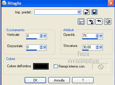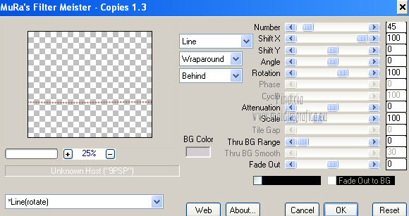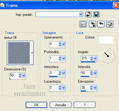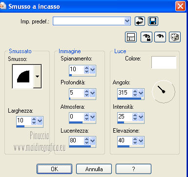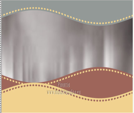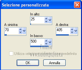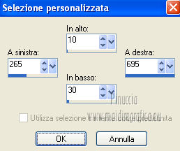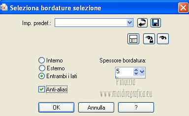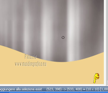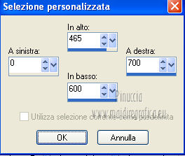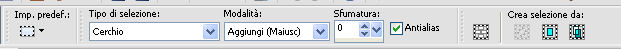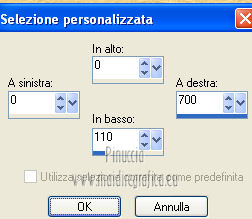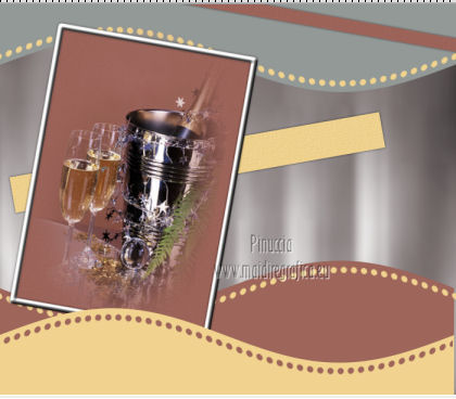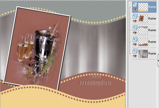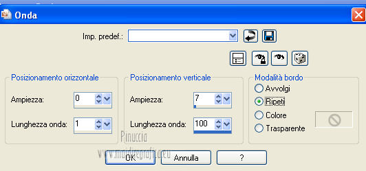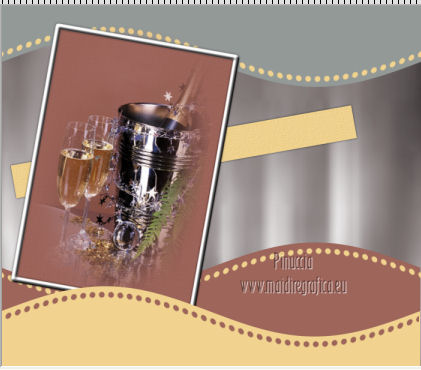qui puoi trovare qualche risposta ai tuoi dubbi. Se l'argomento che ti interessa non è presente, ti prego di segnalarmelo. Questo tutorial è stato scritto con Corel X5, ma può essere eseguito anche con le precedenti versioni. Per tradurlo, ho usato PSP X. Occorrente: Un tube a scelta. Il resto del materiale qui Il tube usato è di Thafs. Filtri: Mura's Meister - Copies qui Animation Shop qui ![]() Metti la trama textur-34 nella cartella Trame. 1. Apri una nuova immagine trasparente 700 x 600 pixels. Imposta il colore di primo piano con il colore chiaro #f0d38f, e il colore di sfondo con il colore scuro #9e655b. 2. Selezione>Seleziona tutto. Apri l'immagine di sfondo "hg" e vai a Modifica>Copia. Torna al tuo lavoro e vai a Modifica>Incolla nella selezione. Selezione>Deseleziona. 3. Livelli>Nuovo livello raster. Attiva lo strumento Selezione ,clicca sull'icona Selezione personalizzata ![]() e imposta i seguenti settaggi: ![]() Riempi la selezione con il colore chiaro di primo piano.Selezione>Deseleziona. 4. Effetti>Effetti di distorsione>Onda. ![]() 5. Livelli>Nuovo livello raster. Attiva lo strumento Selezione , cerchio![]() Traccia un piccolo cerchio di 10x10 pixels, puoi controllarne la dimensione nella barra inferiore degli strumenti. ![]() Riempi la selezione con il colore di sfondo.Selezione>Deseleziona. 6. Effetti>Plugins>Mura's Meister - Copies. ![]() Effetti>Effetti di distorsione>Onda, come al punto 4. Sposta la linea dei pallini un po' più in basso,sull'onda chiara. ![]() Livelli>Unisci>Unisci giù. 7. Livelli>Nuovo livello raster. Selezione personalizzata , con i settaggi precedenti![]() Riempi con il colore scuro di sfondo.Selezione>Deseleziona. 8. Effetti>Effetti di distorsione>Onda, con i settaggi precedenti. Livelli>Nuovo livello raster. Traccia un altro cerchio di 10x10 pixels, e riempi la selezione con il colore chiaro di primo piano.Selezione>Deseleziona. Effetti>Plugins>Mura's Meister - Copies, con i settaggi precedenti. Posiziona correttamente i cerchi.Livelli>Unisci>Unisci giù. Immagine>Rifletti. Livelli>Disponi>Sposta giù. Posiziona le due immagini come nell'esempio.![]() 9. Livelli>Nuovo livello raster. Selezione personalizzata ![]() ![]() Imposta il colore di primo piano con #939997, e riempi la selezione con questo colore.Selezione>Deseleziona. Effetti>Effetti di distorsione>Onda, con i settaggi precedenti. Livelli>Nuovo livello raster. Traccia un altro cerchio di 10x10 pixels. Imposta nuovamente il colore di primo piano con il colore giallo, e riempi la selezione con il colore chiaro di primo piano.Selezione>Deseleziona. Effetti>Plugins>Mura's Meister - Copies, con i settaggi precedenti. 10. Posiziona i cerchi sull'onda.Livelli>Unisci>Unisci giù. Sposta l'immagine in alto, come nell'esempio.![]() 11. Livelli>Nuovo livello raster. Selezione personalizzata ![]() ![]() 12. Selezione>Modifica>Seleziona bordature selezione. ![]() Imposta il colore di primo piano con #c0c0c0. Riempi la selezione con il colore di primo piano.13. Effetti>Effetti 3D>Smusso a incasso. ![]() Selezione>Deseleziona. 14. Attiva lo strumento Bacchetta magica , sfumatura e tolleranza 0,e clicca al centro della cornice per selezionarla. Selezione>Modifica>Espandi - 3 pixels. 15. Livelli>Nuovo livello raster. Riempi con il colore scuro di sfondo.Effetti>Effetti di trama>Trama - seleziona la trama Textur-34 con i seguenti settaggi. ![]() Selezione>Deseleziona. Livelli>Disponi>Sposta giù. 16. Apri il tube dei bicchieri e vai a Modifica>Copia. Torna al tuo lavoro e vai a Modifica>Incolla come nuovo livello. Immagine>Ridimensiona, se e quanto necessario, tutti i livelli non selezionato. Posiziona correttamente i bicchieri nella cornice.Eventualmente, usa lo strumento Deformazione (tasto D) ,per adattare il tube all'area della cornice. 17. Attiva il livello della cornice. Effetti>Effetti 3D>Sfalsa ombra. ![]() Livelli>Unisci>Unisci giù - 2 volte. Immagine>Ruota per gradi - 10 gradi a destra. ![]() Attiva il livello dell'onda giallo (Raster 2). Livelli>Disponi>Porta in alto. Posiziona i livelli come nell'esempio.![]() 18. Attiva il livello superiore. Livelli>Nuovo livello raster. Selezione personalizzata ![]() ![]() Riempi la selezione con il colore giallo.19. Effetti>Effetti di trama>Trama, come al punto 15. Selezione>Deseleziona. Effetti>Effetti 3D>Sfalsa ombra, come al punto 17. Immagine>Ruota per gradi - 10 gradi a sinistra. ![]() 20. Livelli>Disponi>Sposta giù - 2 volte. ![]() 21. Attiva il livello superiore. Livelli>Nuovo livello raster. Selezione personalizzata ![]() ![]() Riempi con il colore scuro di sfondo.22. Effetti>Effetti di trama>Trama, come al punto 15. Selezione>Deseleziona. Effetti>Effetti 3D>Sfalsa ombra, come al punto 17. Immagine>Ruota per gradi - 10 gradi a destra. ![]() 23. Posiziona la striscia come nell'esempio.![]() 24. Apri il tuo tube e vai a Modifica>Copia. Torna al tuo lavoro e vai a Modifica>Incolla come nuovo livello. Immagine>Ridimensiona, se e quanto necessario, tutti i livelli non selezionato. Spostalo a destra della cornice.Effetti>Effetti 3D>Sfalsa ombra. ![]() 25. Apri il tube di testo "Happy New Year" e vai a Modifica>Copia. Torna al tuo lavoro e vai a Modifica>Incolla come nuovo livello. Immagine>Ridimensiona, all'80%, tutti i livelli non selezionato. Spostalo in basso a sinistra.26. Attiva lo strumento Testo ![]() scrivi il tuo nome e, se vuoi, aggiungi il tuo watermark. Effetti>Effetti 3D>Sfalsa ombra, come al punto 17. 27. Immagine>Aggiungi bordatura, 20 pixels, simmetriche, con il colore #c0c0c0. Selezione questo bordo con la bacchetta magica .Effetti>Effetti 3D>Smusso a incasso, come al punto 13. Selezione>Inverti. Effetti>Effetti 3D>Ritaglio. ![]() Selezione>Deseleziona. 28. Modifica>Copia. Apri Animation Shop e vai a Modifica>Incolla>Incolla come nuova animazione. Modifica>Duplica, e ripeti finchè non avrai 18 fotogrammi. Clicca sul primo fotogramma per selezionarlo e vai a Modifica>Seleziona tutto. Apri l'animazione "Nm_Firework_Left_Anime1". El