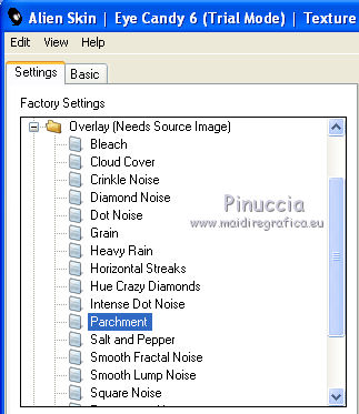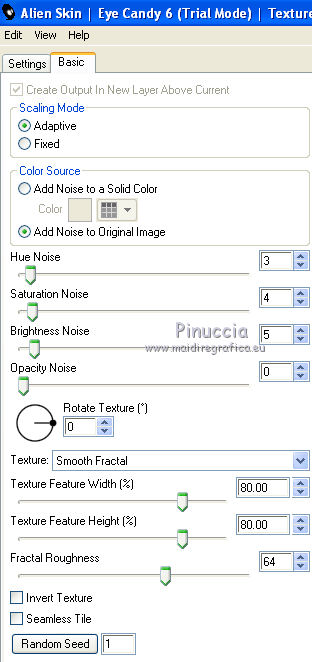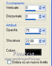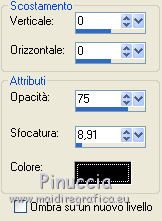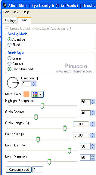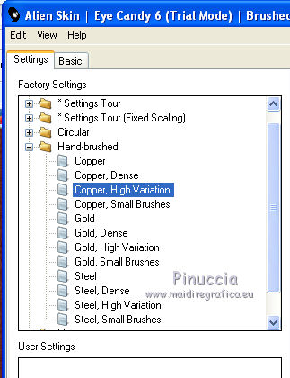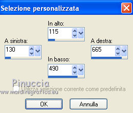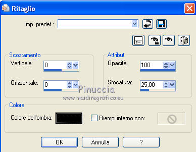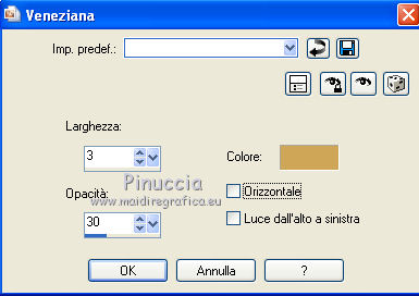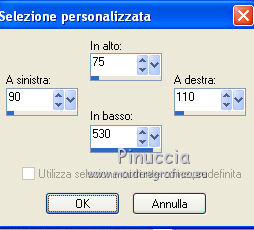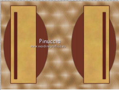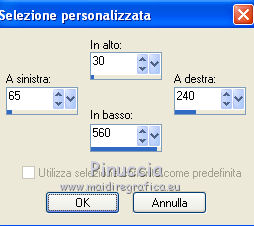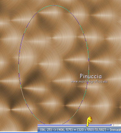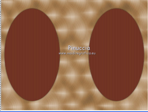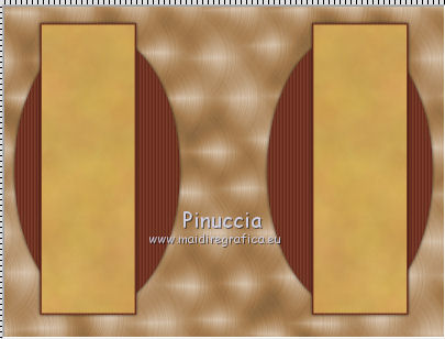 qui puoi trovare qualche risposta ai tuoi dubbi. Se l'argomento che ti interessa non è presente, ti prego di segnalarmelo. Questo tutorial è stato scritto con PSP Corel X2, ma può essere eseguito anche con le precedenti versioni. Per tradurlo, ho usato PSP X. Occorrente: Un tube a scelta. Il resto del materiale qui Per il mio esempio ho usato un poser ©Laguna Azul. Filtri. Alien Skin Eye Candy 6 - demo 30 giorni qui 1. Apri una nuova immagine trasparente 800 x 600 pixels. Scegli due colori dai tuoi tubes. Per il mio esempio ho usato come colore di primo piano il colore scuro #60221c, e come colore di sfondo il colore chiaro #cfa557. 2. Effetti>Plugins>Alien skin Eye Candy 6 - Brushed Metal. (non preoccuparti per il colore della paletta "Metal color"; dopo potrai adattare il risultato ai tuoi colori): ![]() 3. Regola>Tonalità e saturazione>Viraggio. ![]() 4. Livelli>Nuovo livello raster. Attiva lo strumento Selezione , ellisse,e disegna un'ellisse di circa 320 x 550 pixels. Mentre tracci la forma puoi controllare la dimensione nella barra inferiore. ![]() Riempi la forma con il colore di primo piano.5. Effetti>Effetti di trama>Veneziana: ![]() Selezione>Deseleziona. 6. Effetti>Effetti 3D>Sfalsa ombra: ![]() 7. Livelli>Duplica. Posiziona le forme come nell'esempio.![]() 8. Livelli>Nuovo livello raster. Attiva lo strumento Selezione ,clicca sull'icona Selezione personalizzata ![]() e imposta i seguenti settaggi: ![]() Riempi la selezione con il colore di primo piano.Effetti>Effetti di trama>Veneziana, come al punto 5. 9. Selezione>Modifica>Contrai - 3 pixels. Riempi con il colore di sfondo.Effetti>Plugins>Alien Skin Eye Candy 6 - Texture Noise. ![]() 10. Selezione>Deseleziona. Effetti>Effetti 3D>Sfalsa ombra, come al punto 6. Livelli>Duplica. Immagine>Rifletti. Dovresti avere questo. ![]() 11. Livelli>Nuovo livello raster. Selezione personalizzata ![]() ![]() Riempi con il colore di primo piano.Selezione>Deseleziona. 12. Effetti>Effetti 3D>sfalsa ombra, come al punto 6. Livelli>Duplica. Immagine>Rifletti. Dovresti avere questo. ![]() 13. Livelli>Nuovo livello raster. Selezione personalizzata ![]() ![]() Riempi la selezione con il colore di primo piano.Effetti>Effetti di trama>Veneziana, come al punto 5. 14. Selezione>Modifica>Contrai - 3 pixels. Riempi con il colore di sfondo.15. Apri il tube con il paesaggio e vai a Modifica>Copia. Torna al tuo lavoro e vai a Modifica>Incolla come nuovo livello. Posiziona correttamente il tube nell'area selezionata.Selezione>Inverti. Premi sulla tastiera il tasto CANC. 16. Selezione>Deseleziona. Livelli>Unisci>Unisci giù. Effetti>Effetti 3D>Sfalsa ombra, come al punto 6. 17. Apri il tube jbcaneheart1 e vai a Modifica>Copia. Torna al tuo lavoro e vai a Modifica>Incolla come nuovo livello. Spostalo in basso a destra.Effetti>Effetti 3D>Sfalsa ombra, come al punto 6. 18. Apri il tube con gli ornamenti e vai a Modifica>Copia. Torna al tuo lavoro e vai a Modifica>Incolla come nuovo livello. Spostalo in alto a destra, vedi il mio esempio.Effetti>Effetti 3D>Sfalsa ombra, come al punto 6. 19. Apri il tube con il testo e vai a Modifica>Copia. Torna al tuo lavoro e vai a Modifica>Incolla come nuovo livello. Spostalo in alto al centro.20. Apri il tuo tube e vai a Modifica>Copia. Torna al tuo lavoro e vai a Modifica>Incolla come nuovo livello. Immagine>Ridimensiona, se e quanto necessario. Spostalo a sinistra.Effetti>Effetti 3D>Sfalsa ombra: ![]() 21. Attiva lo strumento Testo , scegli un font e scrivi un testo sull'immagine,o il tuo nome e/o il tuo watermark. Non dimenticare eventuali copyright delle immagini che hai usato. Effetti>Effetti 3D>Sfalsa ombra, con un settaggio a tua scelta. 22. Immagine>Aggiungi bordatura, 5 pixels, simmetriche, con il colore #60221c. Immagine>Aggiungi bordatura, 5 pixels, simmetriche, con il colore #cfa557. Immagine>Aggiungi bordatura, 5 pixels, simmetriche, con il colore #60221c. 23. Selezione>Seleziona tutto. Selezione>Modifica>Contrai - 15 pixels. Effetti>Effetti 3D>Ritaglio: ![]() Selezione>Deseleziona. Hai finito. Puoi salvare in formato jpg. ![]() Se hai problemi o dubbi, o trovi un link non funzionante, o anche soltanto per un saluto, scrivimi. 22 Dicembre 2009 |