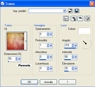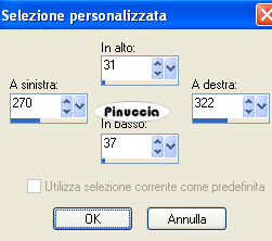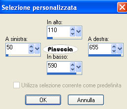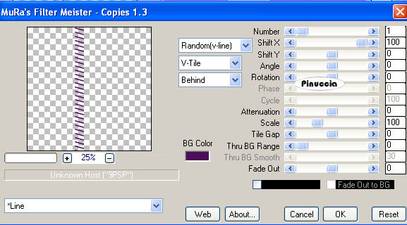 qui puoi trovare qualche risposta ai tuoi dubbi. Se l'argomento che ti interessa non è presente, ti prego di segnalarmelo. Questo tutorial è stato scritto con PSP Corel X2, ma può essere eseguito anche con le precedenti versioni. Per tradurlo, ho usato PSP X. Occorrente: Un tube a scelta. Il resto del materiale qui I tubes che ho usato per i miei esempi sono di Luz Cristina e Jet. 1. Apri una nuova immagine trasparente 700 x 700 pixels. Scegli due colori dal tuo tube. Per il mio esempio ho usato come colore di primo piano il colore chiaro #CFC2DC, e come colore di sfondo il colore scuro #4C0E58. 2. Selezione>Seleziona tutto. Apri il file di sfondo "hg02" e vai a Modifica>Copia. Torna al tuo lavoro e vai a Modifica>Incolla nella selezione. Selezione>Deseleziona. 3. Livelli>Nuovo livello raster. Attiva lo strumento Selezione ,clicca sull'icona Selezione personalizzata ![]() e imposta i seguenti settaggi: ![]() Riempi la selezione con il colore scuro di sfondo.4. Effetti>Effetti di trama>Trama, seleziona una trama a tua scelta, con i seguenti settaggi: ![]() Selezione>Deseleziona. 5. Effetti>Effetti 3D>sfalsa ombra, con i seguenti settaggi. ![]() 6. Livelli>Nuovo livello raster. Selezione personalizzata :![]() Riempi la selezione con il colore chiaro di primo piano.Effetti>Effetti di trama>Trama, come al punto 4. Effetti>effetti 3D>sfalsa ombra, come al punto 5. Selezione>Deseleziona. 7. Livelli>Duplica. Immagine>Rifletti. Dovresti avere questo: ![]() 8. Livelli>Nuovo livello raster. Selezione personalizzata :![]() Riempi la selezione con il colore scuro di sfondo.9. Selezione>Deseleziona. Immagine>Ruota per gradi - 15 gradi a destra: ![]() 10. Effetti>Plugins>Mura's Meister - Copies, con i seguenti settaggi: ![]() Sposta l'immagine sulla striscia chiara a sinistra.Attiva lo strumento Selezione a mano libera , da punto a punto:![]() Seleziona le righe al di fuori del rettangolo. ![]() Premi sulla tastiera il tasto CANC. Selezione>Deseleziona. Livelli>Duplica. 11. Sposta le linee un po' più in basso, sfalsandole sulle precedenti.![]() 12. Livelli>Unisci>Unisci giù. Livelli>Duplica, e sposta il livello un po' più a destra.![]() Livelli>Unisci>Unisci giù. Livelli>Duplica. Immagine>Rifletti. E dovresti avere questo. ![]() Effetti>Effetti 3D>Sfalsa ombra: ![]() 14. Livelli>Nuovo livello raster. Attiva lo strumento Selezione , cerchio,e traccia una cerchio della dimensione di 470 x 470 pixels. mentre disegni il cerchio, puoi controllare la dimensione nella barra inferiore. ![]() Riempi la selezione con il colore chiaro di primo piano.Selezione>Modifica>Contrai - 20 pixels. Riempi la selezione con il colore scuro di sfondo.Effetti>Effetti di trama>Trama, come al punto 4. 15. Effetti>Effetti 3D>sfalsa ombra, come al punto 5. ![]() Selezione>Deseleziona. Ripeti l'Effetto Sfalsa ombra. Posiziona il cerchio un po' più in alto al centro.Dovresti avere questo. ![]() 16. Apri il tube Lucious Lip Kandee. Attiva lo strumento Selezione a mano libera , da punto a punto,e seleziona una bocca. Modifica>Copia. Torna al tuo lavoro e vai a Modifica>Incolla come nuovo livello. Immagine>Ridimensiona, 2 volte all'80%, tutti i livelli non selezionato. Immagine>Ruota per gradi - 15 gradi a destra. ![]() nel mio esempio ho colorizzato il tube per adattarlo ai colori della tag. Regola>Tonalità e Saturazione>Viraggio: ![]() Sposta le labbra a destra, come nel mio esempio.Effetti>Effetti 3D>sfalsa ombra, come al punto 5. 17. Attiva nuovamente il tube delle bocche. Selezione>Deseleziona. Seleziona un'altra bocca.Modifica>copia. Torna al tuo lavoro e vai a Modifica>Incolla come nuovo livello. Immagine>ruota per gradi - 15 gradi a sinistra: ![]() Regola>Tonalità e saturazione>Viraggio, con i settaggi precedenti. Sposta le labbra a sinistra, come nel mio esempio.Effetti>Effetti 3D>sfalsa ombra, come al punto 5. 18. Apri il tuo tube e vai a Modifica>Copia. Torna al tuo lavoro e vai a Modifica>Incolla come nuovo livello. Posiziona come ti sembra meglio.Effetti>Effetti 3D>sfalsa ombra, con i seguenti settaggi, con il colore chiaro di primo piano. ![]() 19. Attiva lo strumento Testo , scegli un font e scrivi il primo testo ("just being").A tua scelta, applica l'Effetto Sfalsa ombra. 20. Cambia il font e scrivi "Myself". Applica l'Effetto Sfalsa ombra che preferisci. 21. Aggiungi il tuo nome e/o il tuo watermark. Applica l'Effetto Sfalsa ombra. 22. Immagine>Aggiungi bordatura, 2 pixels, simmetriche, con il colore #4C0E58. Immagine>Aggiungi bordatura, 2 pixels, simmetriche, con il colore #CFC2DC. Immagine>Aggiungi bordatura, 20 pixels, simmetriche, con il colore #4C0E58. Seleziona questo bordo con la bacchetta magica , sfumatura e tolleranza 0,![]() Effetti>Plugins>Graphics Plus - Cross Shadow, con i settaggi standard. ![]() Selezione>Deseleziona. Immagine>Aggiungi bordatura, 2 pixels, simmetriche, con il colore #CFC2DC. Immagine>Aggiungi bordatura, 2 pixels, simmetriche, con il colore #4C0E58. 24. Effetti>Plugins>Xero - Porcelain, con i settaggi standard. ![]() Salva in formato jpg. ![]() Se hai problemi o dubbi, o trovi un link non funzionante, o anche soltanto per un saluto, scrivimi. 28 Maggio 2009 |
