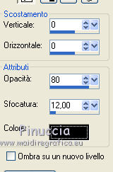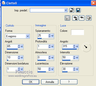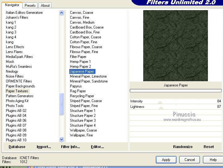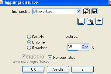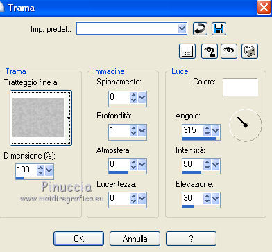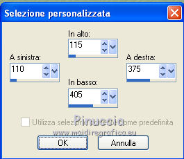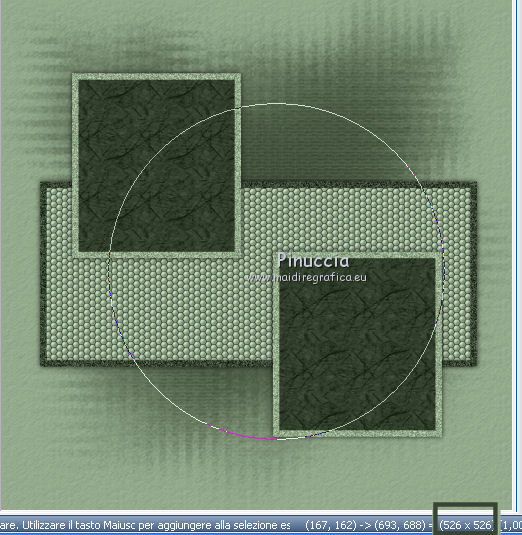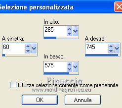 qui puoi trovare qualche risposta ai tuoi dubbi. Se l'argomento che ti interessa non è presente, ti prego di segnalarmelo. Questo tutorial è stato scritto con Corel X3, ma può essere eseguito anche con le precedenti versioni. Per tradurlo, ho usato PSP X. Occorrente: Materiale qui Filtri. Filters Unlimited 2.0 qui ![]() Apri la maschera in PSP e minimizzala con il resto del materiale. 1. Apri una nuova immagine trasparente 800 x 800 pixels. Scegli due colori dal tuo tube. Per l'esempio: Imposta il colore di primo piano con il colore chiaro #95ac8d, e il colore di sfondo con il colore scuro #374532. 2. Riempi l'immagine trasparente con il colore scuro di sfondo.Effetti>Effetti di trama>Trama: ![]() 3. Livelli>Nuovo livello raster. Riempi con il colore chiaro di primo piano.Effetti>Effetti di trama>Trama, con i settaggi precedenti. 4. Livelli>Nuovo livello maschera>Da immagine. Apri il menu sotto la finestra di origine e vedrai la lista dei files aperti. Seleziona la maschera Maske1, con i seguenti settaggi: ![]() Livelli>Elimina e rispondi sì alla domanda unire la maschera nel livello corrente. ![]() Livelli>Unisci>Unisci gruppo. 5. Livelli>Nuovo livello raster. Attiva lo strumento Selezione , clicca sull'icona Selezione personalizzata ![]() e imposta i seguenti settaggi. ![]() Riempi la selezione con il colore di sfondo.6. Regola>Aggiungi/Rimuovi disturbo>Aggiungi disturbo. ![]() 7. Selezione>Modifica>Contrai - 10 pixels. Riempi la selezione con il colore di primo piano.Effetti>Effetti di trama>Ciottoli. ![]() Selezione>Deseleziona. 8. Effetti>Effetti 3D>Sfalsa ombra. ![]() 9. Livelli>Nuovo livello raster. Selezione personalizzata ![]() ![]() Riempi la selezione con il colore primo piano.Regola>Aggiungi/Rimuovi disturbo>Aggiungi disturbo, come al punto 6. 10. Selezione>Modifica>Contrai - 10 pixels. Riempi con il colore di sfondo.Effetti>Plugins>Filters Unlimited 2.0 - Paper Textures - Japanese Paper. ![]() Selezione>Deseleziona. Effetti>Effetti 3D>Sfalsa ombra, come al punto 8. 11. Livelli>Duplica. Immagine>Rifletti. Immagine>Capovolgi. Dovresti avere questo. ![]() 12. Livelli>Nuovo livello raster. Attiva lo strumento Selezione , cerchio,e traccia un cerchio di 526 x 526 pixels. ![]() 13. Passa il colore di primo piano a Gradiente. ![]() Riempi la selezione con il gradiente.Selezione>Deseleziona. Sposta il cerchio al centro dell'immagine.Effetti>Effetti 3D>Sfalsa ombra, come al punto 8. 14. Apri il tube Mira_Christmas-2008 e vai a Modifica>Copia. Torna al tuo lavoro e vai a Modifica>Incolla come nuovo livello. Immagine>Ridimensiona, 3 volte all'80%, tutti i livelli non selezionato. Sposta il tube a destra, come nel mio esempio.Effetti>Effetti 3D>Sfalsa ombra, come al punto 8. 15. Apri il tuo tube e vai a Modifica>Copia. Torna al tuo lavoro e vai a Modifica>Incolla come nuovo livello. Immagine>Ridimensiona, all'80%, tutti i livelli non selezionato. Spostalo a sinistra.Effetti>Effetti 3D>Sfalsa ombra, come al punto 8. 16. Apri il file con il testo e vai a Modifica>Copia. Torna al tuo lavoro e vai a Modifica>Incolla come nuovo livello. Immagine>Ridimensiona, all'80%, tutti i livelli non selezionato. Spostalo in basso, come nel mio esempio.Effetti>Effetti 3D>Sfalsa ombra, come al punto 8. 17. Attiva lo strumento Testo ,e scrivi il tuo nome e/o aggiungi il tuo watermark. Effetti>Effetti 3D>Sfalsa ombra, con settaggi a tua scelta. 18. Immagine>Aggiungi bordatura, 1 pixel, simmetriche, con il colore scuro #374532. Immagine>Aggiungi bordatura, 30 pixels, simmetriche, con il colore chiaro #95ac8d. Seleziona questo bordo con la bacchetta magica , sfumatura e tolleranza 0,e riempilo con il gradiente.Selezione>Inverti. Effetti>Effetti 3D>Sfalsa ombra, come al punto 8. Selezione>Deseleziona. 19. Immagine>Aggiungi bordatura, 1 pixel, simmetriche, con il colore #374532. Salva in formato jpg. Se hai problemi o dubbi, o trovi un link non funzionante, o anche soltanto per un saluto, scrivimi. 14 Novembre 2011 |