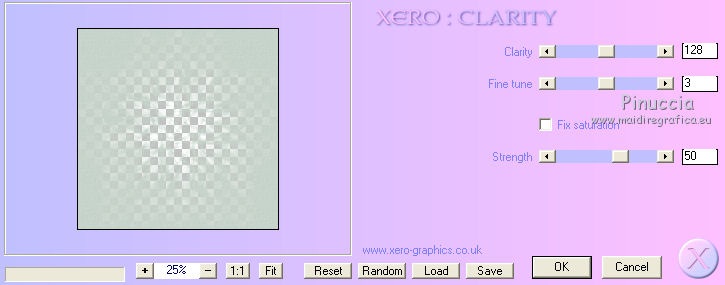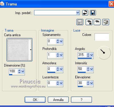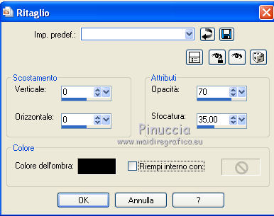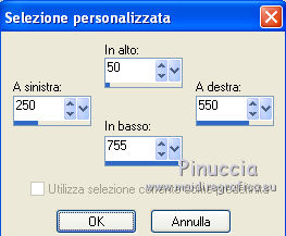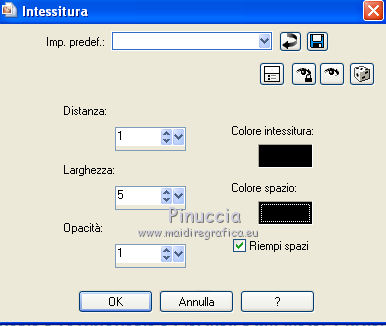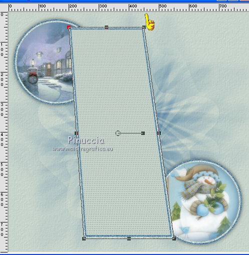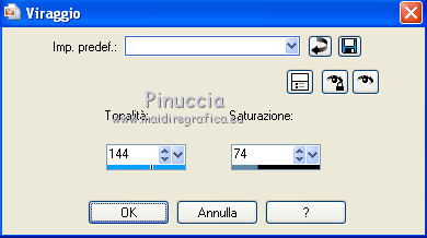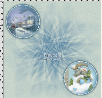 qui puoi trovare qualche risposta ai tuoi dubbi. Se l'argomento che ti interessa non è presente, ti prego di segnalarmelo. Questo tutorial è stato scritto con Corel X3, ma può essere eseguito anche con le precedenti versioni. Per tradurlo, ho usato PSP X. Occorrente: Materiale qui Filtri. Xero - Clarity qui Xero - Porcelain qui ![]() Apri la maschera in PSP e minimizzala con il resto del materiale. 1. Apri una nuova immagine trasparente 800 x 800 pixels. Scegli due colori dal tuo tube. Per l'esempio: Imposta il colore di primo piano con il colore chiaro #c8d5cc, e il colore di sfondo con il colore scuro #618ca8. 2. Riempi l'immagine trasparente con il colore scuro di sfondo.Effetti>Effetti di trama>Trama: ![]() 3. Livelli>Nuovo livello raster. Riempi con il colore chiaro di primo piano.Effetti>Effetti di trama>Trama, con i settaggi precedenti. 3. Livelli>Nuovo livello maschera>Da immagine. Apri il menu sotto la finestra di origine e vedrai la lista dei files aperti. Seleziona la maschera Mask3MCbyTonya, con i seguenti settaggi: ![]() Livelli>Elimina e rispondi sì alla domanda unire la maschera nel livello corrente. ![]() Livelli>Unisci>Unisci gruppo. 4. Effetti>Plugins>Xero - Clarity con i settaggi standard. ![]() 5. Livelli>Nuovo livello raster. Attiva lo strumento Selezione , cerchio,e traccia un cerchio di 284 x 284 pixels. mentre tracci la forma puoi controllare la dimensione nella barra inferiore Riempi la selezione con il colore di sfondo.6. Regola>Aggiungi/Rimuovi disturbo>Aggiungi disturbo. ![]() Selezione>Modifica>Contrai - 5 pixels. 7. Riempi la selezione con il colore di primo piano.Regola>Aggiungi/Rimuovi disturbo, con i settaggi precedenti. Selezione>Modifica>Contrai - 5 pixels. Riempi la selezione con il colore di sfondo.8. Apri il tube del paesaggio "stait Cottage" e vai a Modifica>Copia. Torna al tuo lavoro e vai a Modifica>Incolla come nuovo livello. Immagine>Ridimensiona, all'80%, tutti i livelli non selezionato. Posiziona correttamente il tube nell'area selezionata.Selezione>Inverti. Premi sulla tastiera il tasto CANC. Selezione>Deseleziona. Livelli>Unisci>Unisci giù. 9. Effetti>Effetti 3D>Sfalsa ombra. ![]() 10. Ripeti i punti 5-6-7 con un secondo cerchio. 11. Apri il secondo tube accessorio "CJ Eco Ernie's Mistletoe Mist" e vai a Modifica>Copia. Torna al tuo lavoro e vai a Modifica>Incolla come nuovo livello. Immagine>Ridimensiona, 2 volte all'80%, tutti i livelli non selezionato. Posiziona correttamente il tube nell'area selezionata.Selezione>Inverti. Premi sulla tastiera il tasto CANC. Selezione>Deseleziona. Livelli>Unisci>Unisci giù. 12. Effetti>Effetti 3D>Sfalsa ombra, con i settaggi precedenti. Posiziona i due cerchi come nell'esempio.![]() 13. Livelli>Nuovo livello raster. Attiva lo strumento Selezione ,clicca sull'icona Selezione personalizzata ![]() e imposta i seguenti settaggi: ![]() Riempi la selezione con il colore di primo piano.Regola>Aggiungi/Rimuovi disturbo>Aggiungi disturbo, con i settaggi precedenti. 14. Selezione>Modifica>Contrai - 5 pixels. Riempi con il colore di sfondo.Regola>Aggiungi/Rimuovi disturbo>Aggiungi disturbo, con i settaggi precedenti. 15. Selezione>Modifica>Contrai - 5 pixels. Riempi con il colore di primo piano.Effetti>Effetti di trama>Intessitura. ![]() Selezione>Deseleziona. 16. Premi il tasto D (valido per tutte le versioni di PSP), per attivare lo strumento Deformazione ![]() e tenendo premuto il tasto della maiuscola per attivare la modalità Inclinazione, usando il nodo superiore a sinistra, tira il lato superiore fino a 200 pixels. ![]() poi fai la stessa cosa con il nodo a destra e porta il lato a 450 pixels. ![]() Per liberarti dalla griglia dello strumento clicca sulla manina ![]() Effetti>Effetti 3D>Sfalsa ombra, con i settaggi precedenti. 18. Apri il tube dell'albero "tree" e vai a Modifica>Copia. Torna al tuo lavoro e vai a Modifica>Incolla come nuovo livello. Immagine>Ridimensiona, al 115%, tutti i livelli non selezionato. Regola>Tonalità e saturazione>Viraggio. ![]() Sposta l'albero a sinistra.Effetti>Effetti 3D>Sfalsa ombra, con i settaggi precedenti. 19. Apri il file di testo "wordart4" e vai a Modifica>Copia. Torna al tuo lavoro e vai a Modifica>Incolla come nuovo livello. Premi il tasto D per attivare strumento Deformazione ![]() e sposta il testo ruotandolo sulla striscia centrale. Effetti>Effetti 3D>Sfalsa ombra, con settaggi a tua scelta. 20. Apri il tube poserrom499 e vai a Modifica>Copia. Torna al tuo lavoro e vai a Modifica>Incolla come nuovo livello. Immagine>Rifletti. Immagine>Ridimensiona, all'80%, tutti i livelli non selezionato. Spostalo a destra.Effetti>Effetti 3D>Sfalsa ombra, come al punto 9. ![]() 21. Attiva lo strumento Testo ,e scrivi il tuo nome o aggiungi il tuo watermark. Effetti>Effetti 3D>Sfalsa ombra, con settaggi a tua scelta. 22. Immagine>Aggiungi bordatura, 5 pixels, simmetriche, con il colore scuro #354f60. Immagine>Aggiungi bordatura, 5 pixels, simmetriche, con il colore chiaro #618ca8. Immagine>Aggiungi bordatura, 5 pixels, simmetriche, con il colore scuro #354f60. 23. Selezione>Seleziona tutto. Selezione>Modifica>Contrai - 15 pixels. Effetti>Effetti 3D>Ritaglio. ![]() Selezione>Deseleziona. Effetti>Plugins>Xero - Porcelain, con i settaggi standard. ![]() Salva in formato jpg. Se hai problemi o dubbi, o trovi un link non funzionante, o anche soltanto per dirmi che ti è piaciuto, 14 Novembre 2011 |