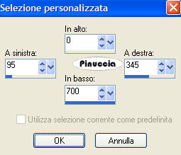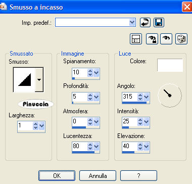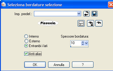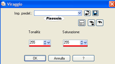 qui puoi trovare qualche risposta ai tuoi dubbi. Se l'argomento che ti interessa non è presente, ti prego di segnalarmelo. Questo tutorial è stato scritto con PSP Corel X2, ma può essere eseguito anche con le precedenti versioni. Per tradurlo, ho usato PSP X. Occorrente: Materiale qui 1. Apri una nuova immagine trasparente 700 x 700 pixels. Scegli due colori dal tuo tube. Imposta un colore rosso come colore di primo piano (il mio #C00000), e il colore verde come colore di sfondo (il mio #008000). 2. Selezione>Seleziona tutto. Apri il file di sfondo "holynight" e vai a Modifica>Copia. Torna al tuo lavoro e vai a Modifica>Incolla nella selezione. Regola>Tonalità e Saturazione>Viraggio: ![]() Selezione>Deseleziona. 3. Livelli>Nuovo livello raster. Attiva lo strumento Selezione ![]() clicca sull'icona Selezione personalizzata ![]() e imposta i seguenti settaggi: ![]() Riempi la selezione con il colore #ffff80.4. Effetti>Effetti di trama>Trama - seleziona una trama a tua scelta con i seguenti settaggi: ![]() Selezione>Deseleziona. 5. Effetti>Effetti 3D>Sfalsa ombra, con i seguenti settaggi: ![]() 6. Livelli>Nuovo livello raster. Selezione personalizzata ![]() ![]() Riempi la selezione con il colore verde di sfondo.Effetti>Effetti di trama>Trama, come al punto 4. Selezione>Deseleziona. Effetti>Effetti 3D>sfalsa ombra, come al punto 5. 7. Apri il tube Schleife, e vai a Modifica>Copia. Torna al tuo lavoro e vai a Modifica>Incolla come nuovo livello. Sposta il tube in basso, come nel mio esempio.Effetti>Effetti 3D>sfalsa ombra, come al punto 5. 8. Apri il tube ArticSpruce_LW e vai a Modifica>Copia. Torna al tuo lavoro e vai a Modifica>Incolla come nuovo livello. Sposta l'albero a sinistra, come nell'esempio.![]() Effetti>Effetti 3D>sfalsa ombra, come al punto 5. 9. Livelli>Nuovo livello raster. Attiva lo strumento Selezione , cerchio,e traccia un cerchio della dimensione di circa 176 x 176 pixels. mentre disegni il cerchio, puoi controllarne la dimensione nella barra inferiore ![]() Riempi con il colore rosso di primo piano.Selezione>Modifica>Contrai - 10 pixels. Riempi con il colore verde di sfondo.Effetti>Effetti di trama>Trama come al punto 4. Selezione>Deseleziona. Effetti>effetti 3D>sfalsa ombra, come al punto 5. 10. Livelli>Duplica, 3 volte per avere in totale quattro livelli. Sposta i quattro livelli come nell'esempio.![]() 11. Livelli>Nuovo livello raster. Selezione personalizzata ![]() ![]() 12. Selezione>Modifica>Seleziona bordature selezione. ![]() Riempi la selezione con il colore #ffffc5.13. Effetti>Effetti 3D>Smusso a incasso. ![]() Selezione>Deseleziona. 14. Attiva lo strumento Bacchetta magica ![]() ![]() Clicca nella cornice per selezionarla. Selezione>Modifica>Espandi - 5 pixels. 15. Livelli>Nuovo livello raster. Riempi con il colore rosso di primo piano.Effetti>effetti di trama>Trama, come al punto 4. Livelli>Disponi>Sposta giù. 16. Mantieni selezionato. Apri il tube del paesaggio "Noel_5_Novembre", e vai a Modifica>copia. Torna al tuo lavoro e vai a Modifica>Incolla come nuovo livello. Posiziona il tube nella cornice.Selezione>inverti. Premi sulla tastiera il tasto CANC. Selezione>Deseleziona. 17. Attiva il livello della cornice. Effetti>effetti 3D>sfalsa ombra, come al punto 5. Livelli>Unisci>Unisci giù, 2 volte. Dovresti avere questo: ![]() 18. Apri il tube del fiore "ccd-0601pointsettia". Immagine>Ridimensiona, al 30%, tutti i livelli non selezionato. Modifica>copia. Torna al tuo lavoro e vai a Modifica>incolla come nuovo livello. 19. Effetti>Effetti 3D>sfalsa ombra, come al punto 5. Livelli>Duplica, 3 volte per avere un totale di 4 livelli. Posiziona i quattro livelli come nell'esempio.![]() 20. Apri il tube del secondo albero "y_jul30", e vai a Modifica>copia. Torna al tuo lavoro e vai a Modifica>Incolla come nuovo livello. Spostalo a destra:![]() Effetti>Effetti 3D>Sfalsa ombra, come al punto 5. 21. Apri il tube di Babbo Natale "Pere Noel" e vai a Modifica>copia. Torna al tuo lavoro e vai a Modifica>Incolla come nuovo livello. Spostalo a sinistra, come nel mio esempio.Effetti>Effetti 3D>Sfalsa ombra, come al punto 5. 22. Attiva lo strumento Testo , scegli un fonte scrivi il tuo testo in alto. Effetti>Effetti 3D>Sfalsa ombra, come al punto 5. 23. Attiva nuovamente lo strumento Testo e scrivi il tuo nome.Effetti>Effetti 3D>sfalsa ombra, come al punto 5. 24. Immagine>Aggiungi bordatura, 5 pixels, simmetriche, con il colore #008000. Immagine>Aggiungi bordatura, 5 pixels, simmetriche, con il colore #C00000. Immagine>Aggiungi bordatura, 5 pixels, simmetriche, con il colore #008000. 25. Selezione>Seleziona tutto. Selezione>Modifica>Contrai - 15 pixels. Selezione>Inverti. Effetti>Effetti 3D>Smusso a incasso, con i seguenti settaggi: ![]() Selezione>Deseleziona. Hai finito. Puoi salvare in formato jpg. Se hai problemi o dubbi, o trovi un link non funzionante, o anche soltanto per un saluto, scrivimi. 24 Novembre 2008 |