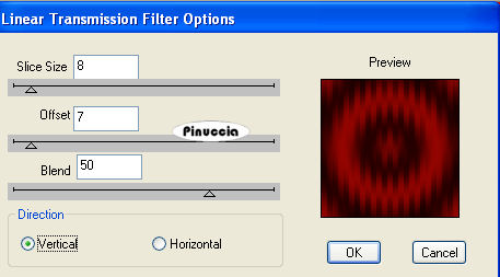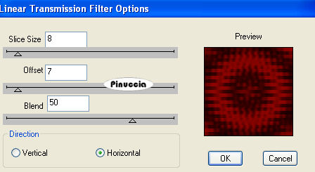 qui puoi trovare qualche risposta ai tuoi dubbi. Se l'argomento che ti interessa non è presente, ti prego di segnalarmelo. Questo tutorial è stato scritto con PSP Corel X2, ma può essere eseguito anche con le precedenti versioni. Per tradurlo, ho usato PSP X. Occorrente: Un tube a scelta. Il resto del materiale qui Il tube che ho usato è di Guismo Filtri. Xero - clarity qui DSB Flux - Linear Transmission qui 1. Apri una nuova immagine trasparente 750 x 750 pixels. Scegli due colori dal tuo tube. Per il mio esempio ho usato il rosso come colore di primo piano e il nero come colore di sfondo. 2. Passa il colore di primo piano a Gradiente, con i seguenti settaggi. ![]() 3. Riempi l'immagine trasparente con il gradiente.Regola>Sfocatura>Sfocatura gaussiana - raggio 35. ![]() 4. Effetti>Plugins>DSB Flux - Linear Transmission. ![]() Ripeti l'Effetto Linear Transmission, selezionando Horizontal. ![]() 5. Effetti>Effetti di bordo>Aumenta. Effetti>Effetti tecniche di disegno - Pennellate: ![]() 6. Livelli>Nuovo livello raster. Attiva lo strumento Selezione ,clicca sull'icona Selezione personalizzata ![]() e imposta i seguenti settaggi: ![]() Riempi la selezione con il colore nero di sfondo.7. Selezione>Modifica>Contrai - 1 pixel. Riempi con il colore rosso di primo piano.Selezione>Modifica>Contrai - 1 pixel. Riempi con il colore nero di sfondo.Selezione>Modifica>Contrai - 1 pixel. Riempi con il gradiente.8. Effetti>Plugins>Xero - clarity, con i settaggi standard. Plugins>DSB Flux - Linear Transmission, come al punto 4.Selezione>Deseleziona. 9. Effetti>Effetti 3D>Sfalsa ombra: ![]() 10. Livelli>Duplica 8 volte, e sposta i quadrati come nell'esempio.![]() Chiudi il livello di sfondo. Livelli>Unisci>Unisci visibile. 11. Livelli>Duplica. Immagine>Rifletti. Immagine>Capovolgi. Riapri il livello di sfondo. 12. Apri il tuo tube accessorio (Flowerartt). Attiva il livello del fiore. Regola>Tonalità e Saturazione>Viraggio. ![]() Chiudi i livelli dello sfondo e del watermark. Modifica>Copia Unione. 13. Torna al tuo lavoro e vai a Modifica>Incolla come nuovo livello. Immagine>Rifletti. Sposta l'immagine nell'angolo in basso a sinistra.14. Apri il secondo tube accessorio e vai a Modifica>Copia. Torna al tuo lavoro e vai a Modifica>Incolla come nuovo livello. Spostalo in alto come nel mio esempio.Effetti>Effetti 3D>sfalsa ombra, come al punto 9. 15. Apri il tuo tube e vai a Modifica>Copia. Torna al tuo lavoro e vai a Modifica>Incolla come nuovo livello. Sposta il tube in basso a destra, come nel mio esempio, o come preferisci.16. Livelli>Duplica e attiva il livello sottostante. Regola>Sfocatura>Sfocatura gaussiana - raggio 10: ![]() 17. Effetti>Effetti di distorsione>Vento - da sinistra, intensità 100. ![]() Effetti>Effetti di distorsione>Vento - da destra, intensità 100. ![]() 18. Attiva lo strumento Testo e scrivi il tuo nome e, se vuoi, aggiungi il tuo watermark.19. Immagine>Aggiungi bordatura, 2 pixels, simmetriche, con il colore rosso. Immagine>Aggiungi bordatura, 10 pixels, simmetriche, con il colore nero. Immagine>Aggiungi bordatura, 2 pixels, simmetriche, con il colore rosso. Hai finito. Puoi salvare in formato jpg. Se hai problemi o dubbi, o trovi un link non funzionante, o anche soltanto per un saluto, scrivimi. 17 Agosto 2009 |