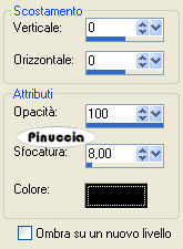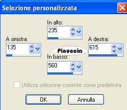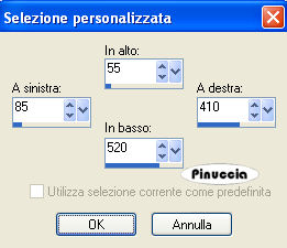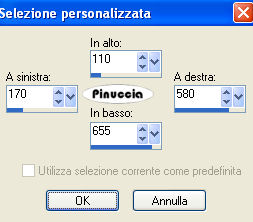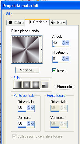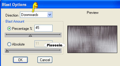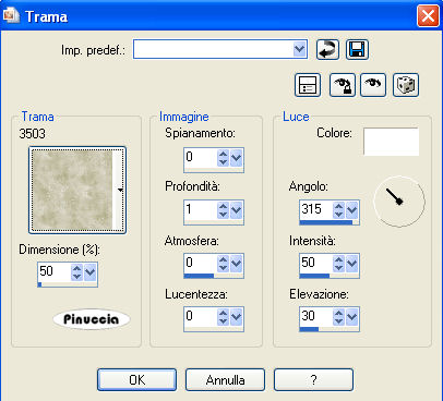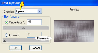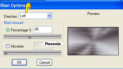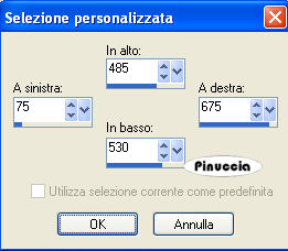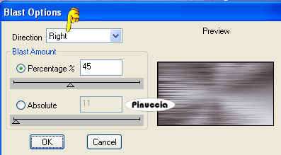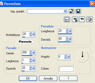 qui puoi trovare qualche risposta ai tuoi dubbi. Se l'argomento che ti interessa non è presente, ti prego di segnalarmelo. Questo tutorial è stato scritto con PSP Corel X2, ma può essere eseguito anche con le precedenti versioni. Per tradurlo, ho usato PSP X. Occorrente: Un tube a scelta. Il resto del materiale qui Il tube che ho usato è di Outlawbydesign Filtri. Penta.com - Color dot qui DSB Flux - Blast qui 1. Apri il file di sfondo "hin-rom". Questo file - che ha la corretta dimesnione 750 x 750 pixels - sarà la base del tuo lavoro. Scegli due colori dal tuo tube. Imposta il colore di primo piano con il colore chiaro (il mio #413339), e il colore di sfondo con il colore scuro (il mio #DCDFE3). 2. Passa il colore di primo piano a Gradiente di primo piano/sfondo, con i seguenti settaggi. ![]() 3. Livelli>Nuovo livello raster. Attiva lo strumento Selezione ![]() clicca sull'icona selezione personalizzata ![]() e imposta i seguenti settaggi: ![]() Riempi la selezione con il colore scuro di primo piano.4. Selezione>Modifica>Contrai - 10 pixels. Riempi la selezione con il gradiente.Regola>Sfocatura>Sfocatura gaussiana - raggio 20. ![]() 5. Effetti>Plugins>Dsb Flux - Blast: ![]() Ripeti l'Effetto Blast - direction Right: ![]() 6. Ripeti nuovamente l'Effetto Blast - direction Upwards. ![]() e per finire ripeti l'Effetto Blast - direction Downwards. ![]() 7. Effetti>Effetti 3D>sfalsa ombra: ![]() Selezione>Deseleziona. Ripeti l'Effetto Sfalsa ombra, con gli stessi settaggi. 8. Livelli>Nuovo livello raster. Selezione personalizzata ![]() con i seguenti settaggi: ![]() Riempi la selezione con il colore scuro di primo piano.9. Selezione>Modifica>Contrai - 10 pixels. Riempi con il gradiente.Regola>Sfocatura>Sfocatura gaussiana - raggio 20. 10. Effetti>Effetti tecniche di disegno>Pennellate: ![]() Effetti>Effetti 3D>sfalsa ombra, come al punto 7. 11. Immagine>Ruota per gradi - 15 gradi a sinistra: ![]() Livelli>Duplica. Immagine>Rifletti. 12. Dovresti avere questo: ![]() 13. Livelli>Nuovo livello raster. Selezione personalizzata ![]() con i seguenti settaggi: ![]() Riempi la selezione con il colore scuro di primo piano.14. Selezione>Modifica>Contrai - 10 pixels. Riempi con il gradiente.Regola>Sfocatura>Sfocatura gaussiana - raggio 20. Effetti>Plugins>Penta.com- Color Dot: ![]() Effetti>Effetti 3D>Sfalsa ombra, come al punto 7. 15. Livelli>Nuovo livello raster. Selezione personalizzata ![]() con i seguenti settaggi: ![]() Riempi la selezione con il colore chiaro di sfondo.16. Selezione>Modifica>Contrai - 10 pixels. Riempi con il colore scuro di primo piano.Effetti>Effetti 3D>Sfalsa ombra, come al punto 7, ma una sola volta. 17. Selezione>Modifica>Contrai - 3 pixels. Riempi con il colore chiaro di primo piano.Effetti>Effetti di trama>Trama - seleziona una trama a tua scelta, con i seguenti settaggi: ![]() Selezione>Deseleziona. Effetti>Effetti 3D>sfalsa ombra, come al punto 7, ma una sola volta. 18. Livelli>Nuovo livello raster. Selezione personalizzata ![]() con i seguenti settaggi: ![]() Riempi la selezione con il colore scuro di primo piano.19. Selezione>Modifica>Contrai - 5 pixels. Riempi con il colore chiaro di primo piano.Selezione>Modifica>Contrai - 1 pixel. Riempi con il colore scuro di sfondo.Selezione>Deseleziona. Effetti>Effetti 3D>Sfalsa ombra, come al punto 7, una sola volta. 20. Apri il tuo tube e vai a Modifica>Copia. Torna al tuo lavoro e vai a Modifica>Incolla come nuovo livello. Posiziona il tube sulla piccola barra.Effetti>Effetti 3D>Sfalsa ombra: ![]() 21. Apri il tube del fiore (flower7) e vai a Modifica>copia. Torna al tuo lavoro e vai a Modifica>Incolla come nuovo livello. Immagine>Ridimensiona, al 65%, tutti i livelli non selezionato. Regola>Tonalità e saturazione>Viraggio: Effetti>Effetti 3D>Sfalsa ombra, come al punto 7. Posiziona il fiore come ti sembra meglio.Apri il tube del secondo fiore (flower8) e vai a Modifica>copia. Torna al tuo lavoro e vai a Modifica>Incolla come nuovo livello. Ridimensionalo a tuo piacimento e posizionalo accanto all'altro fiore. Effetti>Effetti 3D>sfalsa ombra, con i settaggi precedenti. Apri il tube del terzo fiore (flower4) e vai a Modifica>copia. Torna al tuo lavoro e vai a ModificaI>Incolla come nuovo livello. Regola>Tonalità e Saturazione>Viraggio, con i settaggi precedenti. Spostalo a destra.Effetti>Effetti 3D>sfalsa ombra, con i settaggi precedenti. 22. Attiva lo strumento Testo e scrivi il tuo nome e/o un testo.Se vuoi, aggiungi il tuo watermark. Effetti>Effetti 3D>Sfalsa ombra, a tua scelta. 23. Immagine>Aggiungi bordatura, 1 pixel, simmetriche, con il colore #DCDFE3. Immagine>Aggiungi bordatura, 2 pixels, simmetriche, con il colore #413339. Immagine>Aggiungi bordatura, 3 pixels, simmetriche, con il colore #DCDFE3. Immagine>Aggiungi bordatura, 5 pixels, simmetriche, con il colore #413339. Immagine>Aggiungi bordatura, 1 pixel, simmetriche, con il colore #DCDFE3. Immagine>Aggiungi bordatura, 10 pixels, simmetriche, con il colore #413339. Immagine>Aggiungi bordatura, 2 pixels, simmetriche, con il colore #DCDFE3. Hai finito. Puoi salvare in formato jpg. Se hai problemi o dubbi, o trovi un link non funzionante, o anche soltanto per un saluto, scrivimi. 30 Giugno 2009 |
