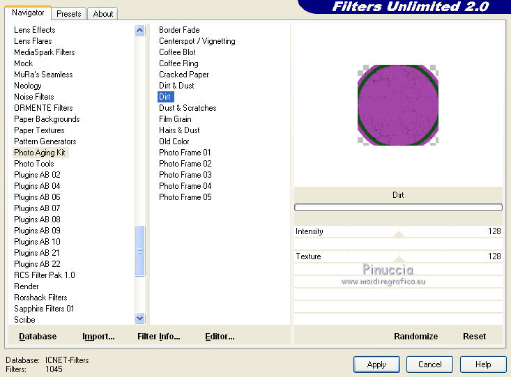 Effetti>Plugins>Filters Unlimited 2.0 - Photo Aging Kit - Dirt, con i settaggi standard.