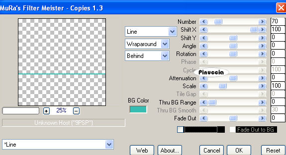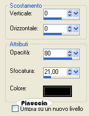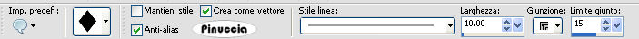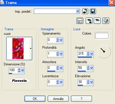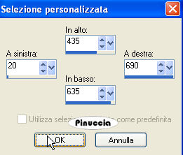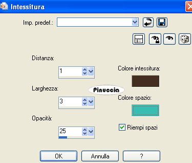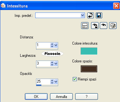 qui puoi trovare qualche risposta ai tuoi dubbi. Se l'argomento che ti interessa non è presente, ti prego di segnalarmelo. Questo tutorial è stato scritto con PSP Corel X2, ma può essere eseguito anche con le precedenti versioni. Per tradurlo, ho usato PSP X. Occorrente: Un tube a scelta. Il resto del materiale qui Il tube usato è ©Fygomatic Filtri. Penta.com - Color dot qui Mura's Meister - Copies qui Graphics Plus - Cross Shadow qui ![]() Metti Div1 nella cartella Forme predefinite, e apri il resto del materiale in PSP, compresa la maschera. 1. Apri una nuova immagine trasparente 700 x 700 pixels. Scegli due colori dai tuoi tubes. Per il mio esempio ho usato come colore di primo piano il colore scuro #452e20, e come colore di sfondo il colore chiaro #37bdb2. 2. Riempi l'immagine trasparente con il colore di primo piano.Livelli>Nuovo livello raster. Riempi con il colore di sfondo.3. Effetti>Effetti di trama>Trama - seleziona una trama a scelta con i seguenti settaggi. ![]() 4. Livelli>Nuovo livello maschera>Da immagine. Apri il menu sotto la finestra di origine e vedrai la lista dei files aperti. Tra questi la maschera. Seleziona la maschera Becky_Mask022 con i seguenti settaggi: ![]() Livelli>Elimina e rispondi sì alla domanda Unire la maschera nel livello corrente. ![]() Livelli>Unisci>Unisci gruppo. 5. Attiva lo strumento Forme predefinite ,e seleziona la forma "div1rom" con i seguenti settaggi. ![]() Mantieni i colori di primo piano e sfondo come impostati all'inizio del tutorial. Partendo dall'angolo in alto a sinistra: ![]() Traccia una forma della dimensione di circa 518 x 670 pixels: mentre disegni la forma puoi controllare la dimensione nella barra inferiore ![]() E avrai questo. ![]() 7. Livelli>Converti in livello raster. Attiva lo strumento Bacchetta magica ,sfumatura e tolleranza 0,e clicca al centro della forma per selezionarla. Effetti>Plugins>Penta.com - Color dot: ![]() Selezione>Deseleziona. Sposta la forma al centro dell'immagine.8. Effetti>Effetti 3D>sfalsa ombra. ![]() 9. Livelli>Nuovo livello raster. Attiva lo strumento Selezione ,clicca sull'icona Selezione personalizzata ![]() e imposta i seguenti settaggi: ![]() Riempi la selezione con il colore di primo piano.Effetti>Effetti 3D>Sfalsa ombra, con i settaggi precedenti. Selezione>Deseleziona. 10. Attiva nuovamente lo strumento Forme predefinite ![]() chiudi il colore di primo piano, e traccia una forma di circa 11 x 16 pixels. ![]() Livelli>Converti in livello raster. 11. Sposta la piccola forma nell'angolo in alto a sinistra del rettangolo marrone.![]() Effetti>Plugins>Mura's Meister - Copies: ![]() Cancella a destra e a sinistra, le diagonali rimaste all'esterno del rettangolo (vedi il mio esempio).12. Livelli>Duplica. Sposta la seconda riga in basso.![]() 13. Di nuovo Forme predefinite con gli stessi settaggi.Passa il colore chiaro a colore di primo piano e il colore scuro a colore di sfondo. Traccia una forma nell'angolo in alto a sinistra della dimensione di 268 x 435. ![]() 14. Livelli>Converti in livello raster. Clicca con la bacchetta magica , stessi settaggi, al centro della forma per selezionarla.Effetti>Effetti di trama>Intessitura. ![]() Selezione>Deseleziona. 15. Effetti>Effetti 3D>Sfalsa ombra, come al punto 8. Livelli>Duplica, e posiziona la forma come nell'esempio.![]() 16. Inverti nuovamente i colori nella paletta dei materiali. Attiva ancora lo strumento Forme predefinite con gli stessi settaggi,e traccia una nuova forma della dimensione 268 x 435. ![]() 17. Livelli>Converti in livello raster. Clicca con la bacchetta magica al centro della forma.Effetti>Effetti di trama>Intessitura: inverti i colori: chiaro colore intessitura; scuro colore spazi ![]() Mantieni selezionato. 18. Apri il tube dell'uomo e vai a Modifica>Copia. Torna al tuo lavoro e vai a Modifica>Incolla come nuovo livello. Posiziona il tube nell'area selezionata.Selezione>Inverti. Premi sulla tastiera il tasto CANC. Selezione>Deseleziona. 19. Livelli>Unisci>Unisci giù. Effetti>Effetti 3D>Sfalsa ombra, come al punto 8. Sposta la forma come nell'esempio:![]() 20. Apri il tuo tube e vai a Modifica>Copia. Torna al tuo lavoro e vai a Modifica>Incolla come nuovo livello. Immagine>Ridimensiona, se e quanto necessario. Sposta il tube a destra.Effetti>Effetti 3D>Sfalsa ombra. ![]() 21. Attiva lo strumento Testo , scegli un font e scrivi un testo sull'immagine,o il tuo nome e/o il tuo watermark. Effetti>Effetti 3D>Sfalsa ombra, con un settaggio a tua scelta. 22. Immagine>Aggiungi bordatura, 1 pixel, simmetriche, con il colore scuro #452e20. Immagine>Aggiungi bordatura, 1 pixel, simmetriche, con il colore chiaro #37bdb2. Immagine>Aggiungi bordatura, 1 pixel, simmetriche, con il colore scuro #452e20. 23.Immagine>Aggiungi bordatura, 25 pixels, simmetriche, con il colore chiaro #37bdb2. Seleziona questo bordo con la bacchetta magica , sfumatura e tolleranza 0.Effetti>Plugins>Graphics Plus - Cross Shadow, con i settaggi standard. ![]() 24. Immagine>Aggiungi bordatura, 1 pixel, simmetriche, con il colore scuro #452e20. Immagine>Aggiungi bordatura, 1 pixel, simmetriche, con il colore chiaro #37bdb2. Immagine>Aggiungi bordatura, 1 pixel, simmetriche, con il colore scuro #452e20. Hai finito. Puoi salvare in formato jpg. I tubes usati per questo esempio sono ©Fygomatic e Matteo ![]() ![]() Se hai problemi o dubbi, o trovi un link non funzionante, o anche soltanto per un saluto, scrivimi. 23 Gennaio 2010 |